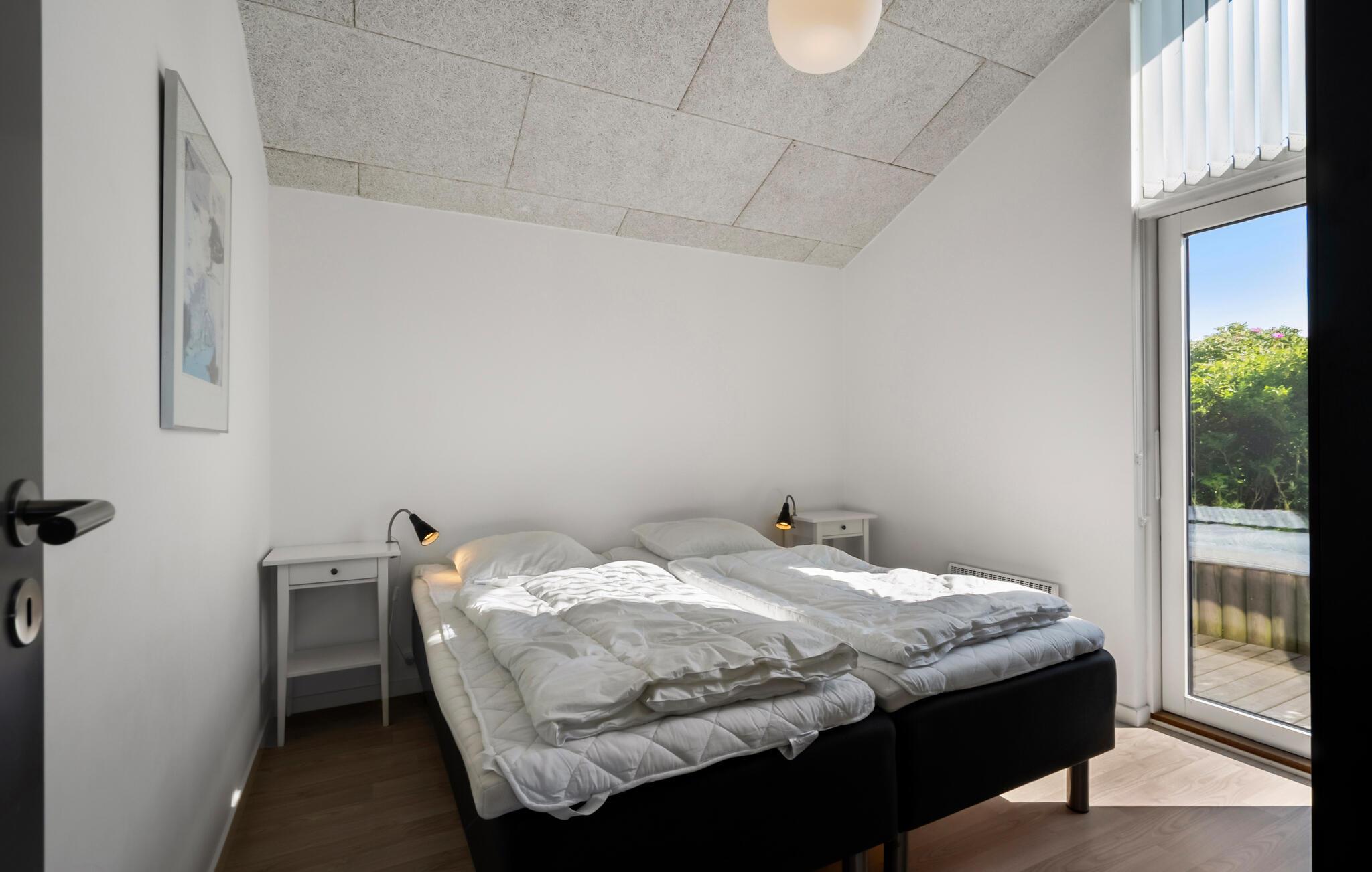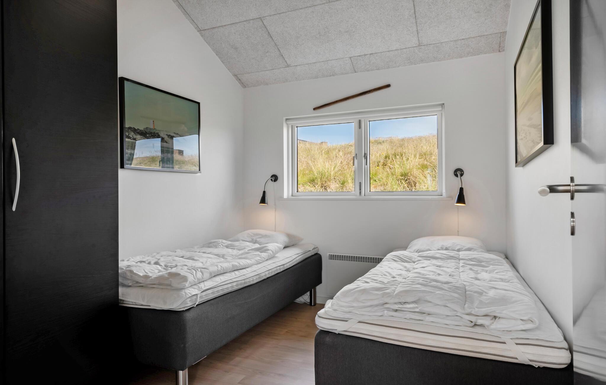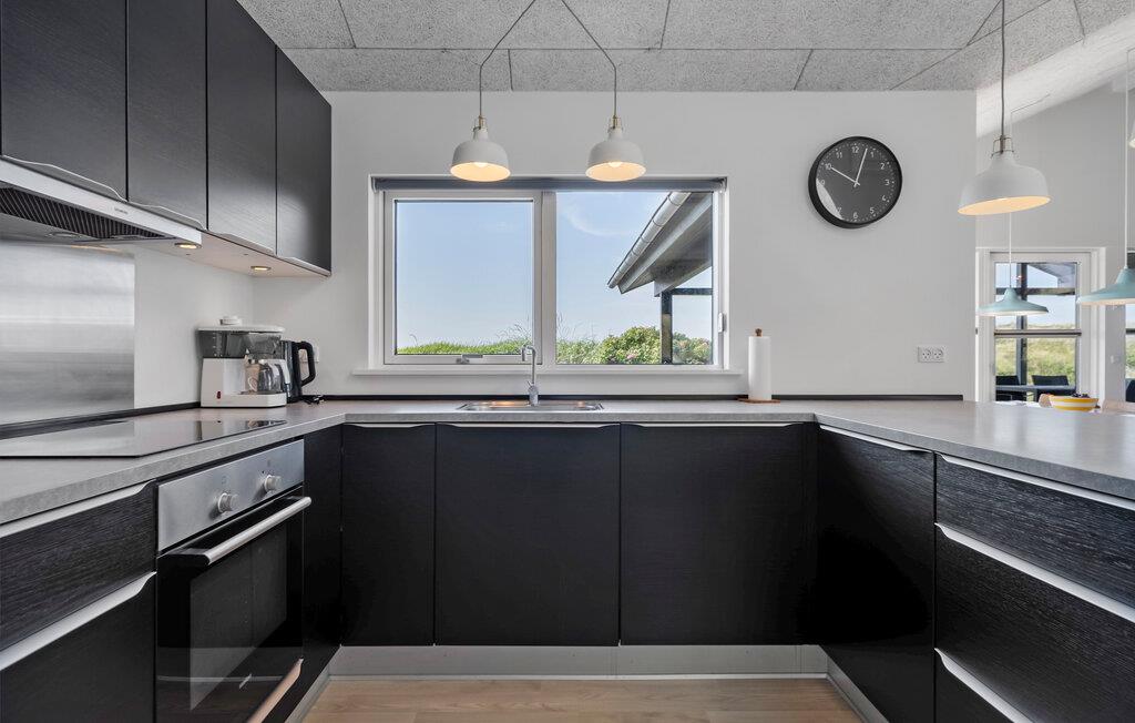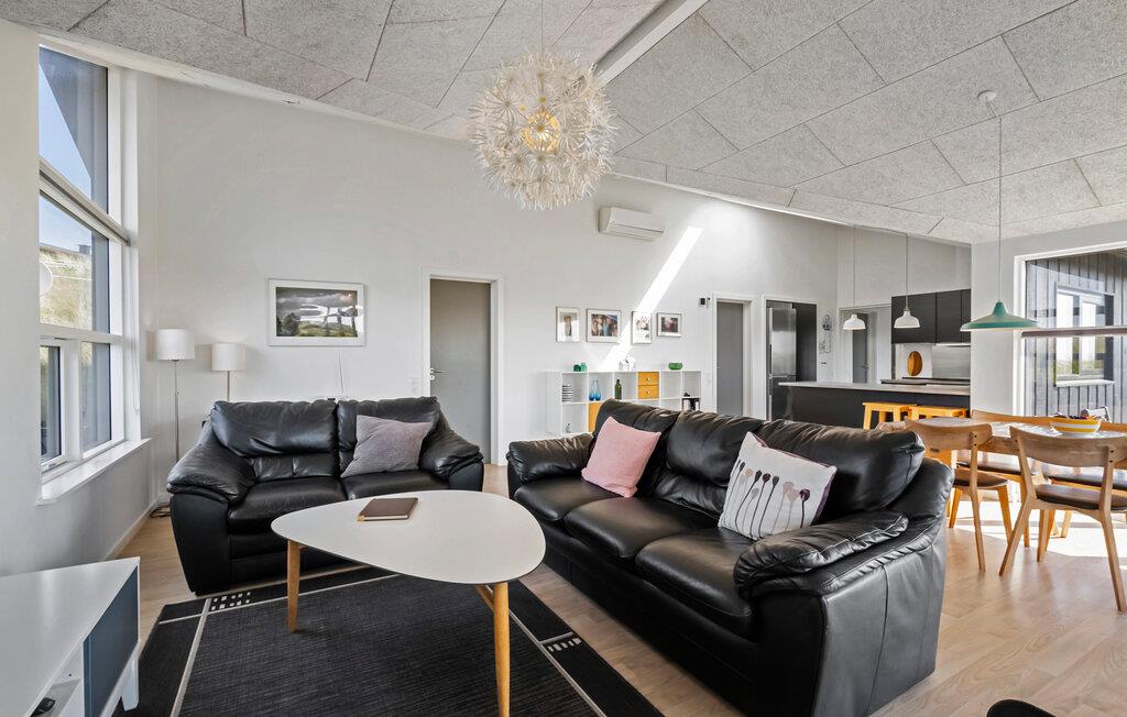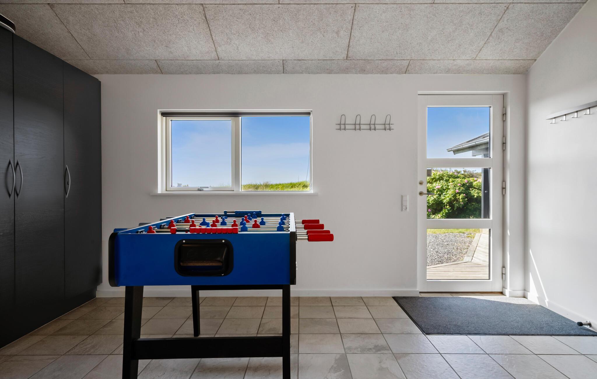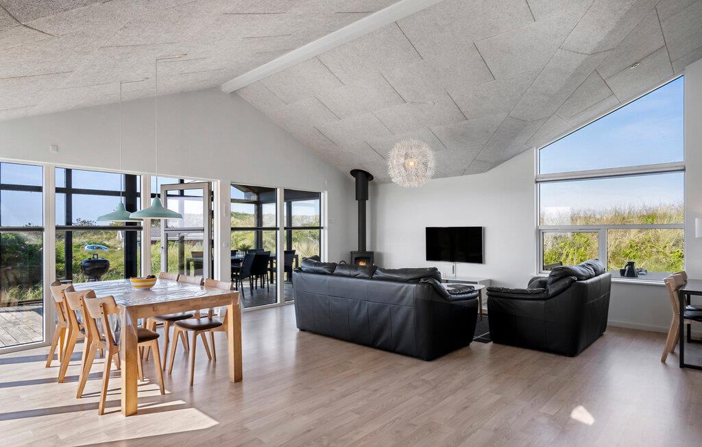Nyd jeres ophold i jeres feriehus, som takket være sin førsteklasses beliggenhed blandt klitterne giver jer uhindret udsigt helt til Vesterhavet. De moderne møbler og det lyse, åbne interiørdesign skaber en indbydende atmosfære til både afslappende og aktive ferier. Find jer til rette i den rummelige opholdsstue med brændeovn. Nyd klitterne gennem de store vinduer, læn jer tilbage i sofaen eller slap af med en god bog. Den tilstødende spiseplads giver jer plads til hyggelige måltider med udsigt over landskabet. Tilbered måltiderne i en afslappet atmosfære i det åbne køkken. Aktivitetsrummet med bordfodboldbord giver et afvekslingsrigt tempo, mens saunaen er et godt sted til en afslappende stund.