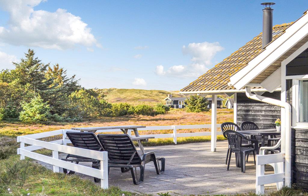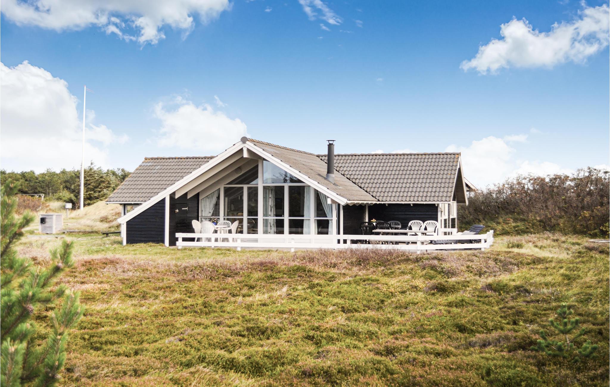 Flot træhus med udsigt til klitter, stor terrasse og moderne faciliteter nær Hvide Sande.