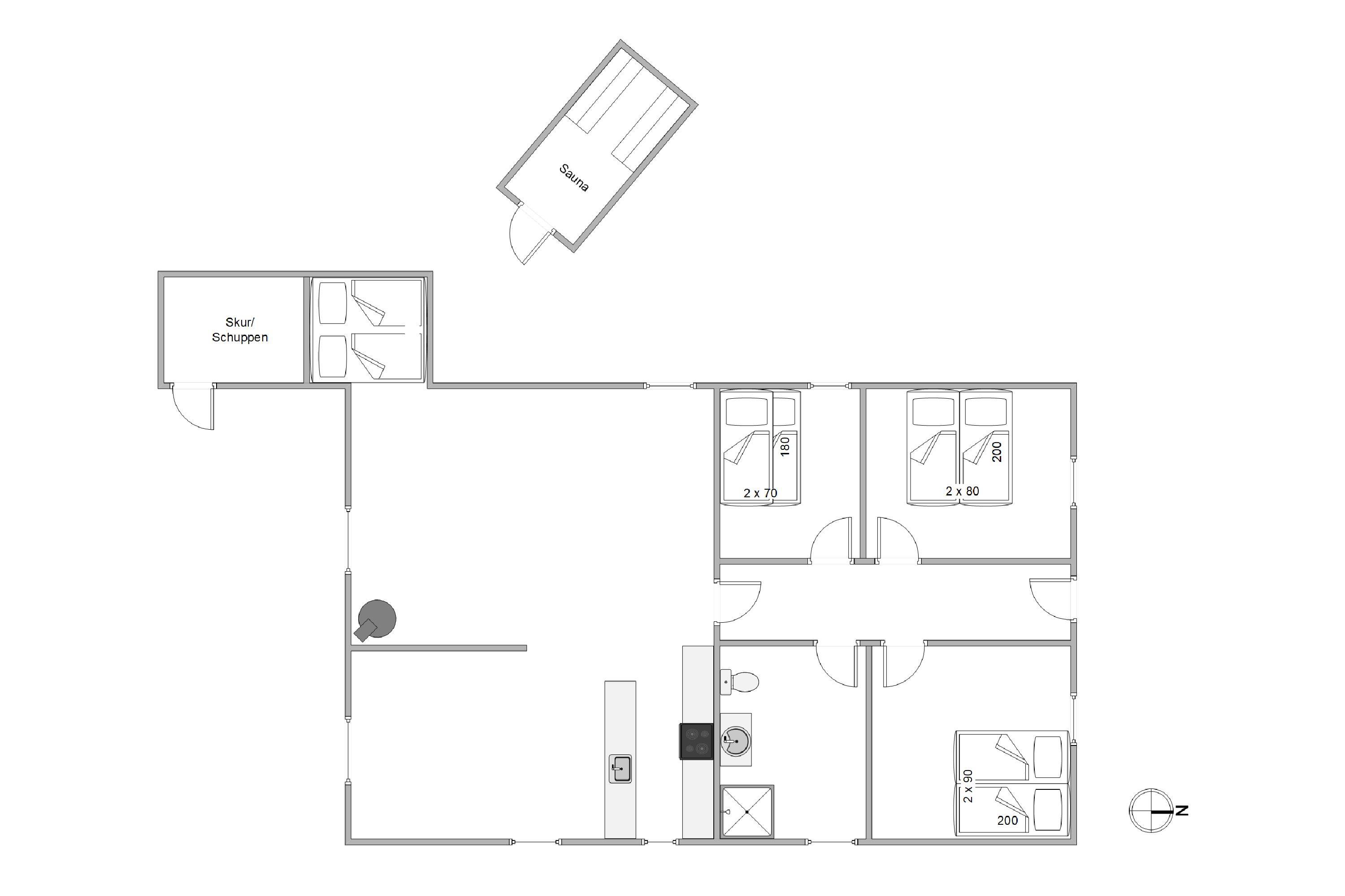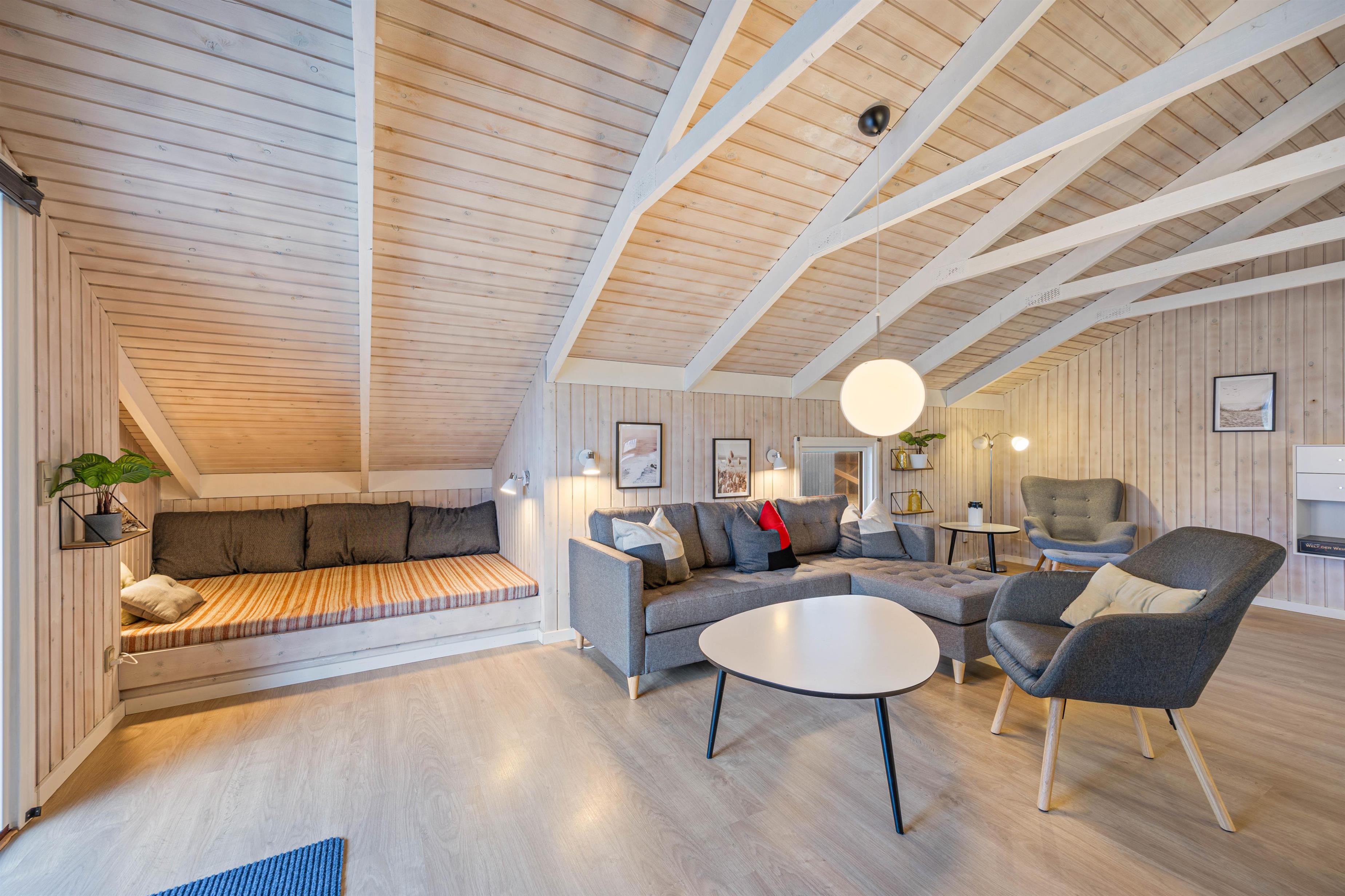 Sommerhusets hjerte er det åbne opholdsrum, hvor køkken, spiseafdeling og stue er slået sammen til ét stort fællesrum. Der er lagt op til masser af hyggelige stunder med fælles madlavning, gode måltider og afslapning i sofahjørnet til lyden af brændeovnens knitrende ild. Alkoven er det perfekte spot til en middagslur eller en stille læse-session med en god bog.