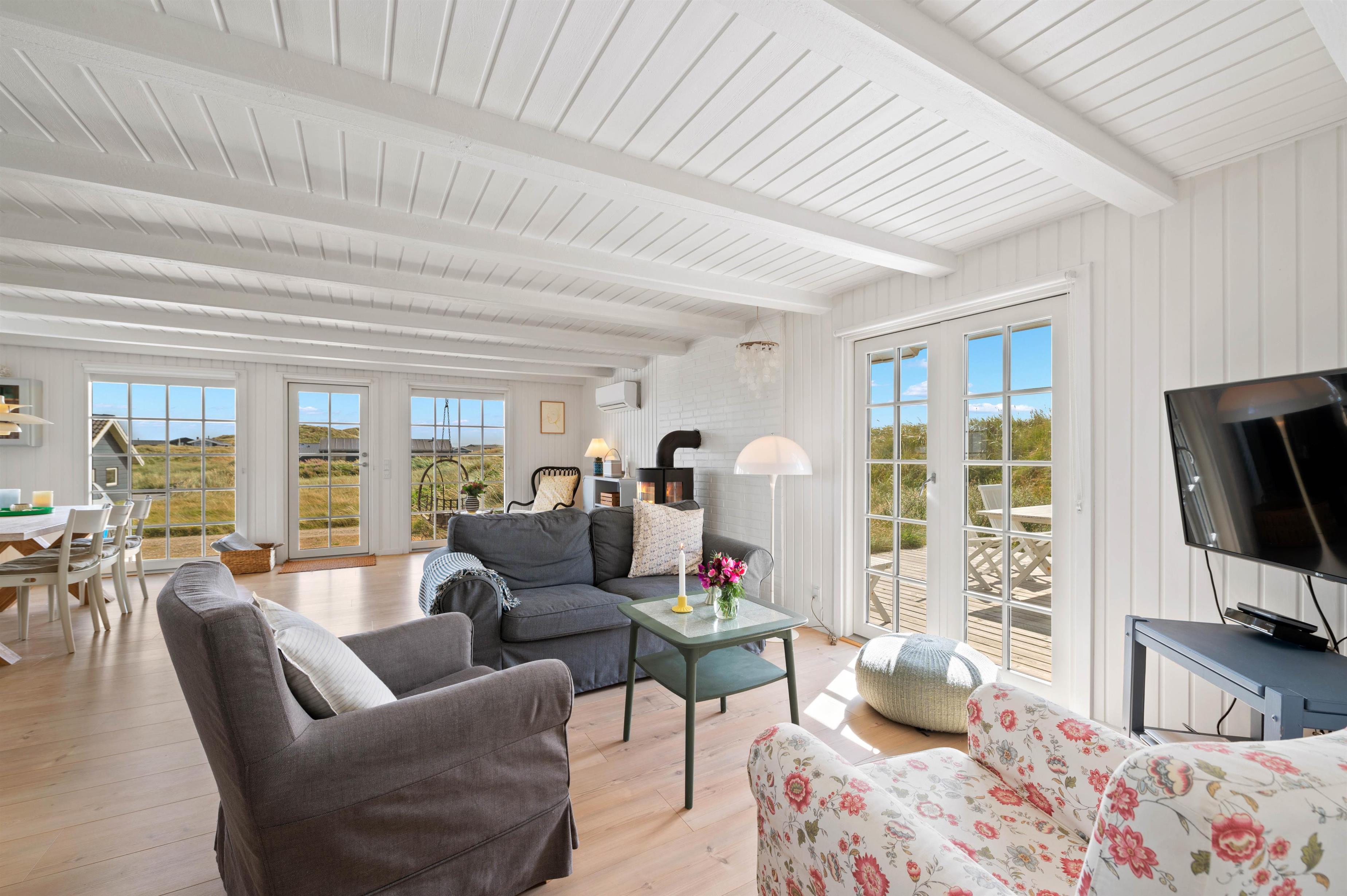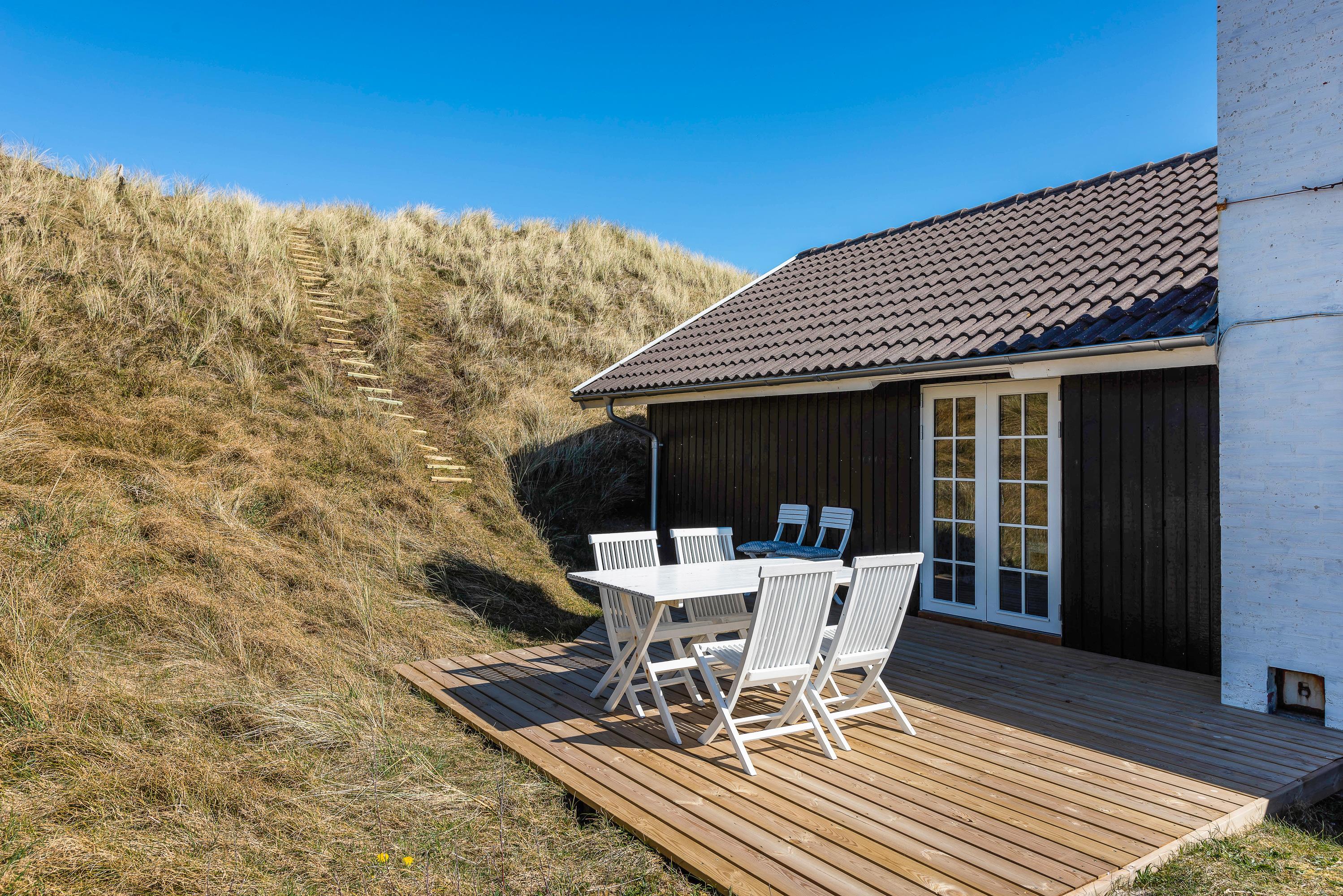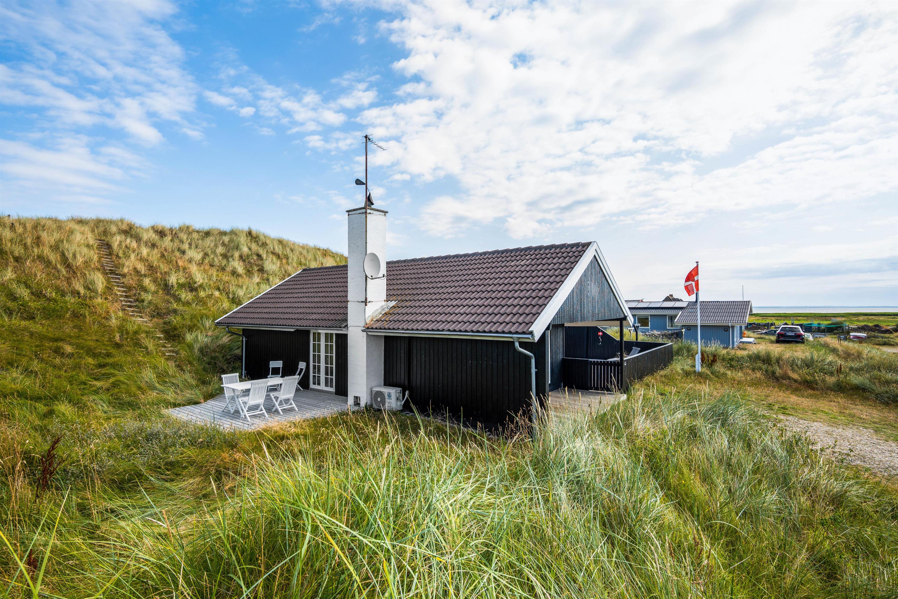 Det hyggelige sommerhus har en helt fantastisk beliggenhed på en forhøjning i klitlandskabet, og rundt om huset går en stor, lækker træterrasse, som giver jer rig mulighed for at slappe af i solen og nyde den fantastiske panoramaudsigt hele vejen til fjorden.