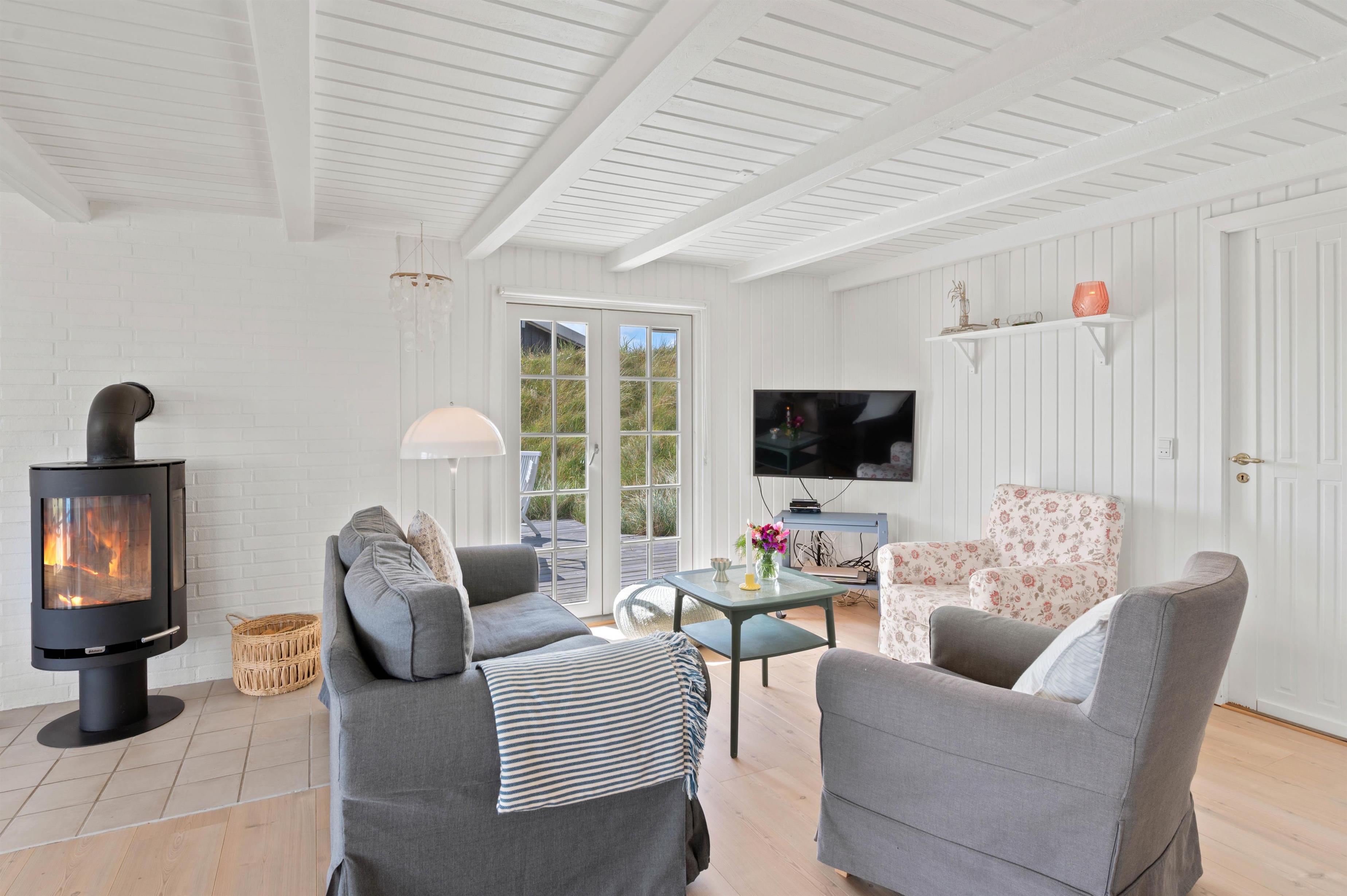 Sommerhusets hjerte er det åbne opholdsrum, hvor stue og køkken er slået sammen. Der er masser af små kroge, hvor I kan nyde feriefreden med en god bog og en varm kop kaffe, og den klassiske brændeovn sørger for at sprede hyggelig feriestemning med sine knitrende flammer.