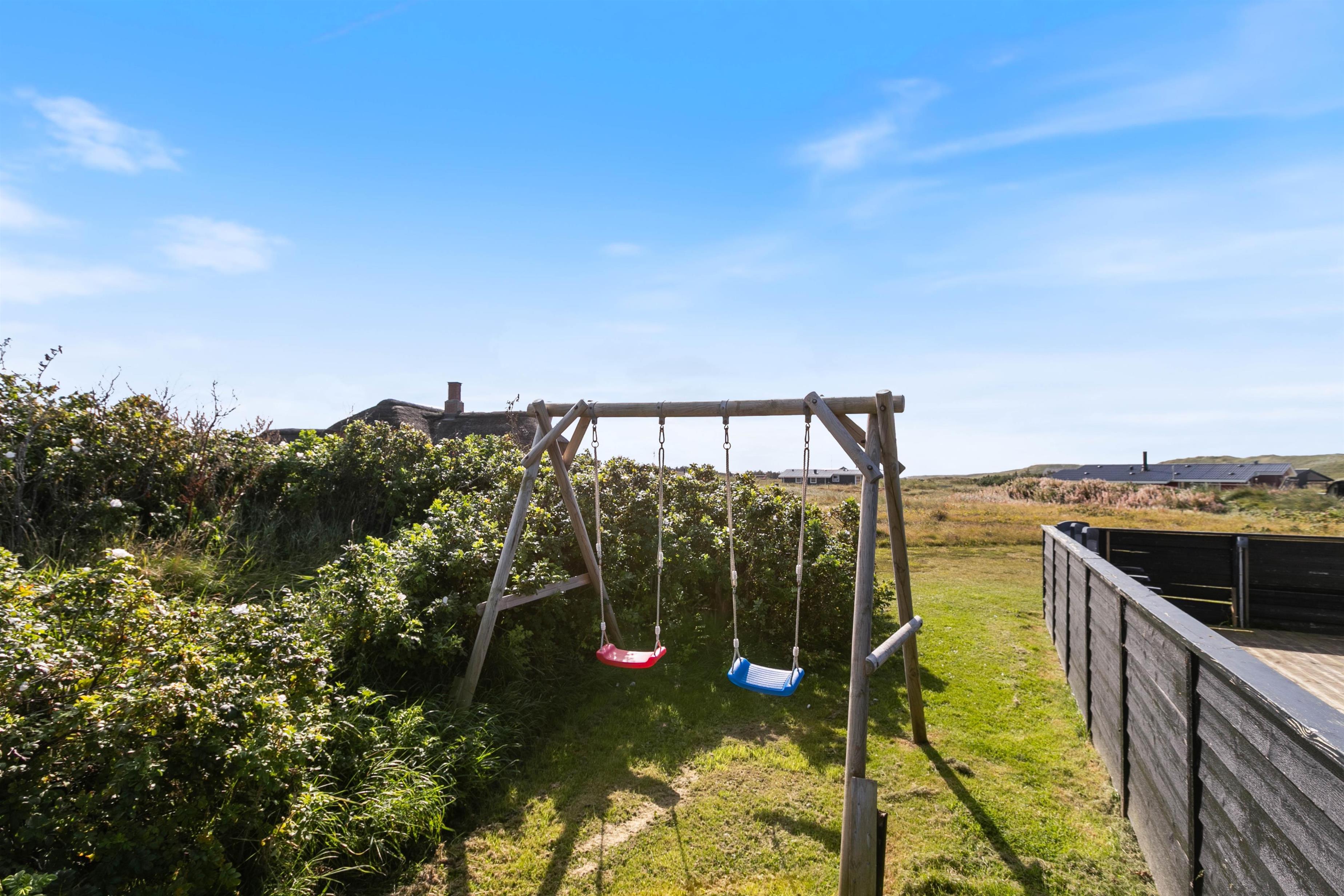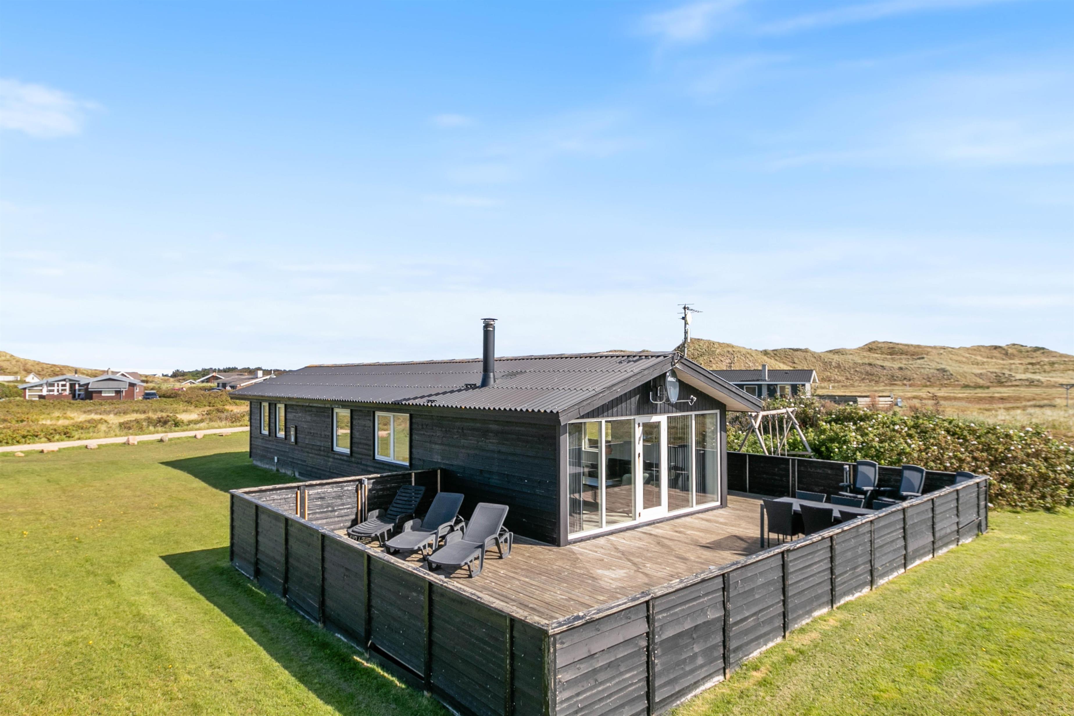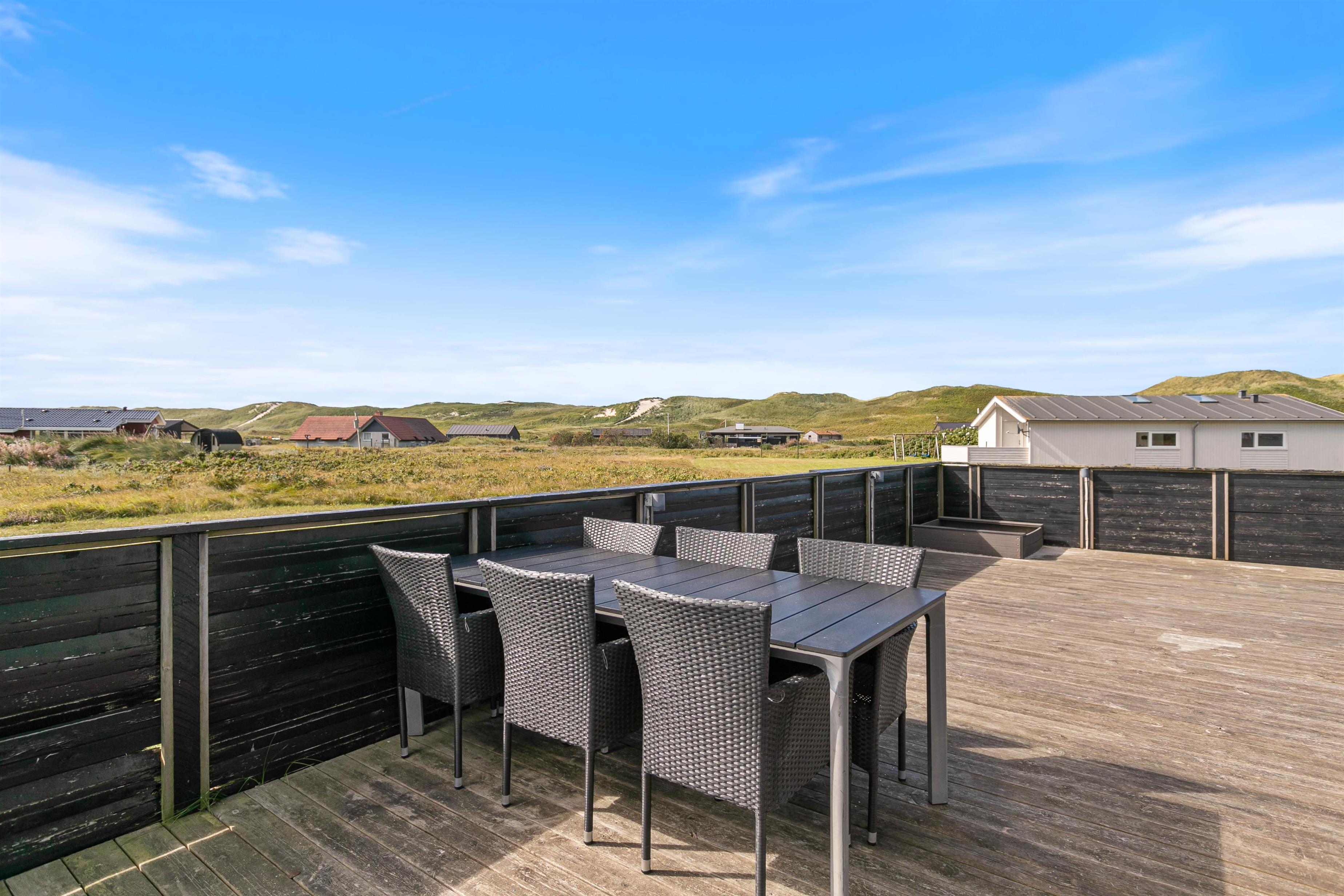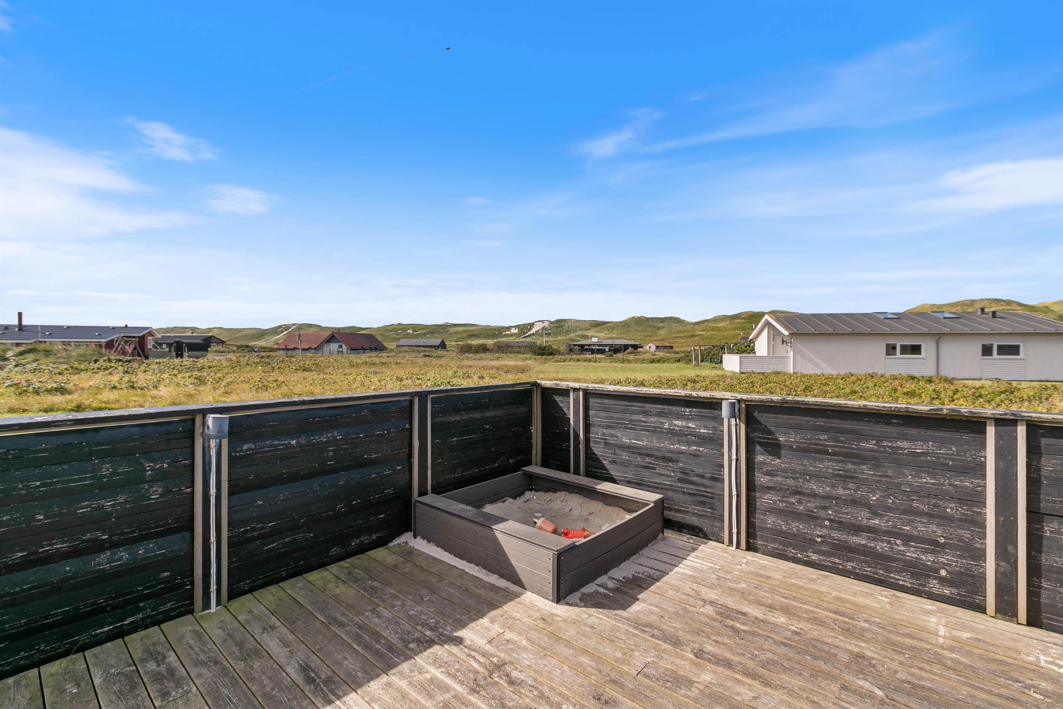 Lækker, stor terrasse, som er lukket. Fra terrassen har du en dejlig udsigt over det flotte klitlandskab. Til børnefamilien har udearealet meget at byde på. Til huset hører nemlig en dejlig, stor græsplæne, der er helt perfekt til leg og boldspil. Derudover er der både sandkasse og gynge til familiens mindste. Ønsker I at tage på tur, så ligger Hvide Sande bare nogle få kilometer fra huset. Her er der spændende og sjove aktiviteter for hele familien.