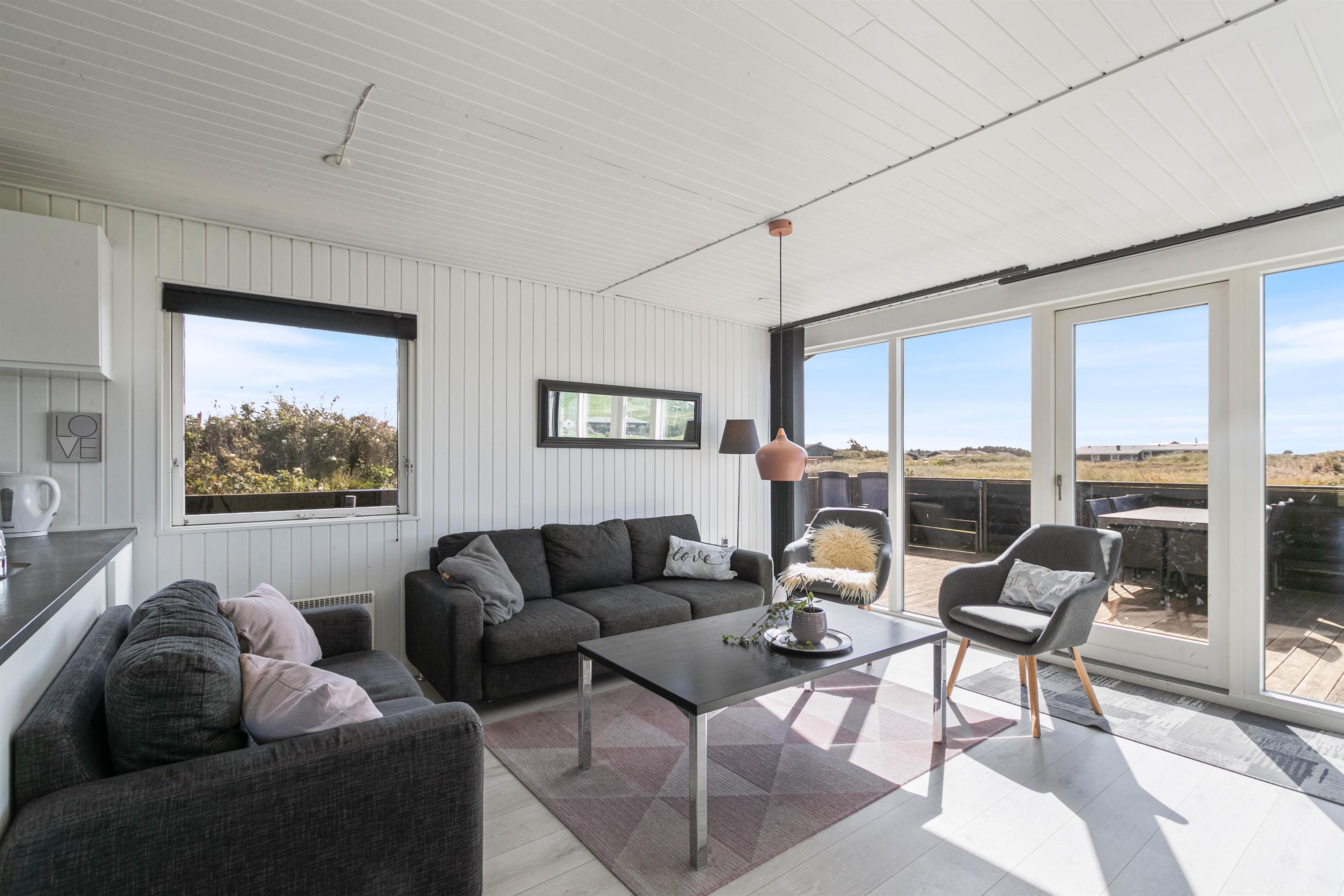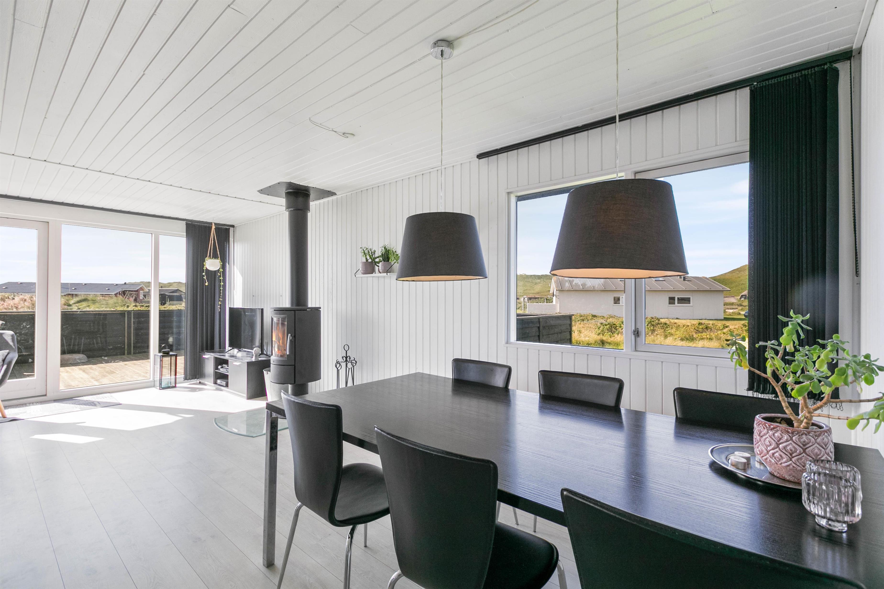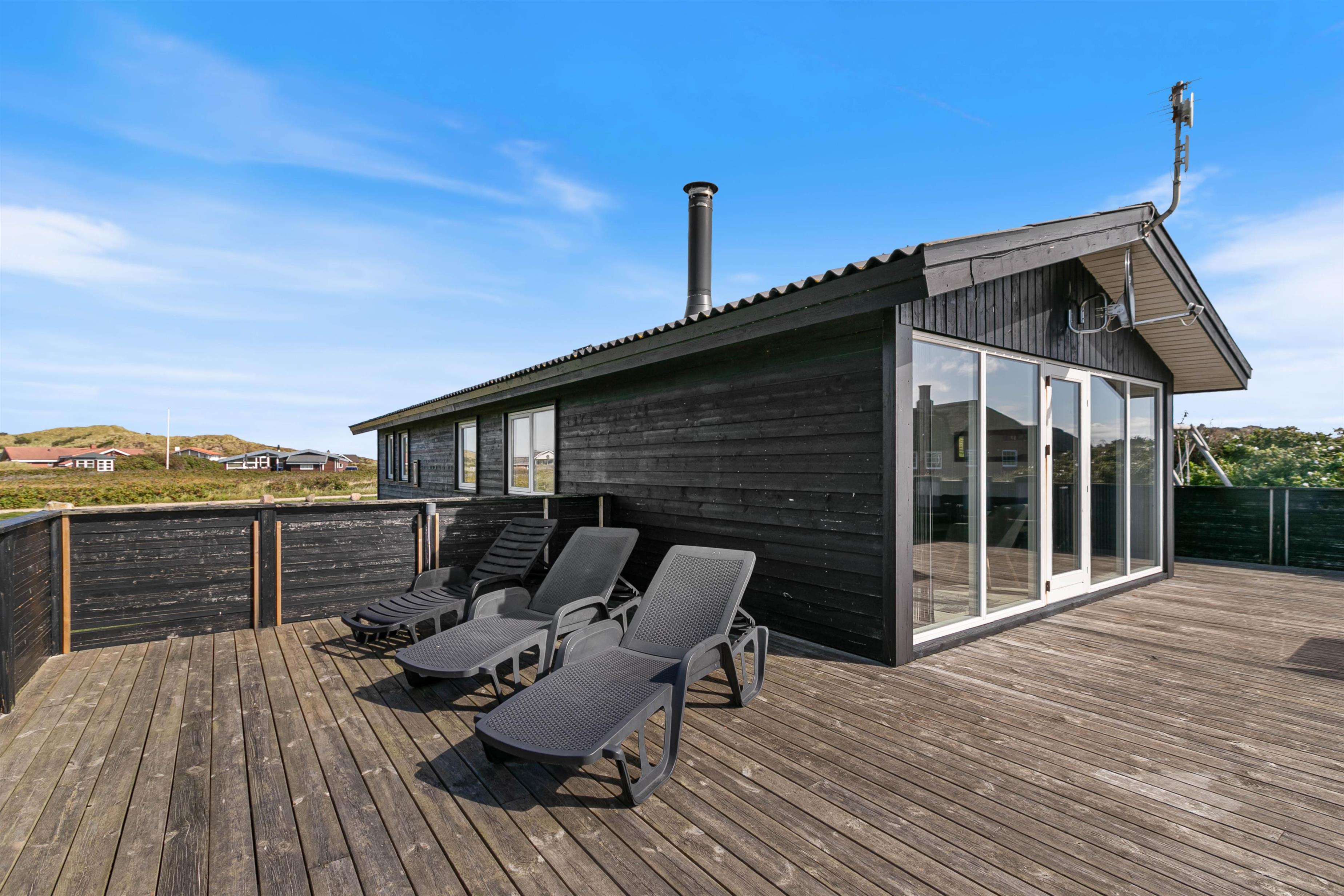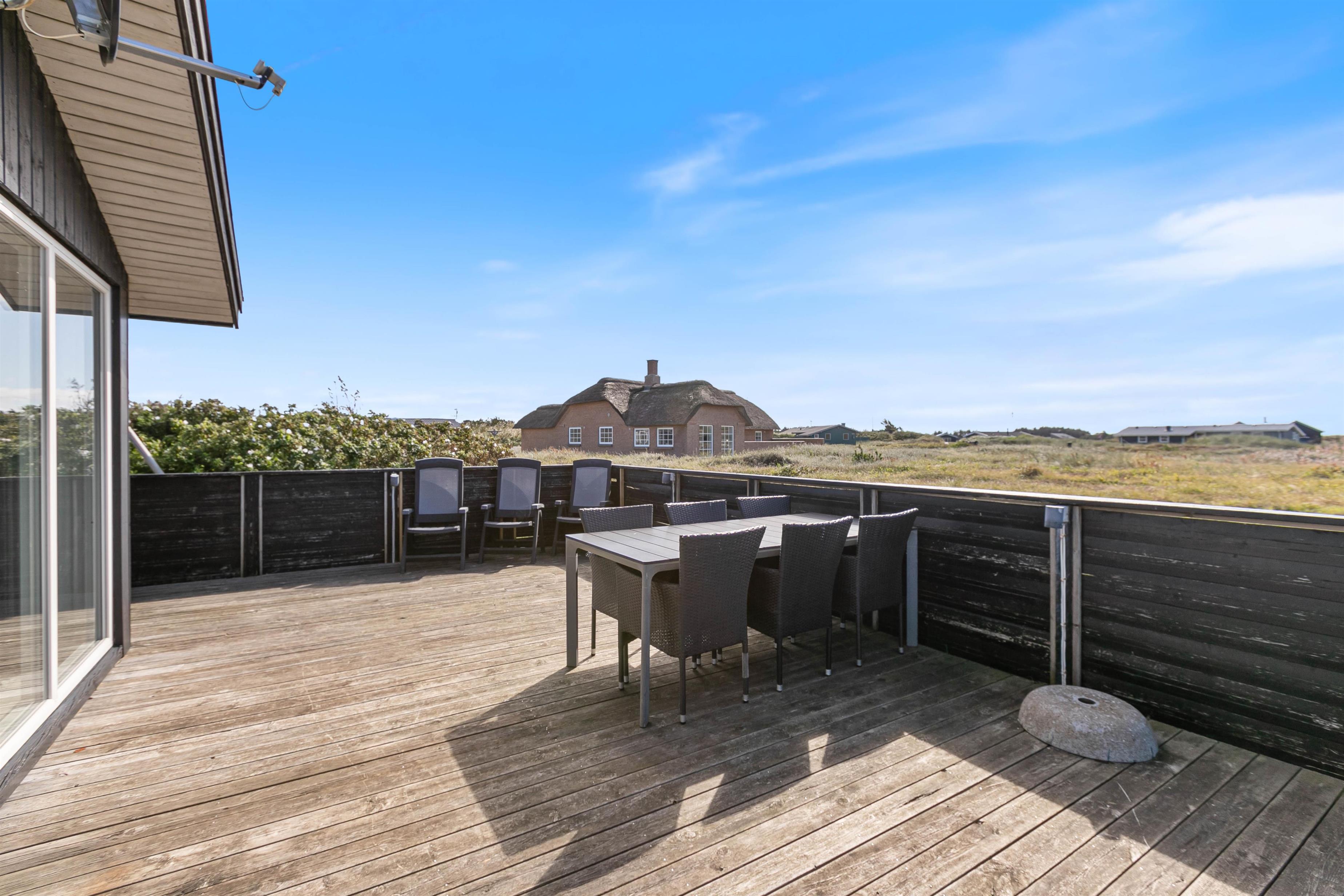 Lækker, stor terrasse, som er lukket. Fra terrassen har du en dejlig udsigt over det flotte klitlandskab. Til børnefamilien har udearealet meget at byde på. Til huset hører nemlig en dejlig, stor græsplæne, der er helt perfekt til leg og boldspil. Derudover er der både sandkasse og gynge til familiens mindste. Ønsker I at tage på tur, så ligger Hvide Sande bare nogle få kilometer fra huset. Her er der spændende og sjove aktiviteter for hele familien.