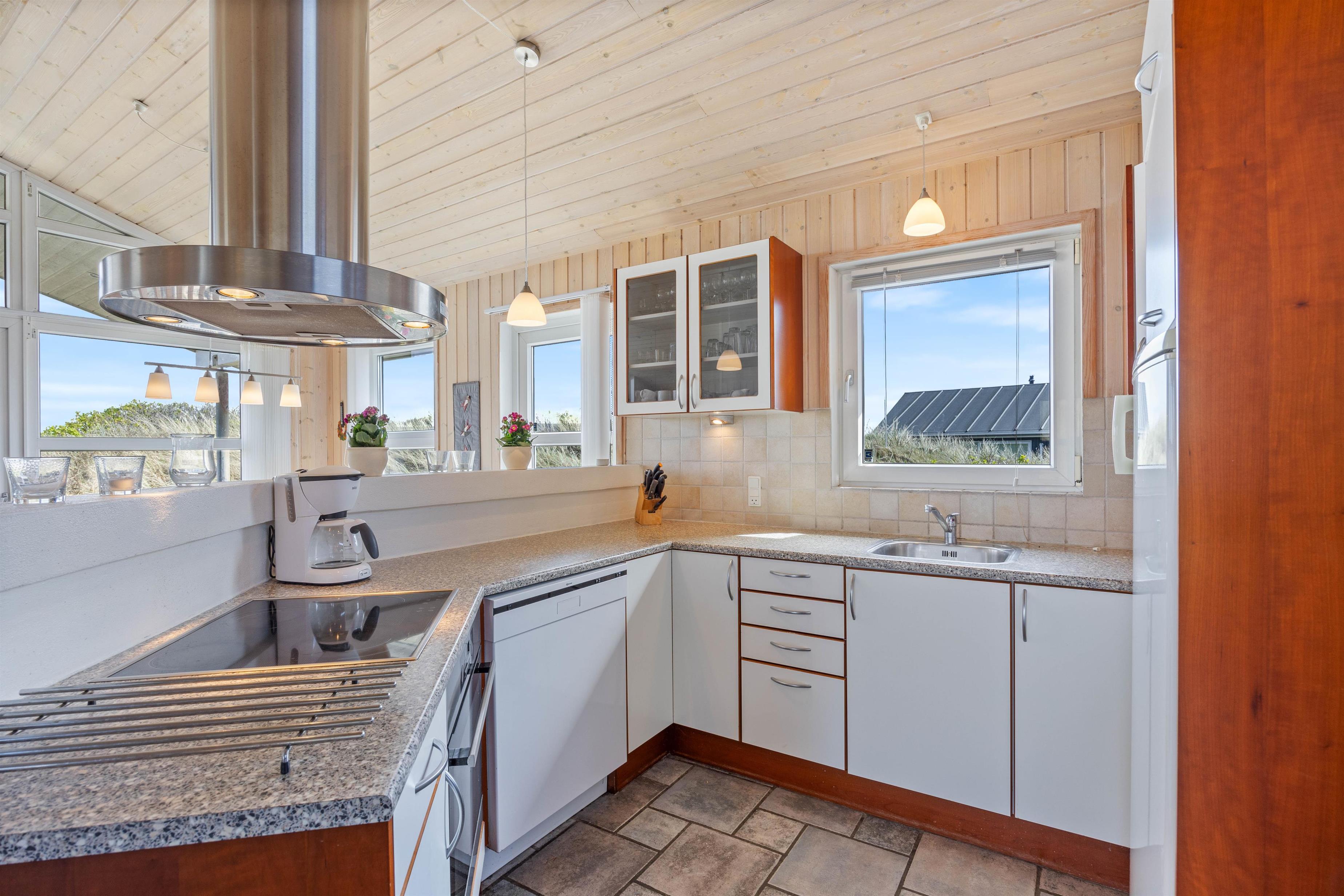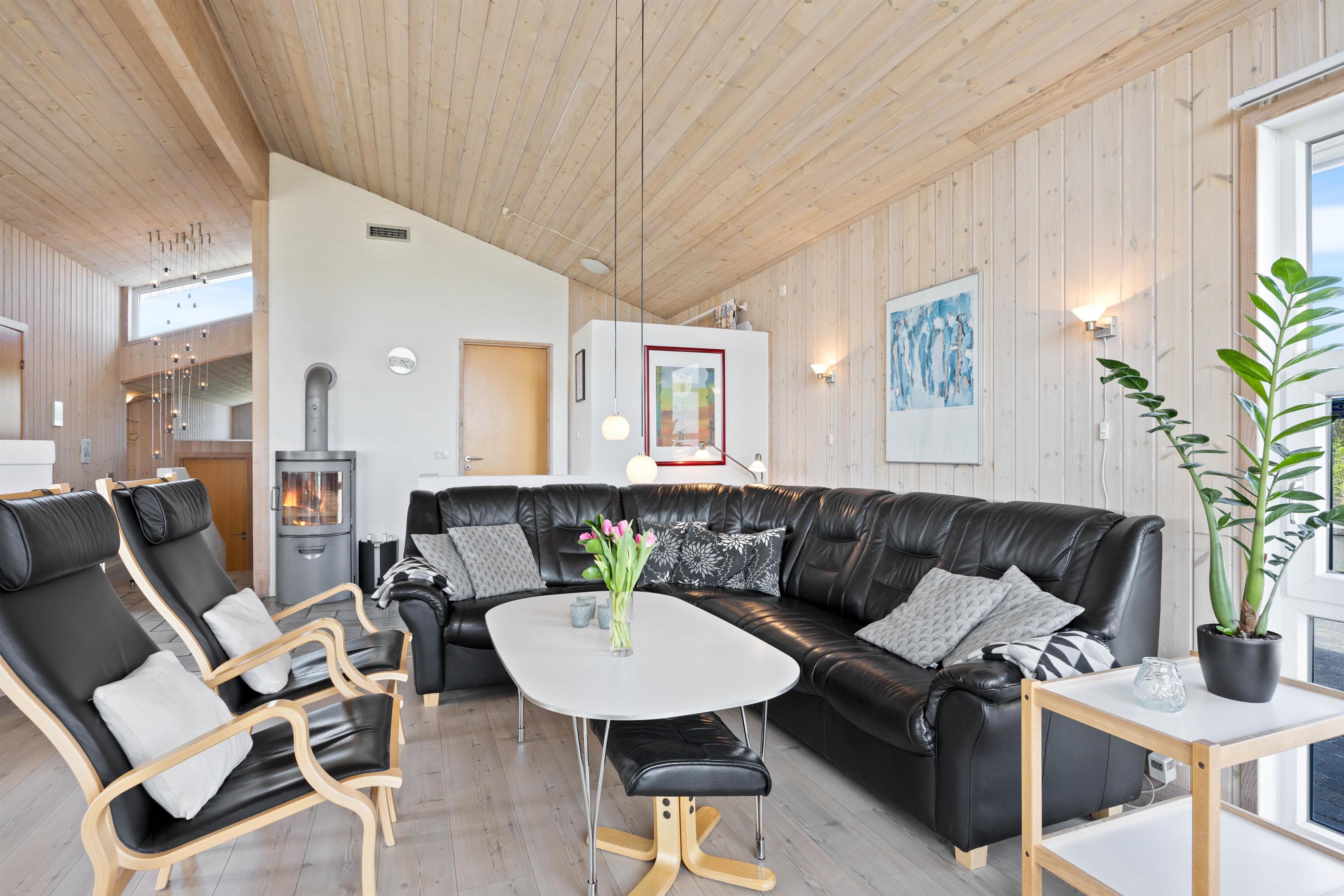 Når I træder ind i dette hyggelige sommerhus, vil I med det samme mærke en dejlig rummelighed, da der er højt til loftet. I køkkenalrummet kan I sætte jer i sofaen, og nyde den smukke udsigt over Ringkøbing Fjord, imens de knitrende lyde fra brændeovnen skaber en afslappende stemning.