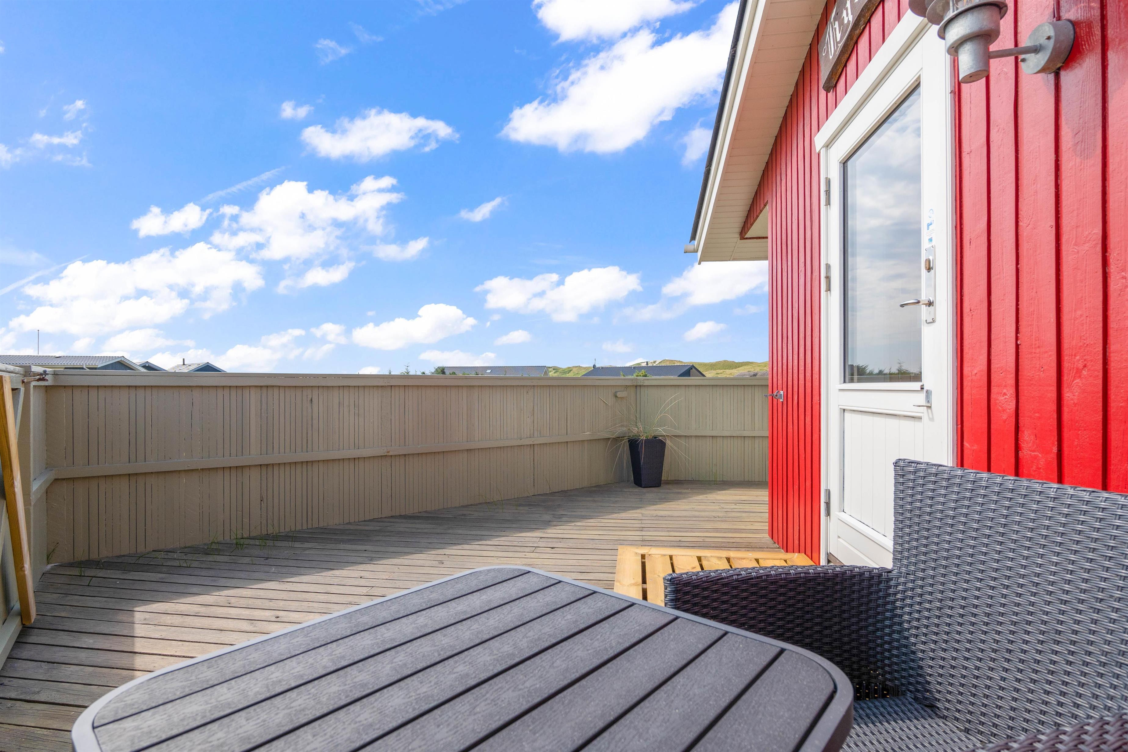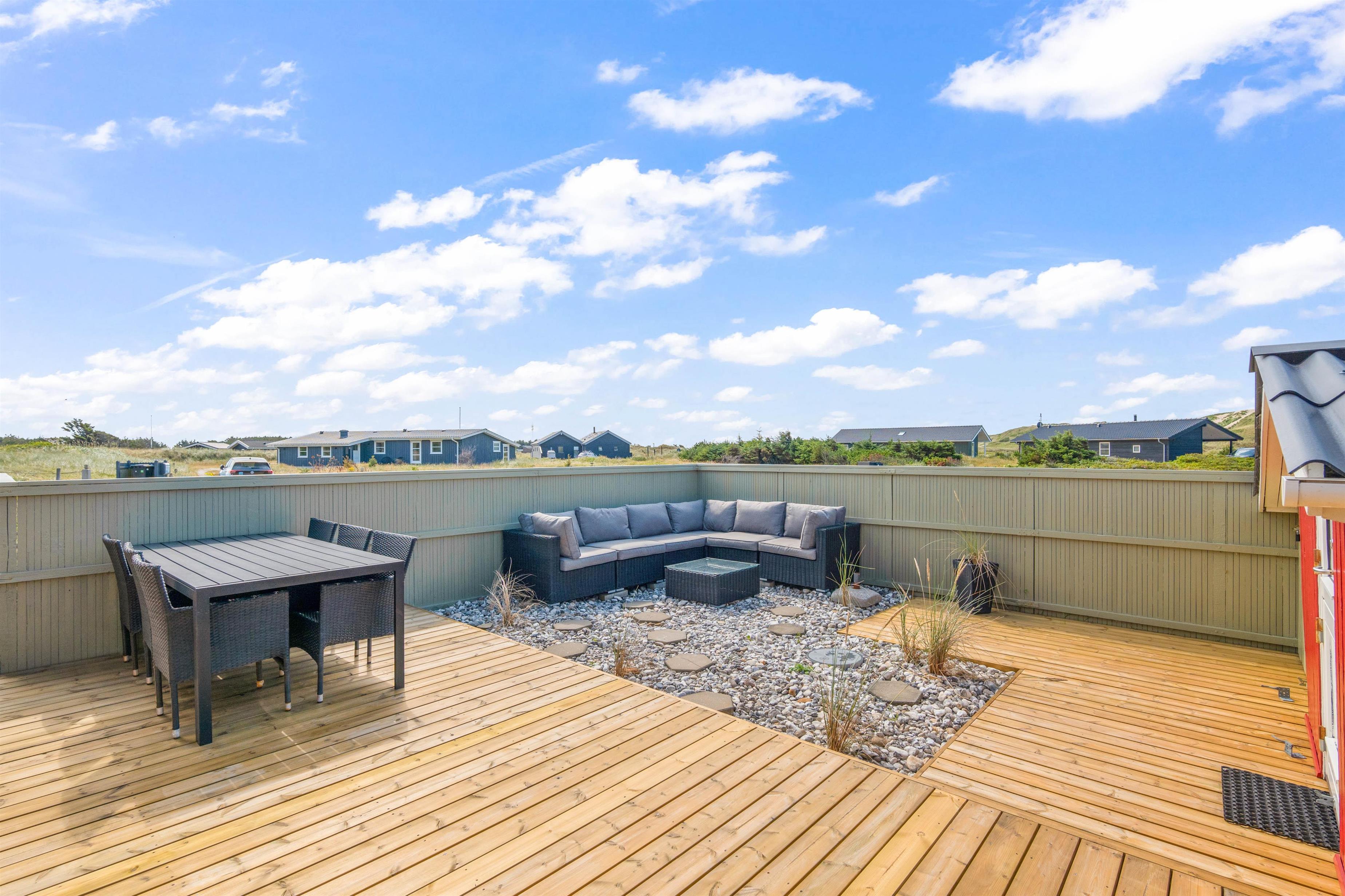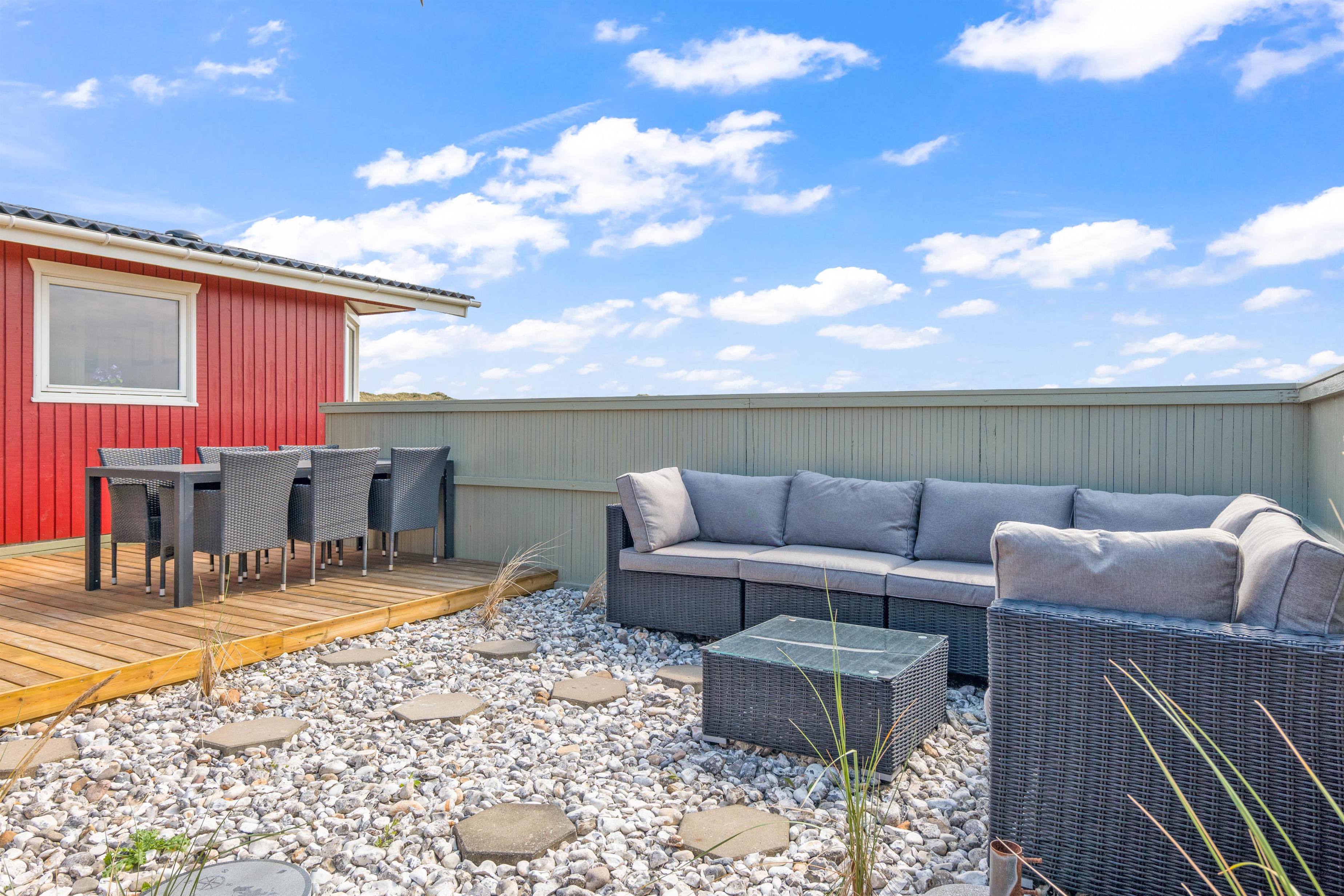 Til dette sommerhus hører en rigtig dejlig og rummelige terrasse til, som desuden også er lukket. Her kan I sidde helt ugeneret og nyde den friske luft og den karakteristiske natur. Sæt dig godt til rette i sommerhusets komfortable havemøbler, mens du nyder skyggen under parasolen, med lyden af bølgerne i baggrunden. Sommerhuset ligger blot 250 meter fra vandet, og derfor kan havet høres fra sommerhuset.