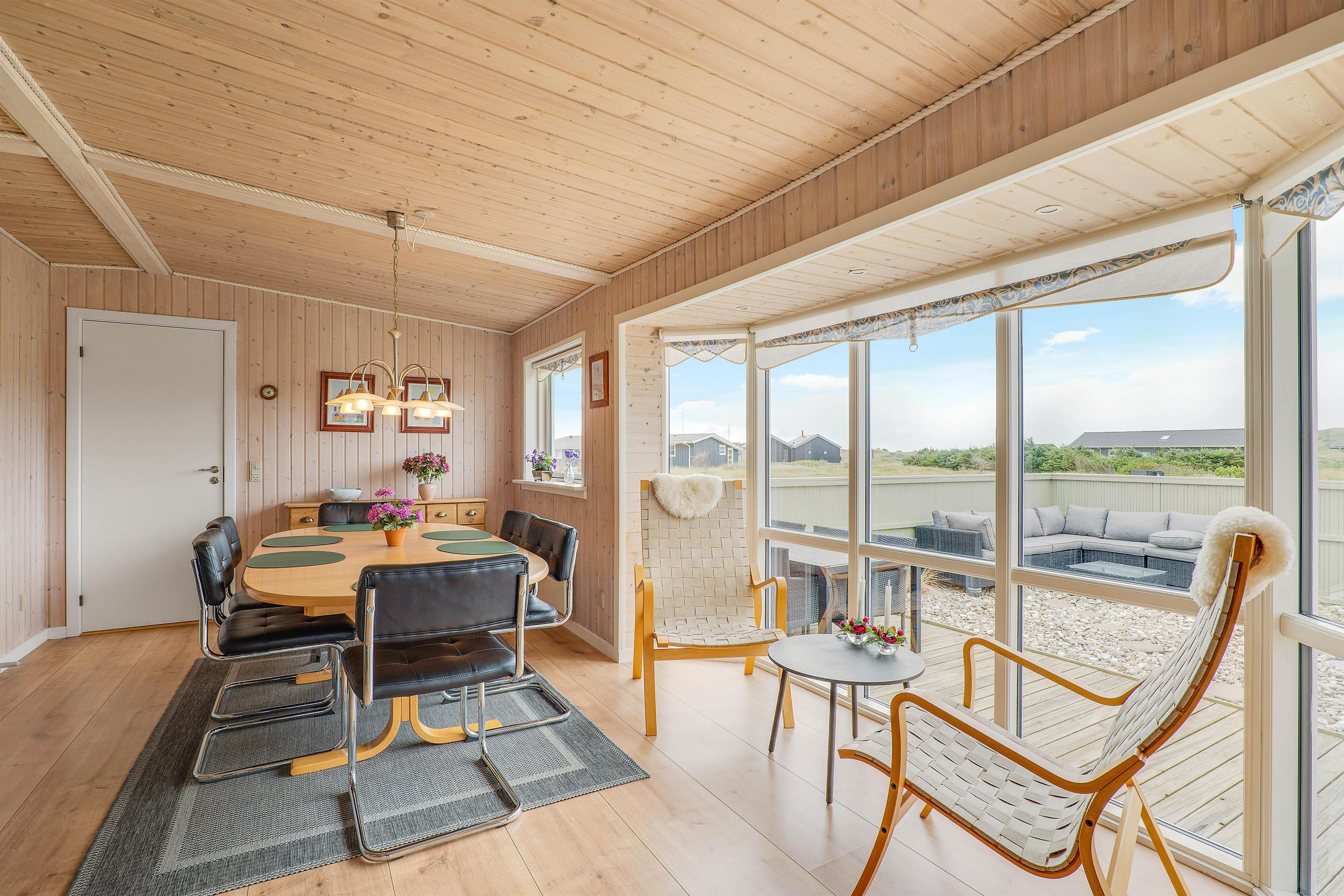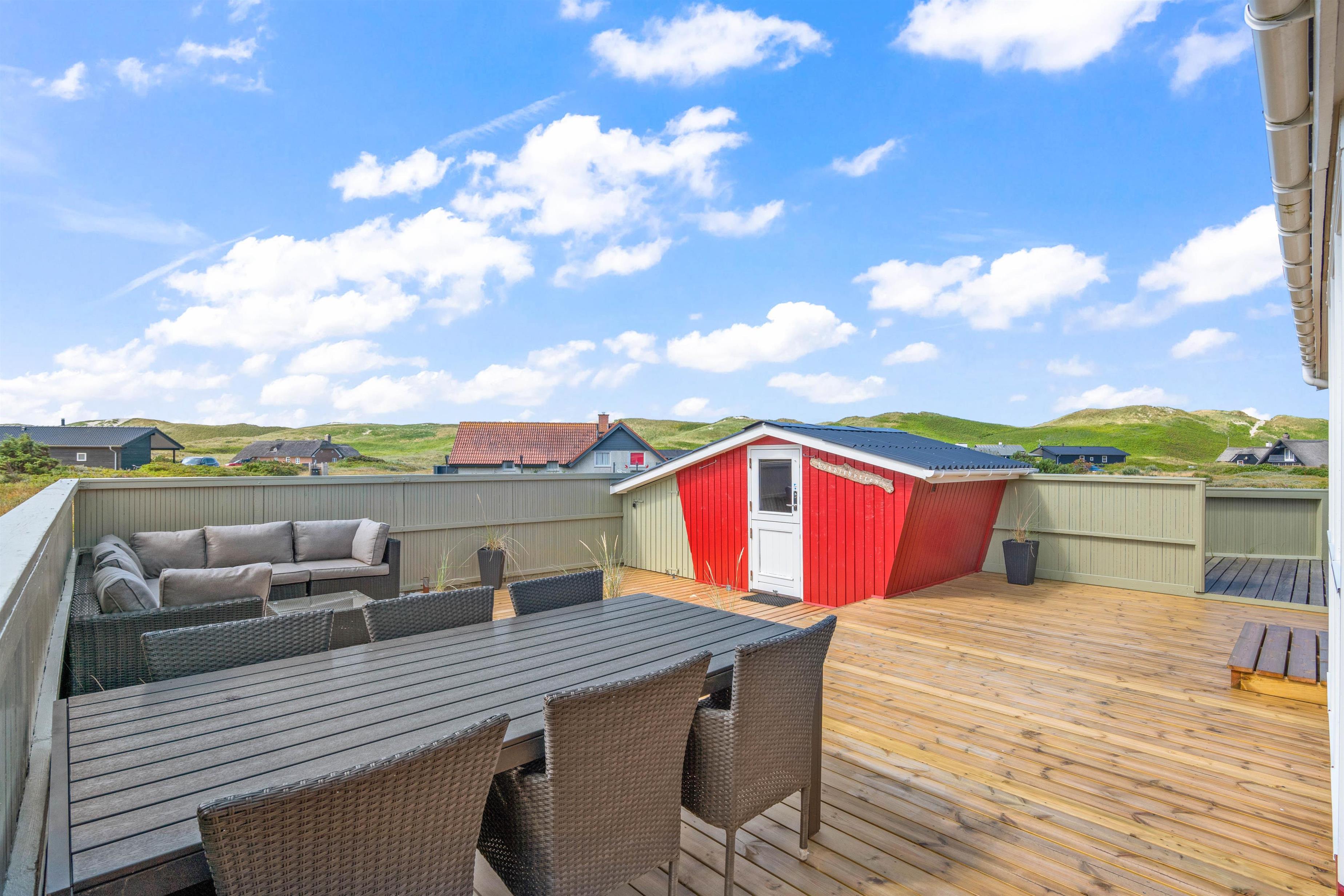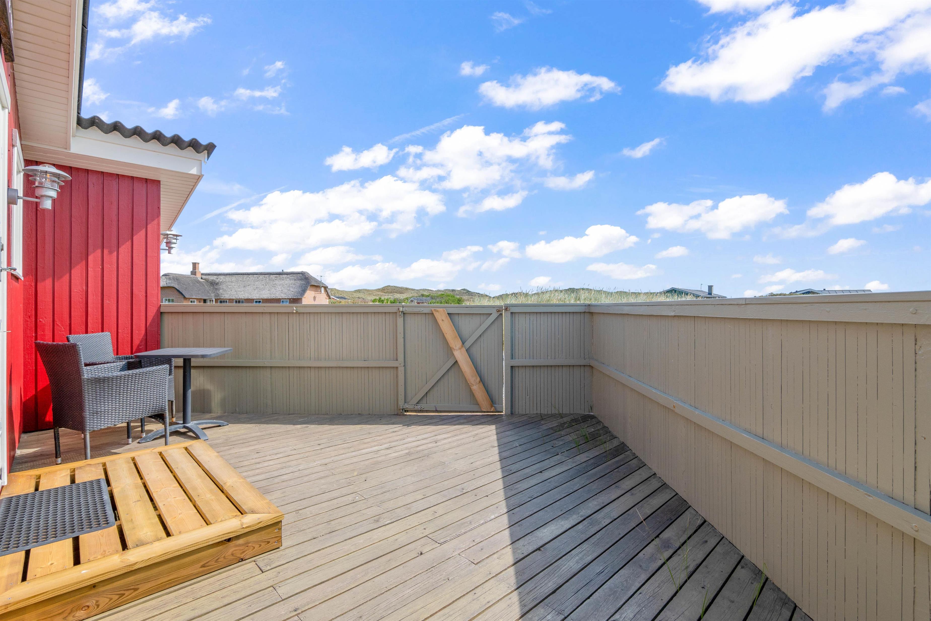 Til dette sommerhus hører en rigtig dejlig og rummelige terrasse til, som desuden også er lukket. Her kan I sidde helt ugeneret og nyde den friske luft og den karakteristiske natur. Sæt dig godt til rette i sommerhusets komfortable havemøbler, mens du nyder skyggen under parasolen, med lyden af bølgerne i baggrunden. Sommerhuset ligger blot 250 meter fra vandet, og derfor kan havet høres fra sommerhuset.