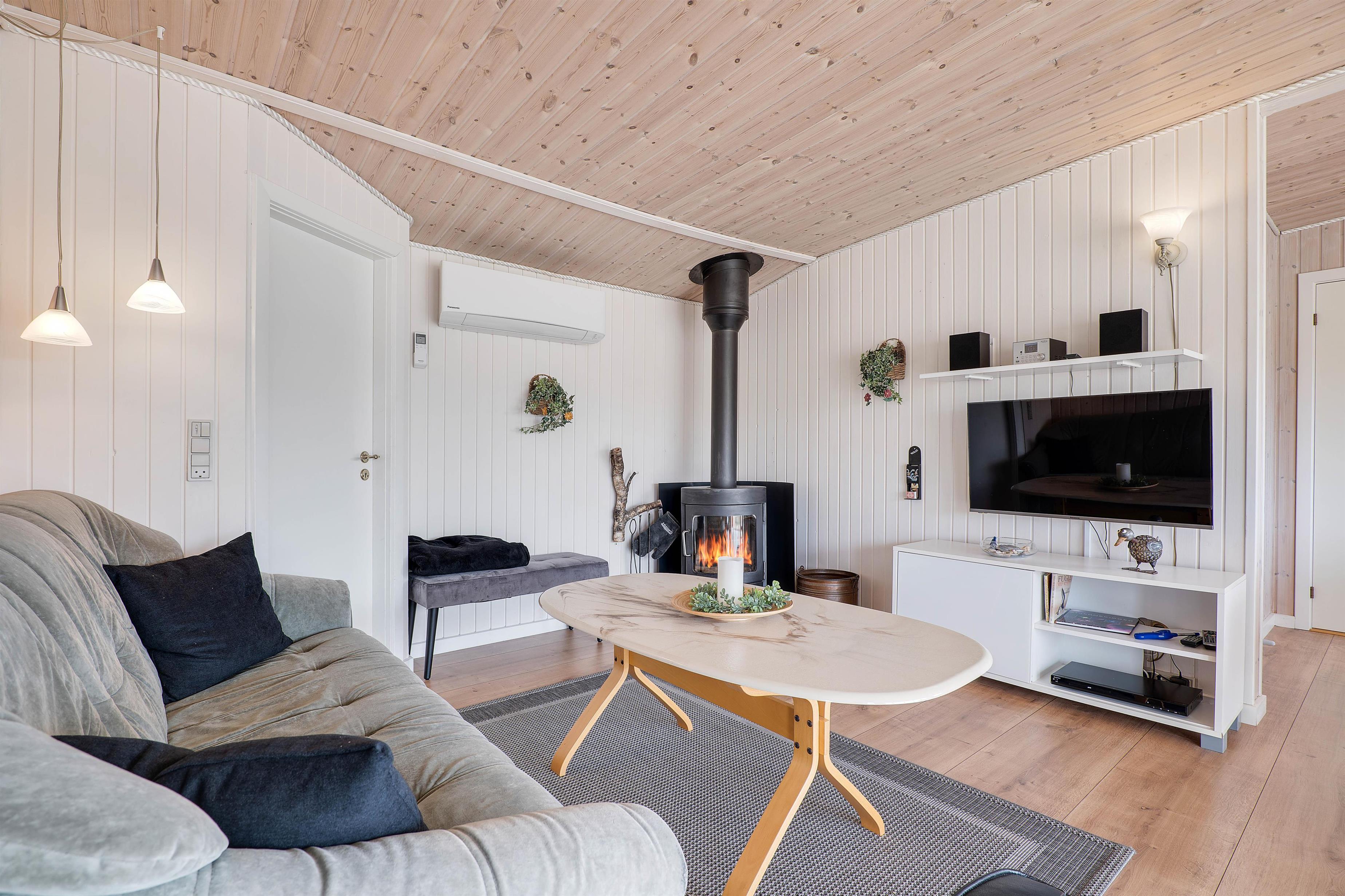 Der er et badeværelse i huset, som er udstyret med gulvvarme, således du ikke skal fryse fødderne om morgenen. Derudover er der også en brændeovn i huset, så i rigtig kan mærke den klassiske sommerhusstemning. Og er i mere til den energibesparende varmekilde er der også en varmepumpe til rådighed.