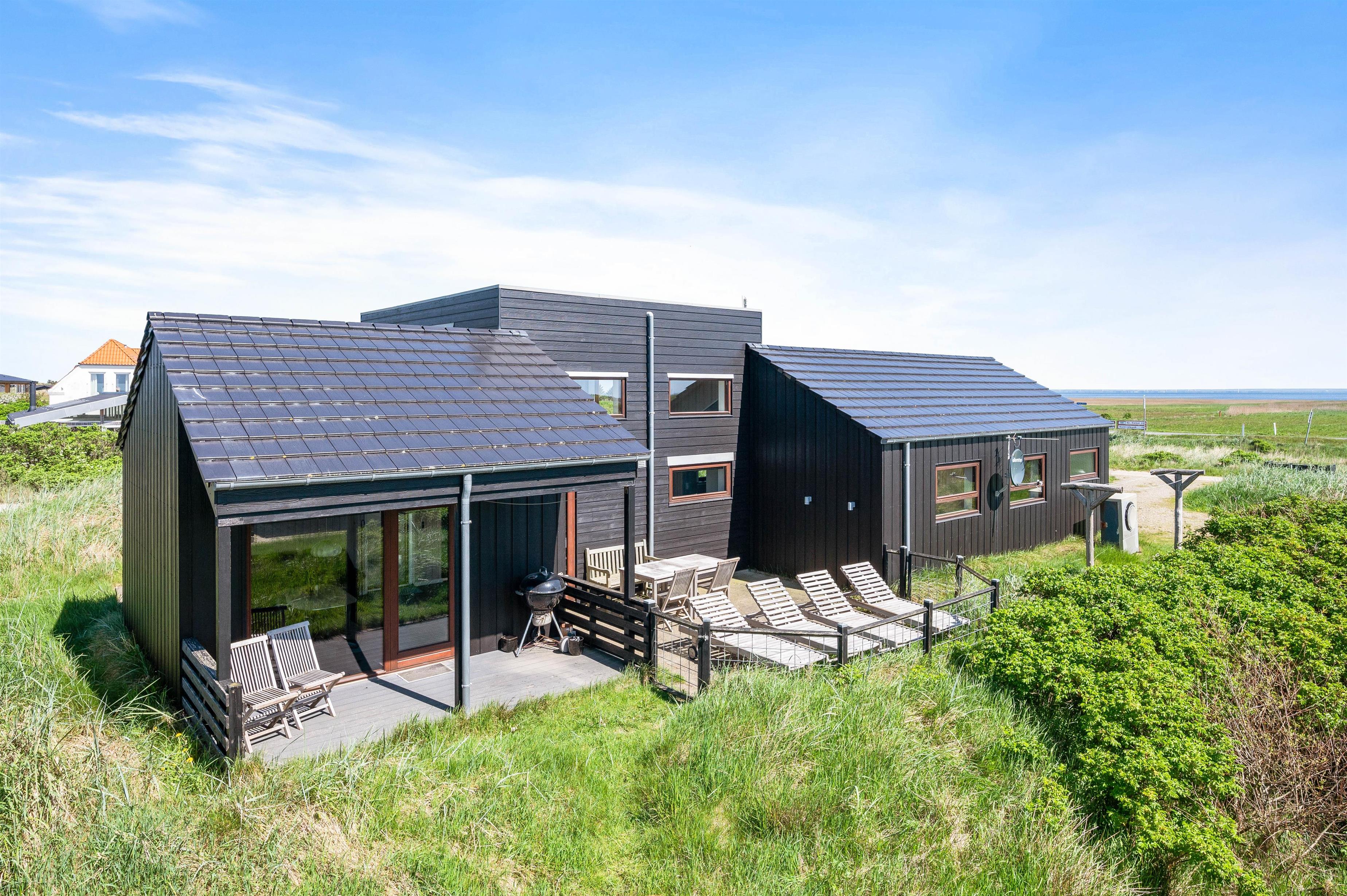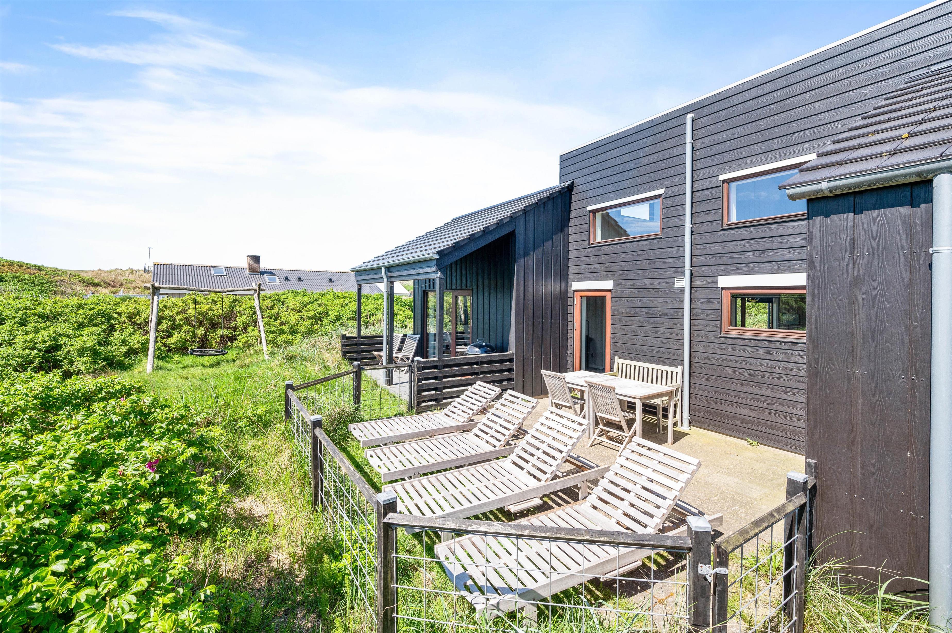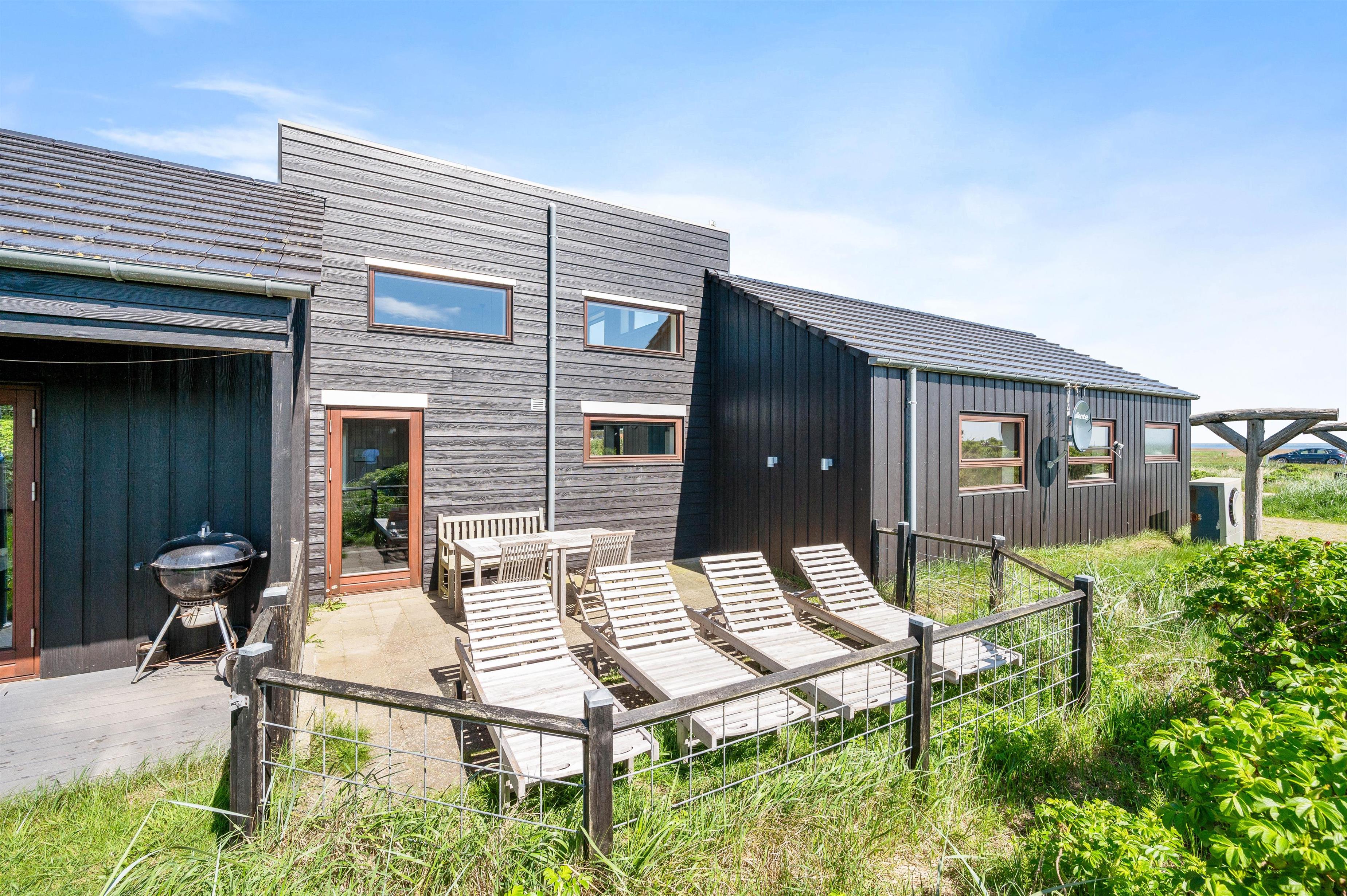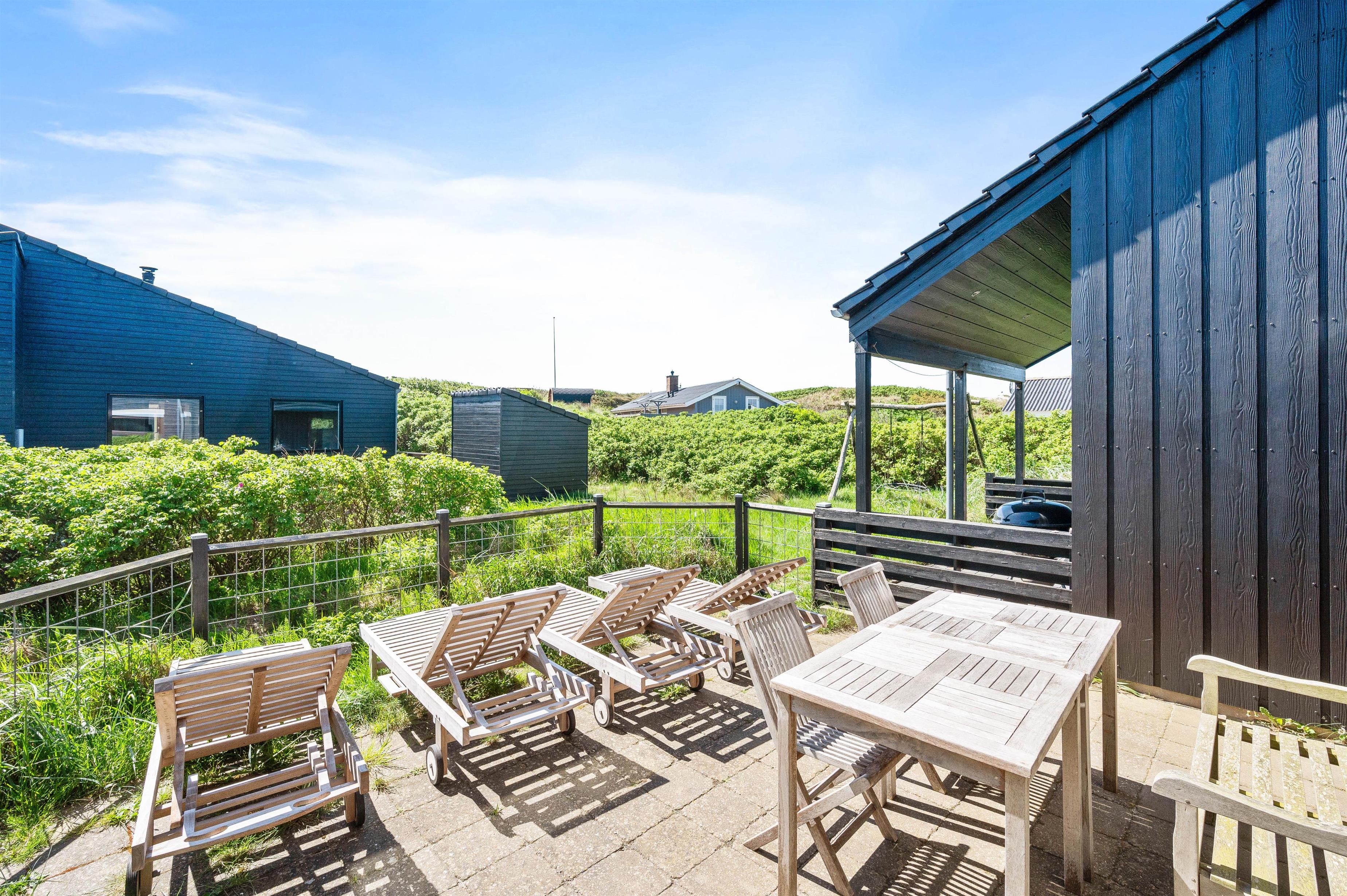 Udenfor venter jer en 1501m2 stor naturgrund, som I kan nyde fra husets både åbne, lukkede og overdækkede terrasse. Herfra kan I nyde udsigten over Ringkøbing Fjord og det frie udsyn til yderste klitrække mod havet uanset vejret. Den medfølgende grill og havemøbler er perfekte til sommerens lange grillfester.