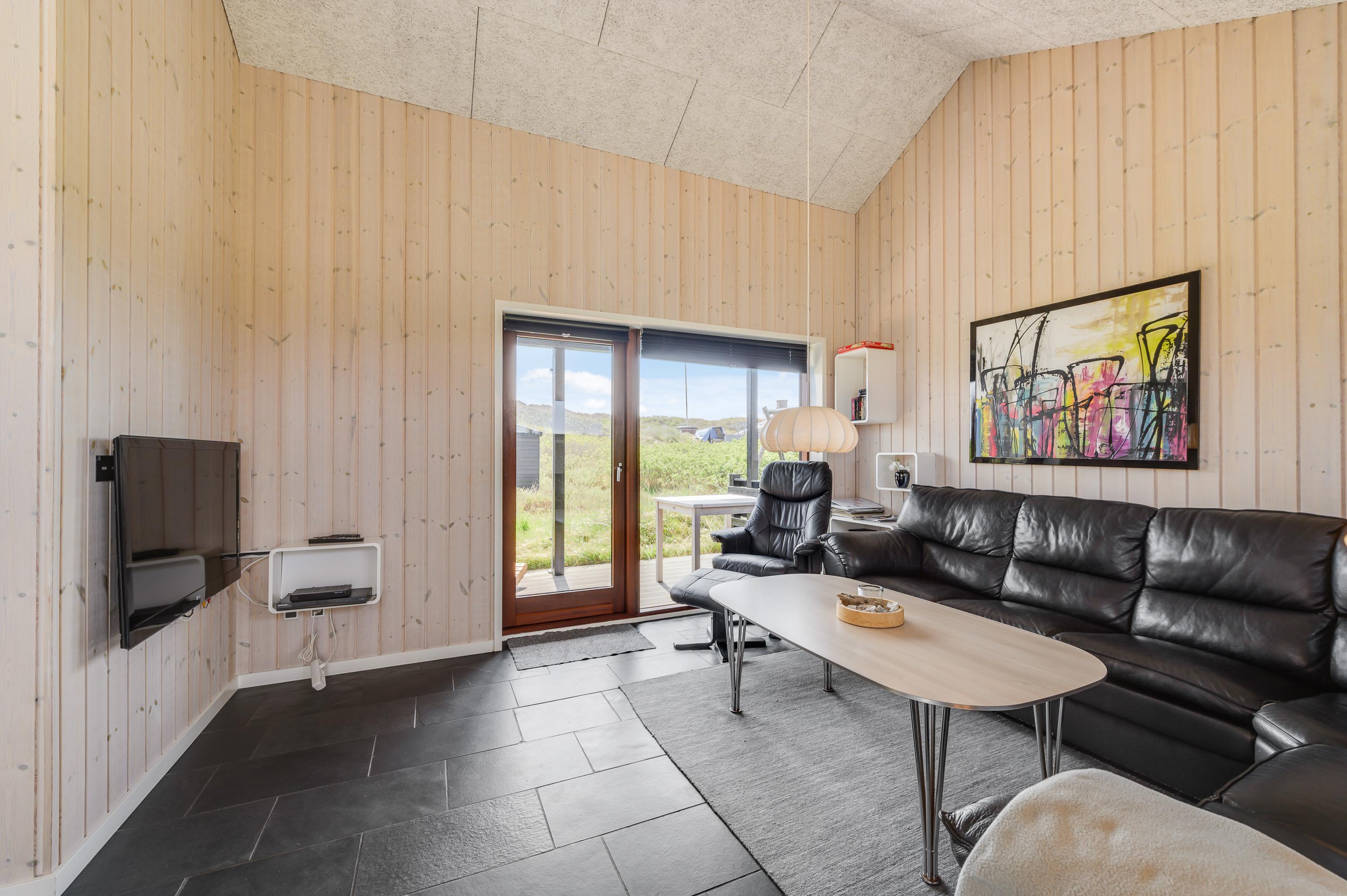 Når det er tid til afslapning indendørs, kan du nyde underholdningen fra fladskærms-TV’et med parabolforbindelse. Sommerhusets opholdsrum er også udstyret med gulvvarme, hvilket bidrager til den hyggelige atmosfære.