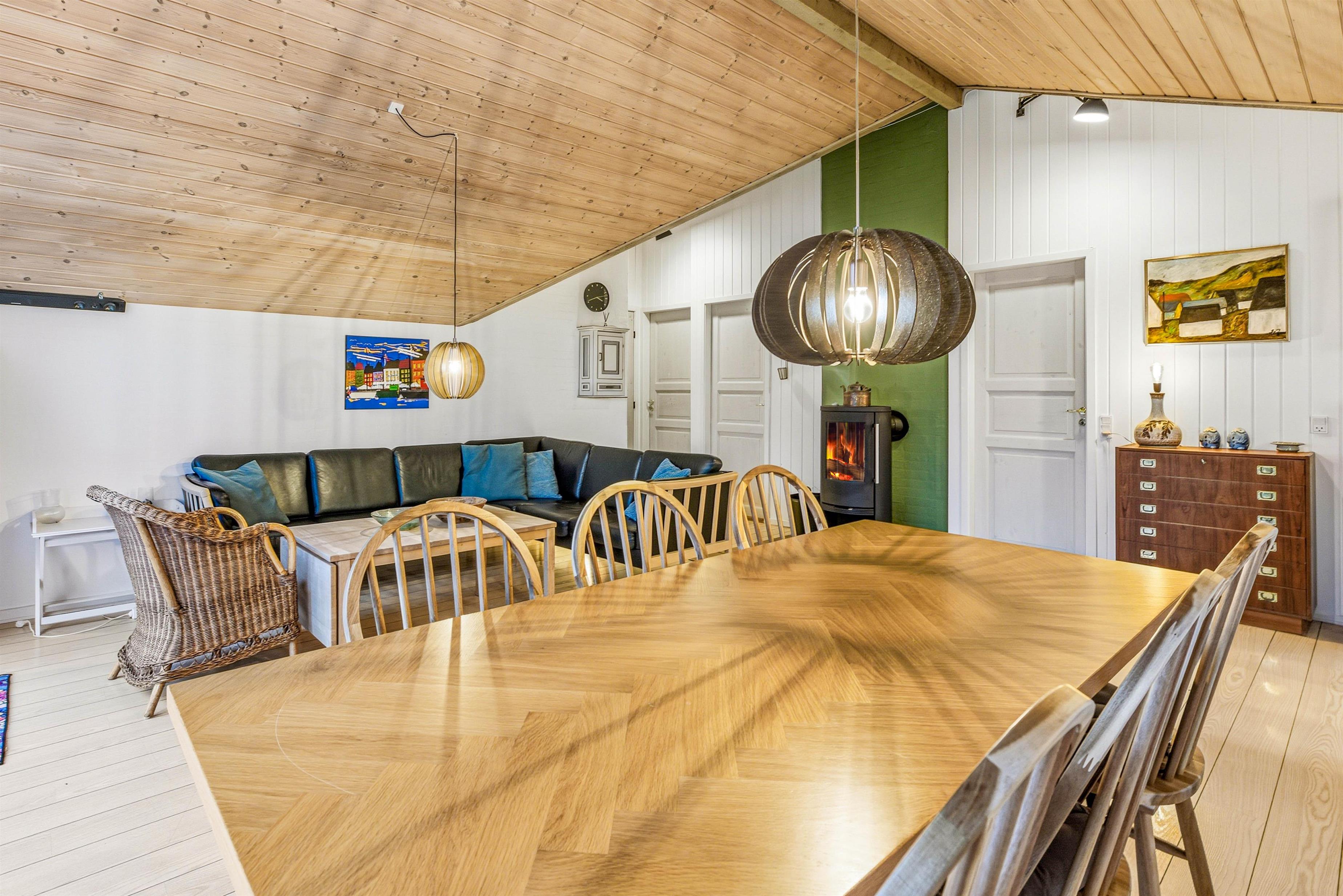 I opholdsrummet står brændeovnen, der altid spreder hyggelig feriestemning. Med den energibesparende varmepumpe er I desuden altid sikret et behageligt indeklima.
