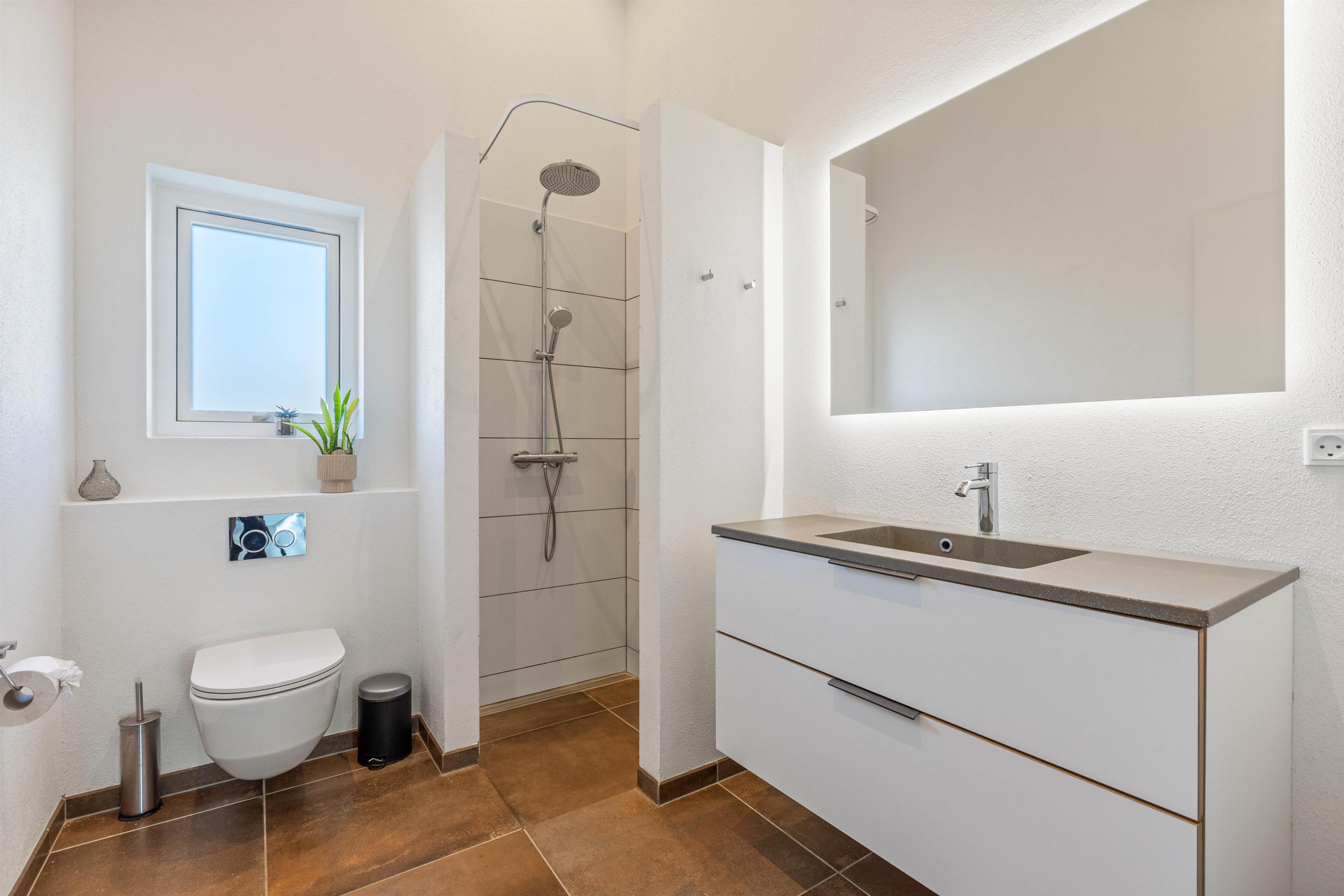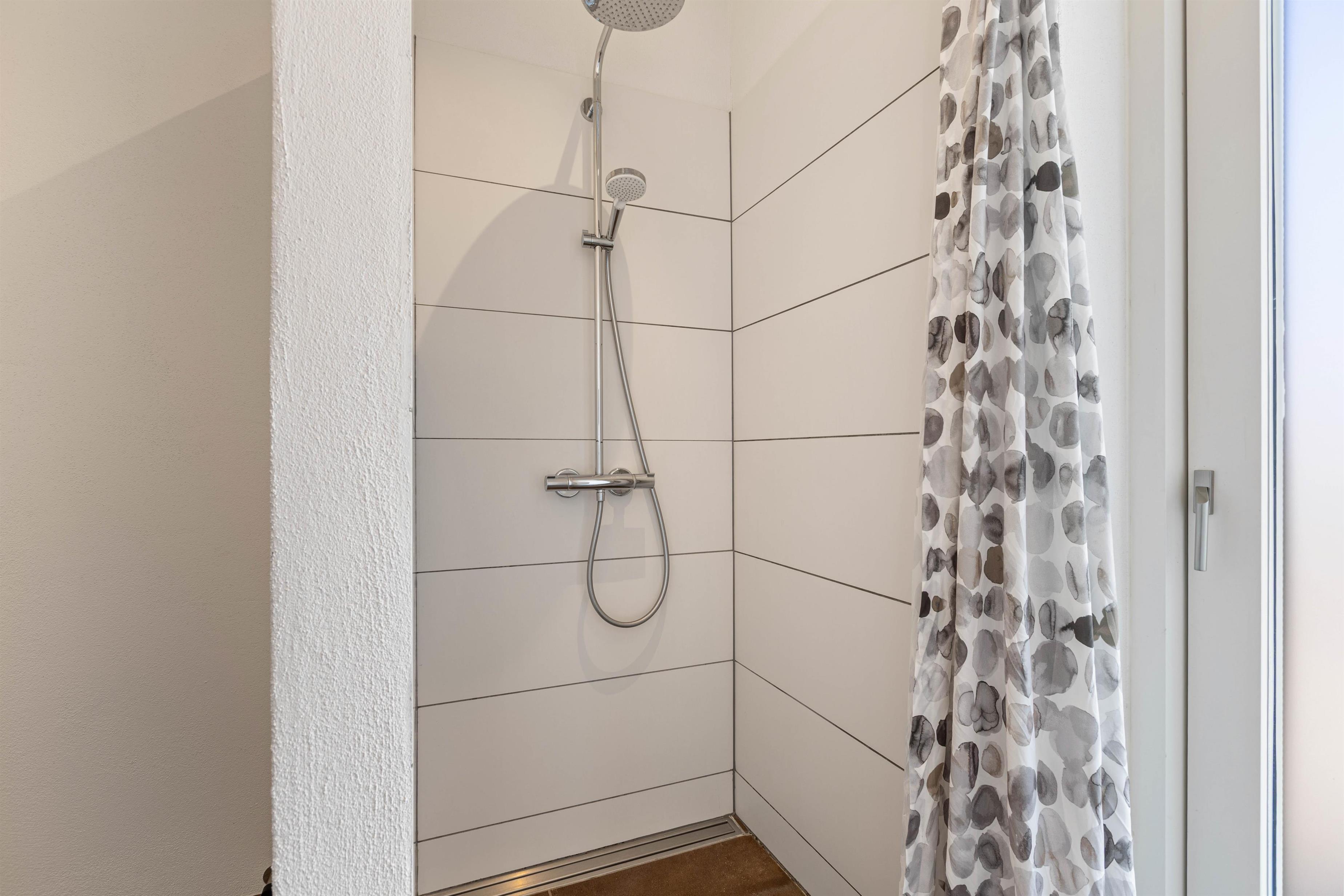 Sommerhuset rummer i alt 3 badeværelser, der alle er udstyret med gulvvarme. De 2 af badeværelserne ligger i direkte forbindelse til 2 af feriehusets 4 soveværelser, der alle er med dobbeltsenge og gulvvarme, så alle kan krybe til køjs uden fare for kolde tæer.