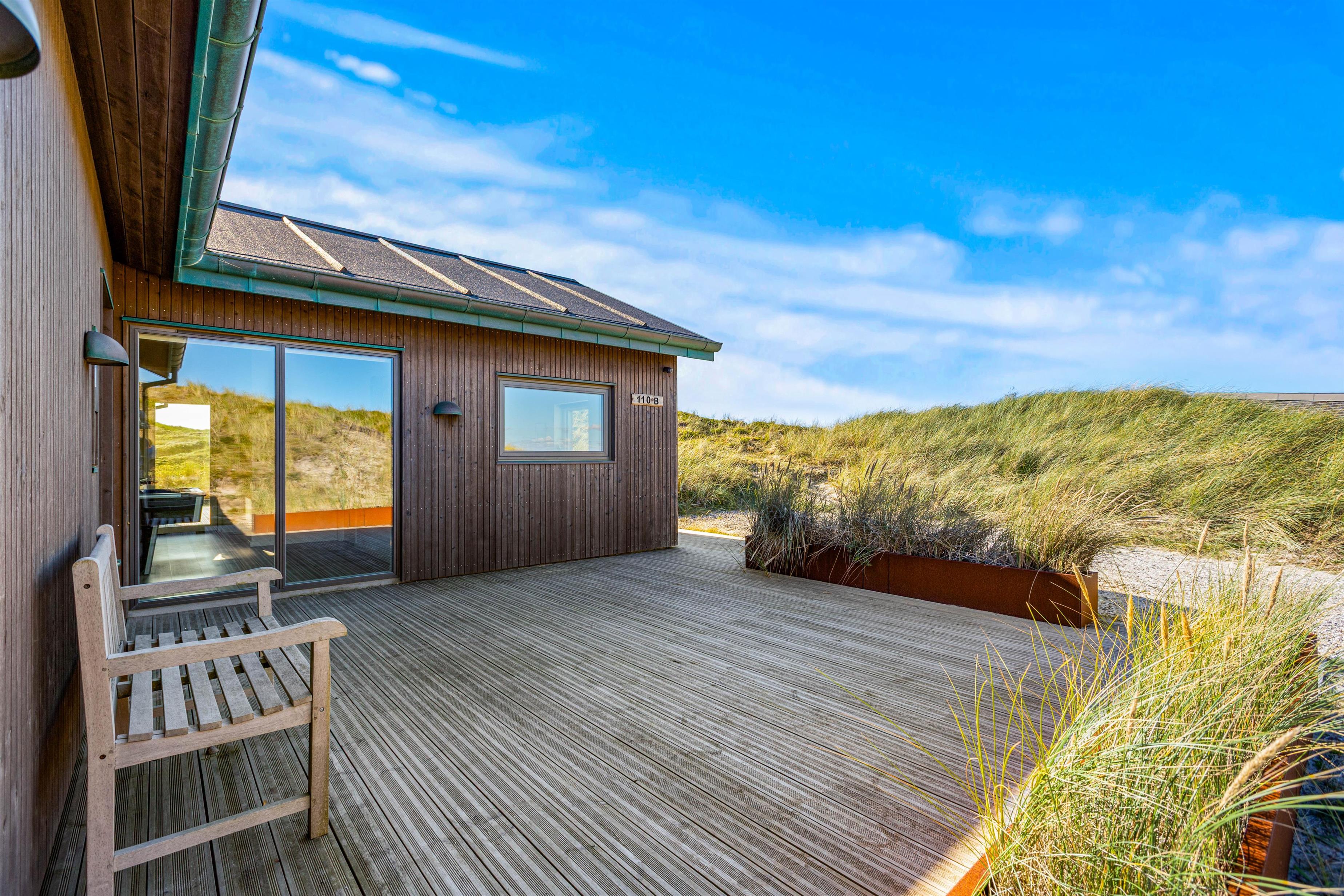 Med udgang fra stuen mod vest finder I sommerhusets udestue, der med sin unikke beliggenhed har panoramaudsigt over klitterne hele vejen til Ringkøbing Fjord.