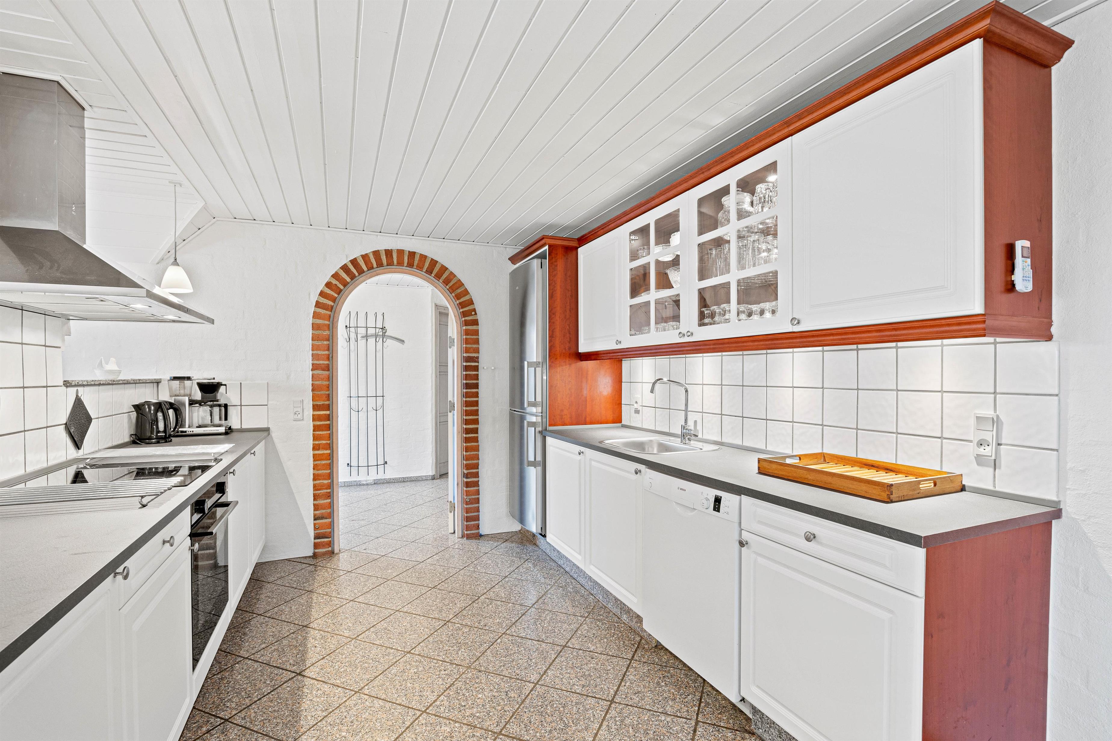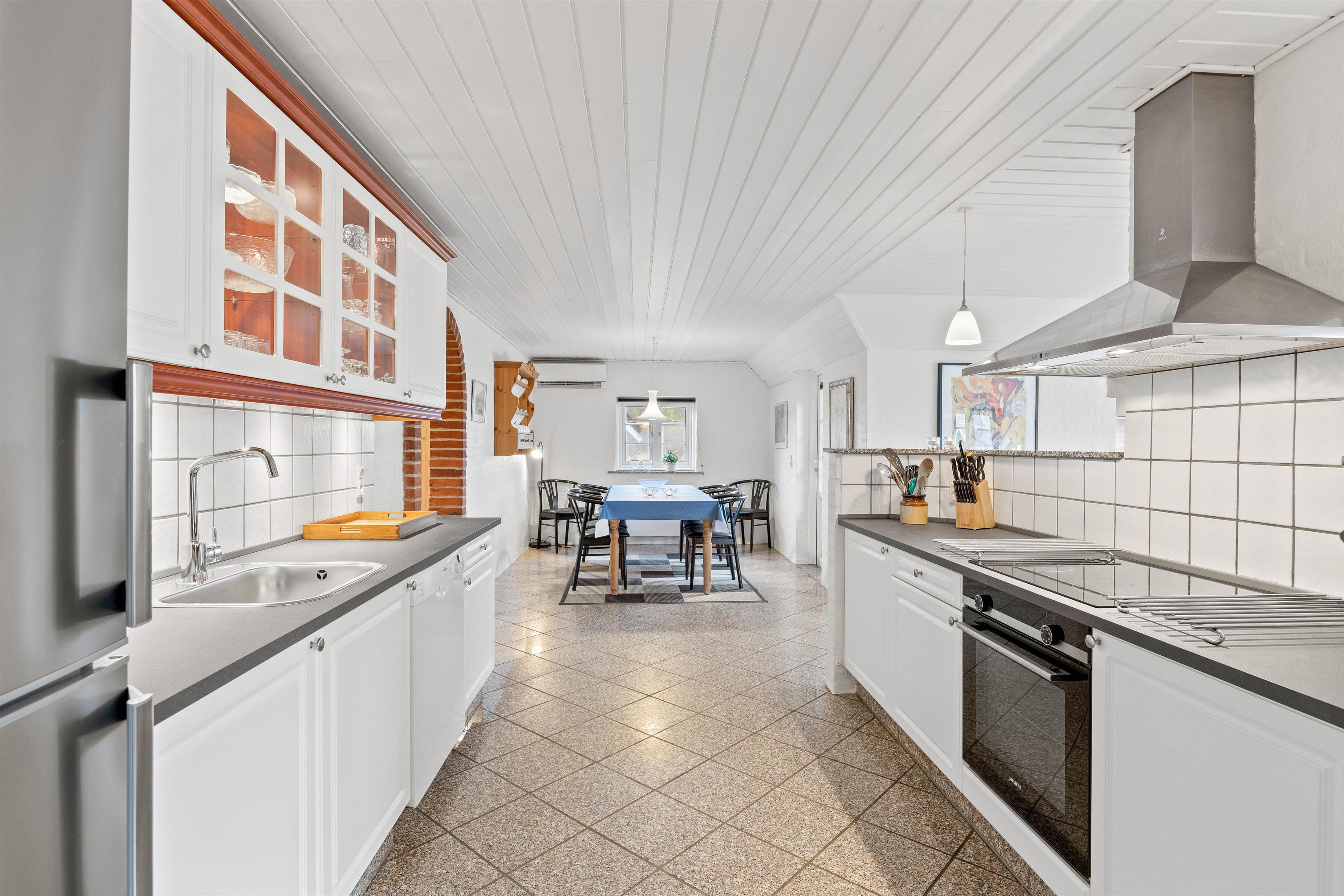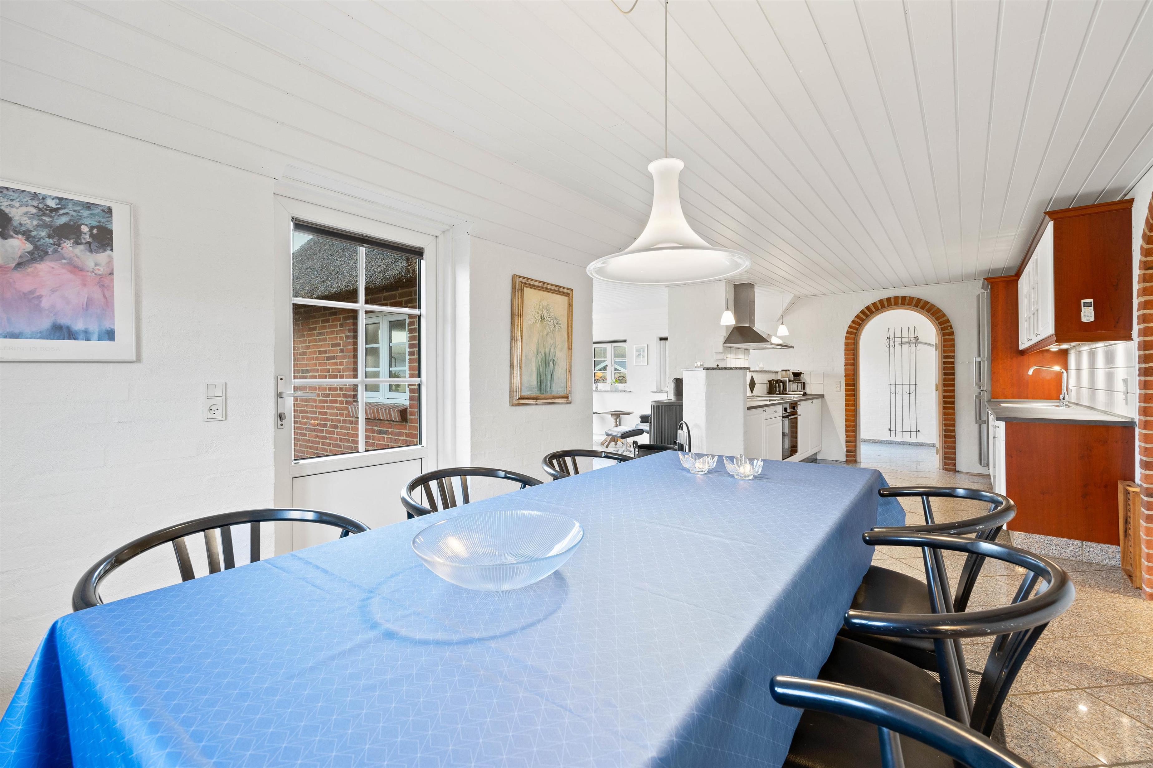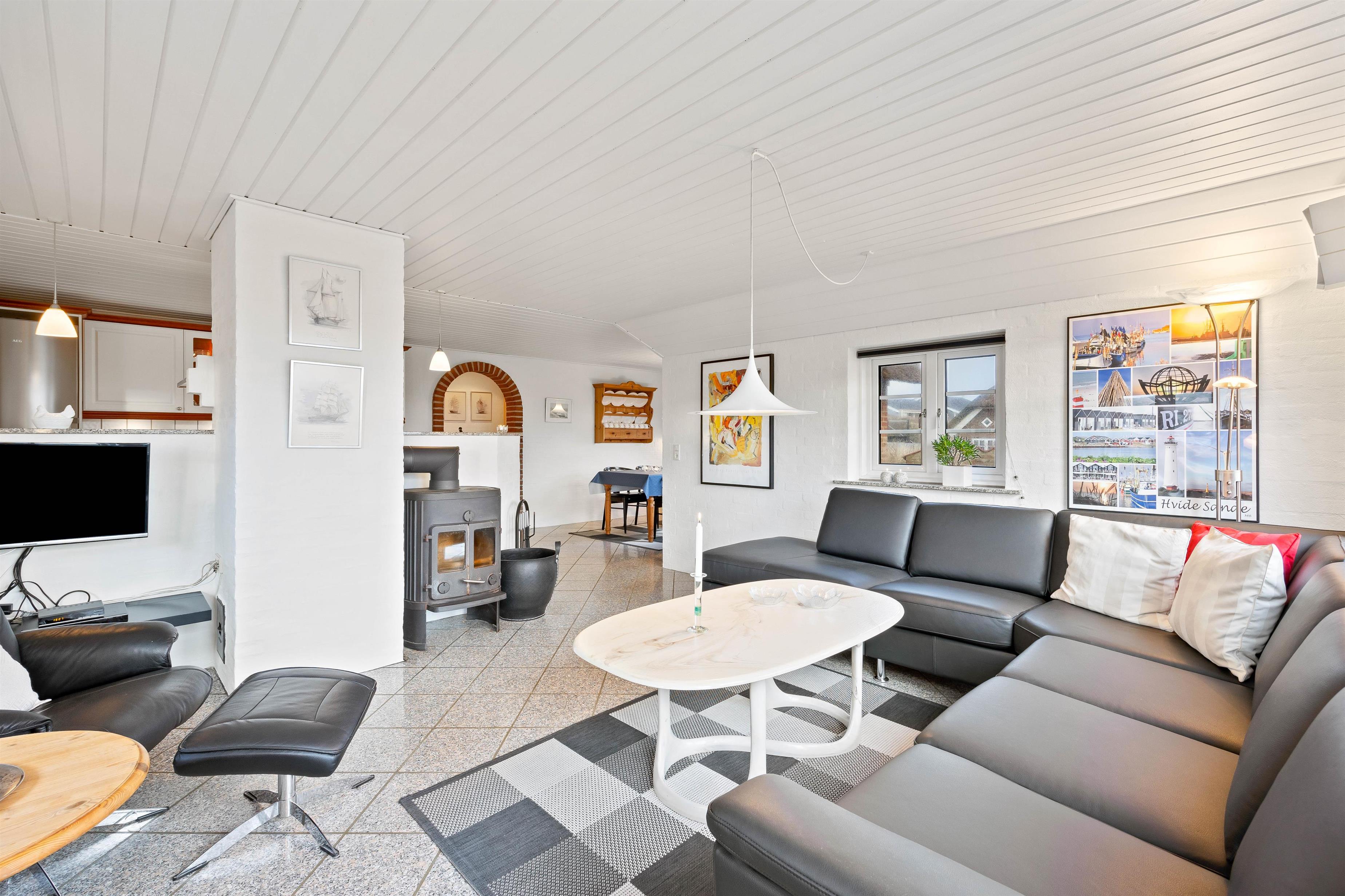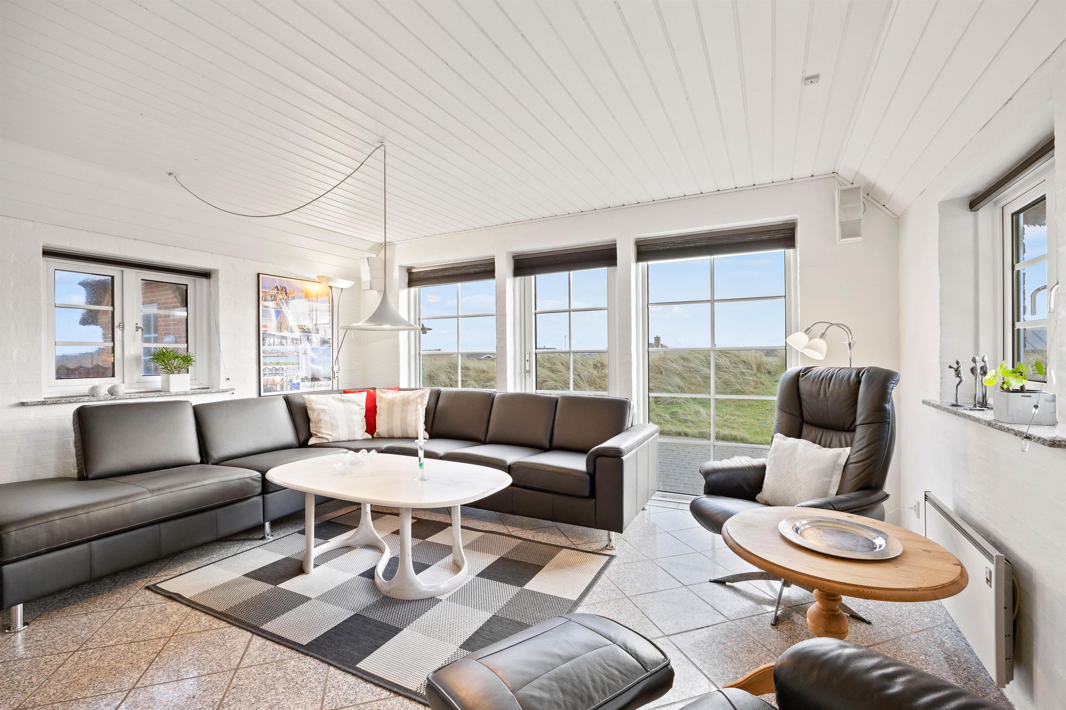 Indretningen i sommerhuset er klassisk med gode møbler og masser af kvalitetsudstyr. En rar atmosfære hvor man hurtigt føler sig hjemme. Her er lyst, et praktisk klinkegulv, som er ideelt for hundeejerne samt en masse vinduer. De mange vinduer inviterer det flotte klitlandskab med helt ind i stuen.