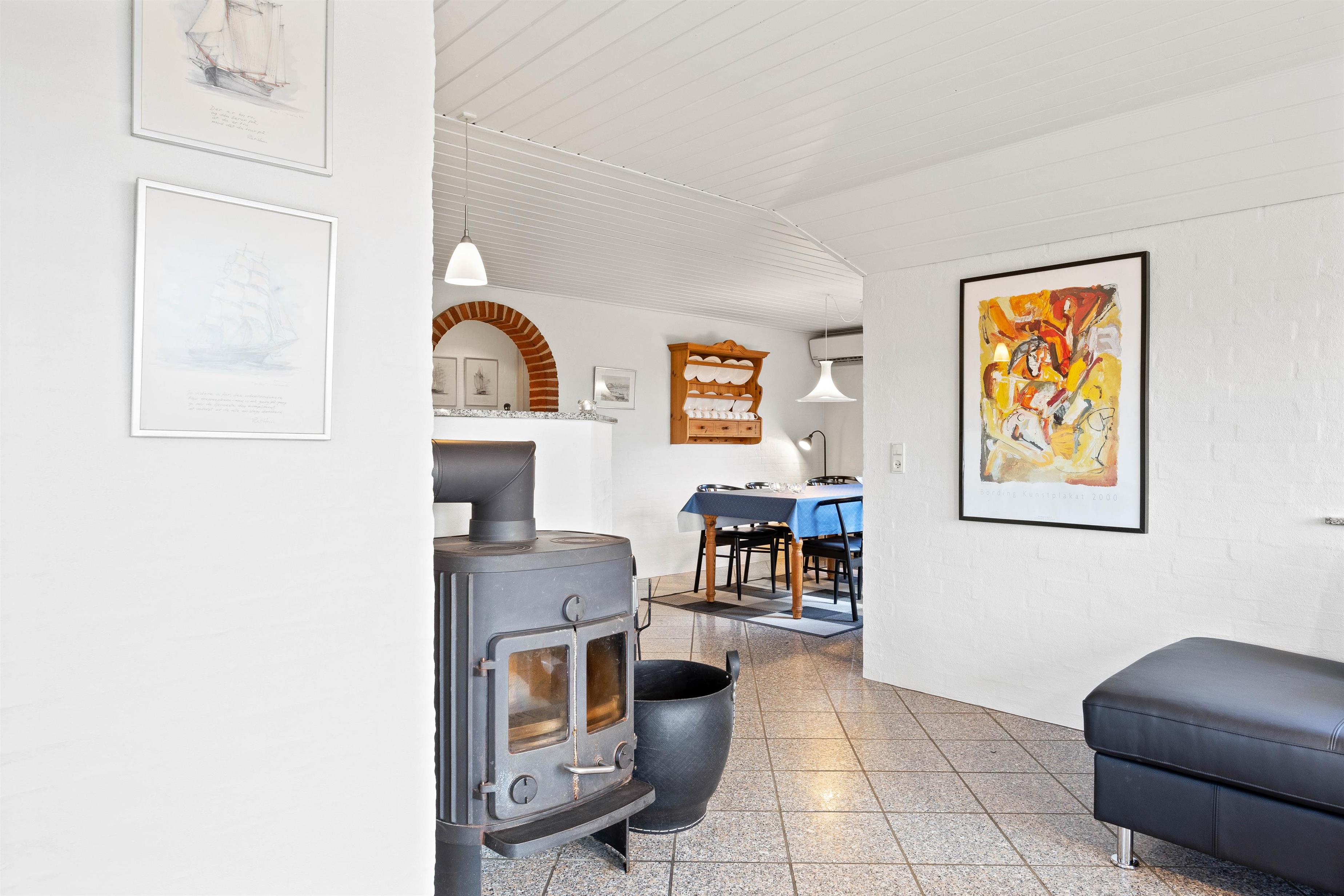 I stuen står den på afslapning, filmhygge eller hyggelige spilleaftner med yatzy, kort eller lign. Tænd op i brændeovnen, der både spreder glæde og varme. Et skønt fællesrum, hvor I kan være samlet – også selvom nogen snakker i sofaen, mens der laves mad i køkkenet. Mellem køkken og stue er der nemlig en halvvæg, der skaber et fint samtalekøkken, hvor der kan tilberedes lækre retter. Retter, der samler hele flokken omkring spisebordet.
