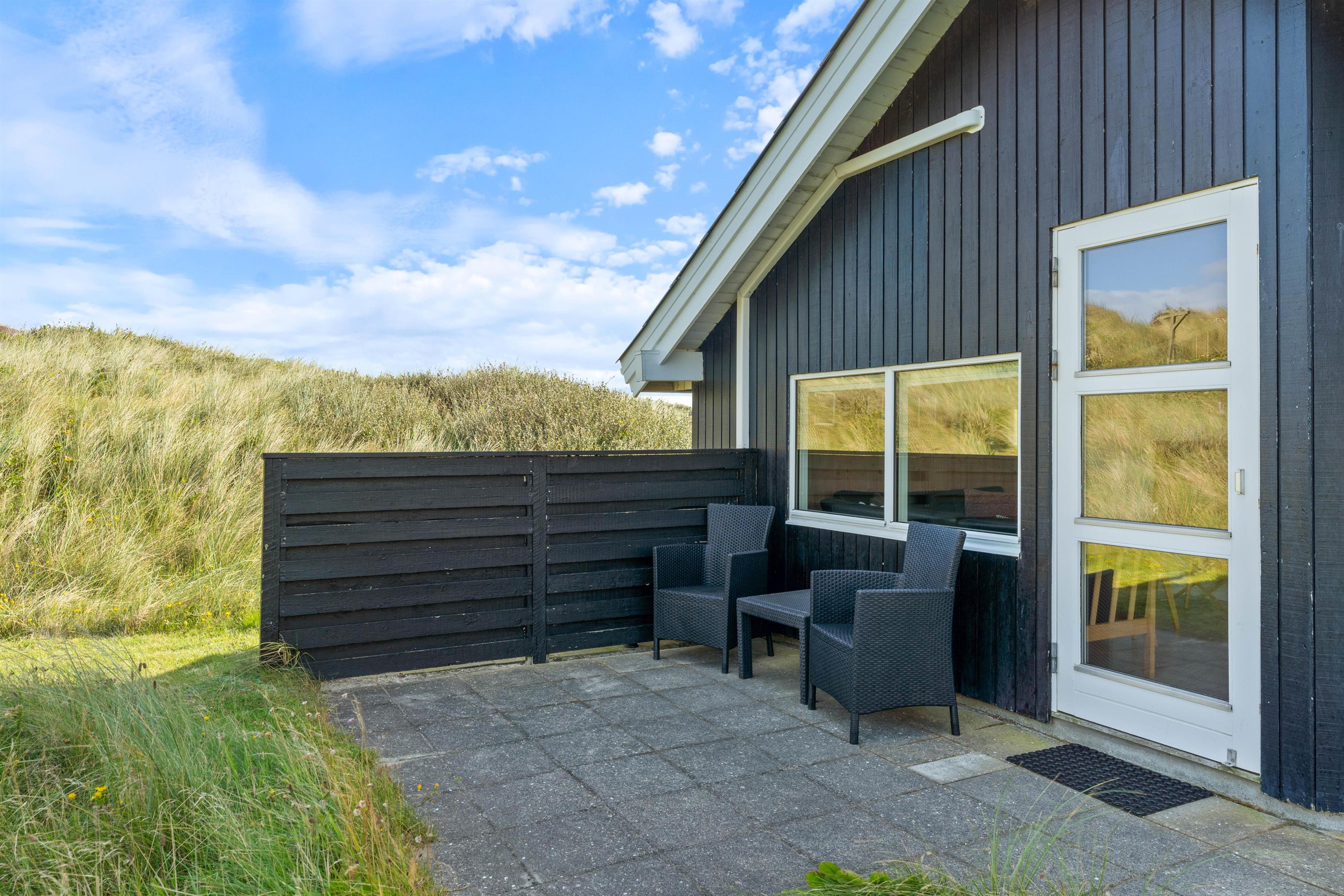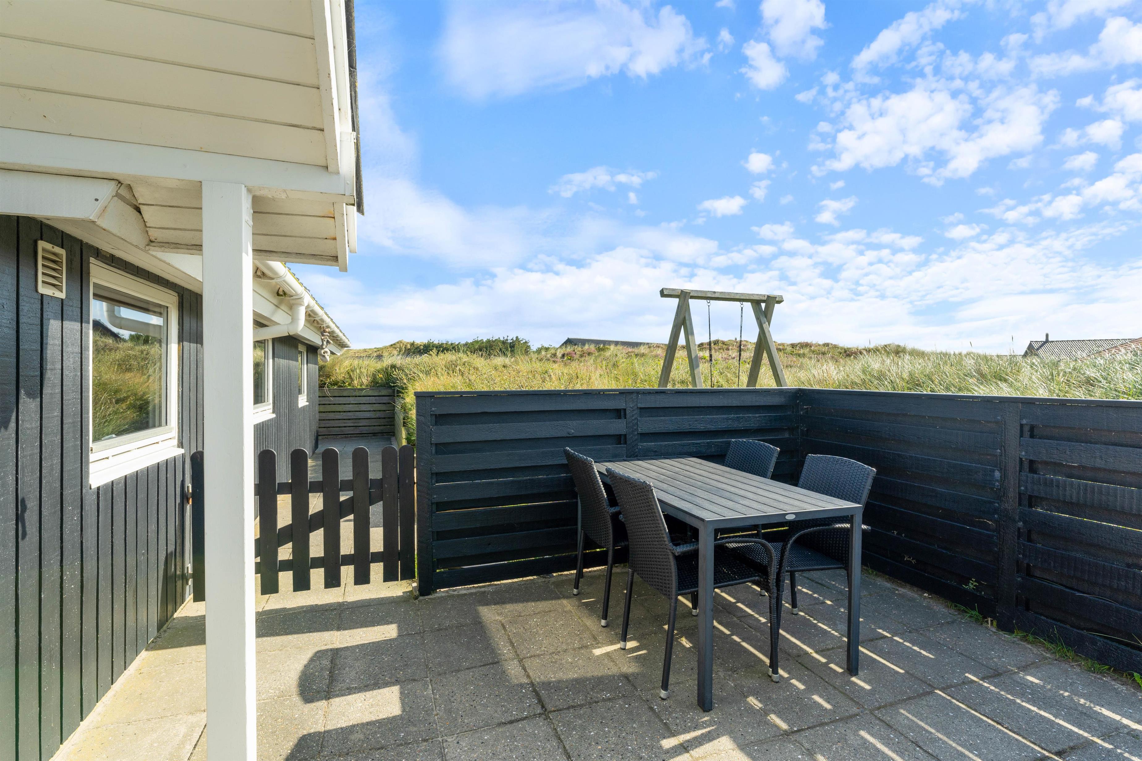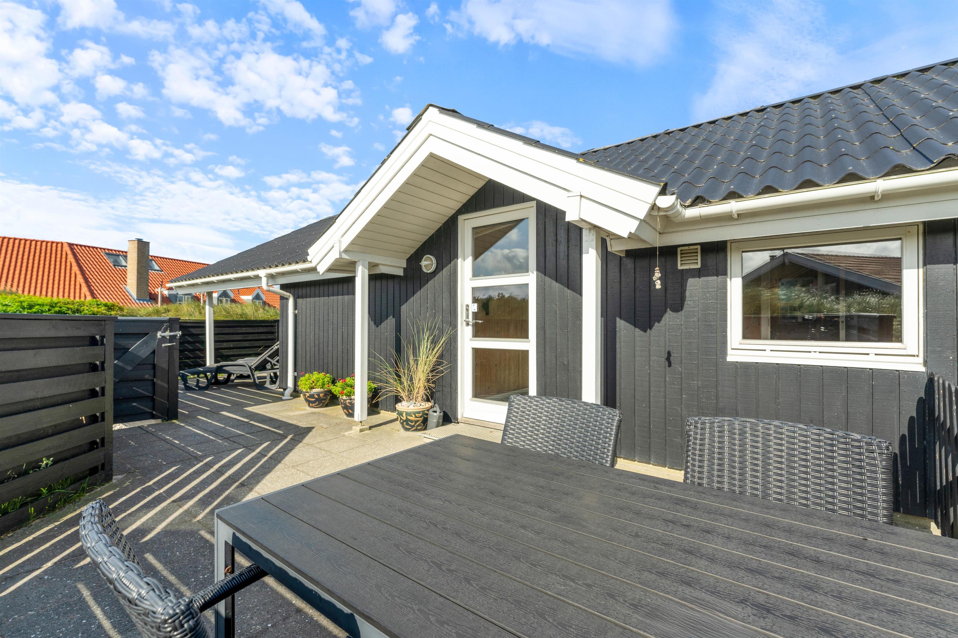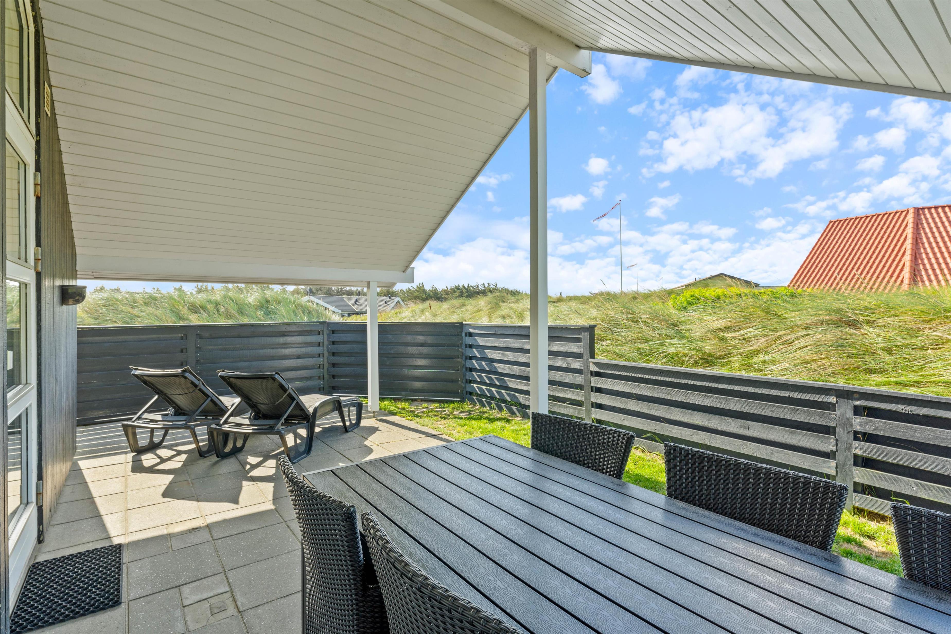 Terrassen løber næsten hele vejen rundt om huset og byder både på god afskærmning, en overdækket del og jeres egen lille græsplæne. En klitbanke rundt om huset sørger for yderligere læ og ugenerede dage i solen.