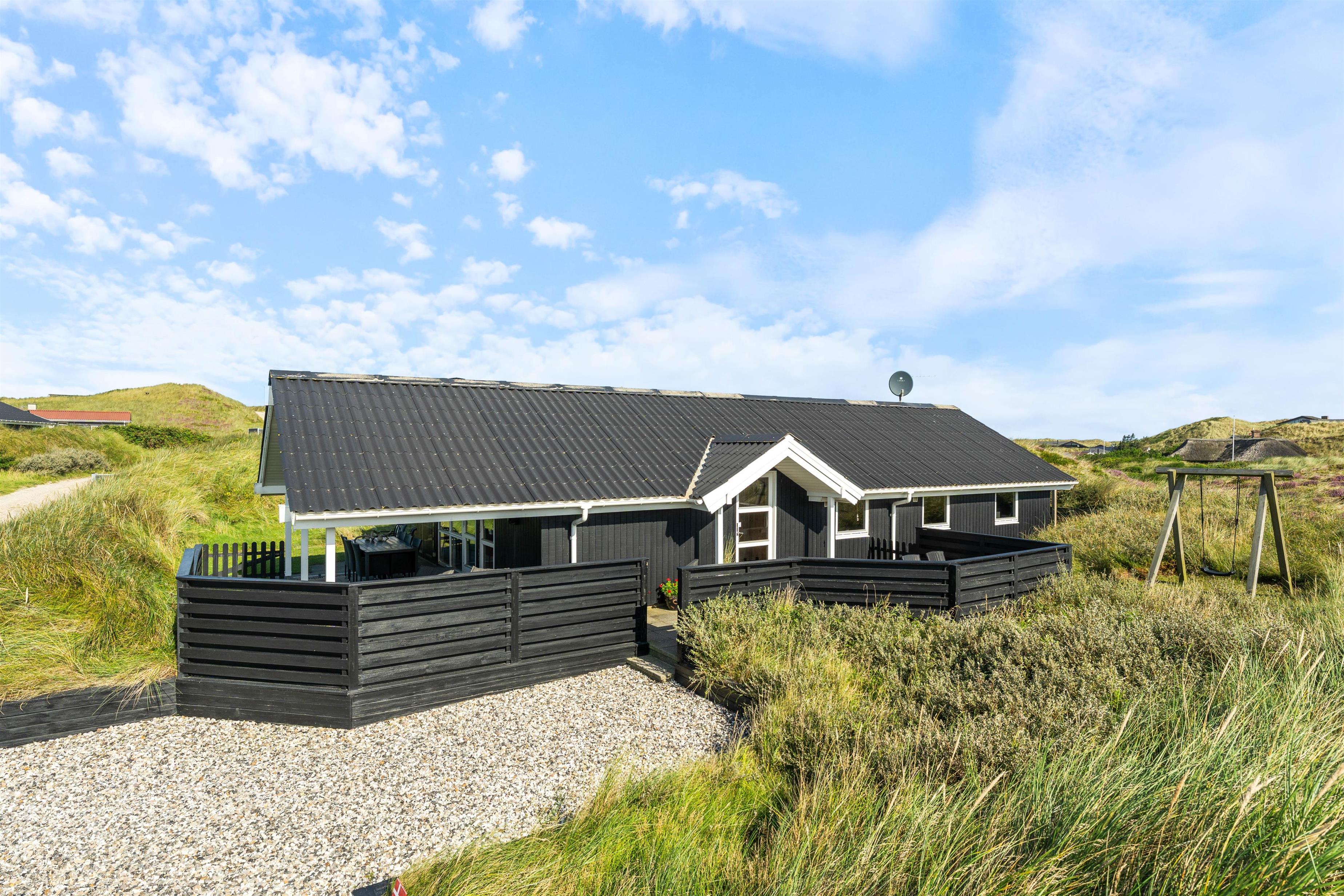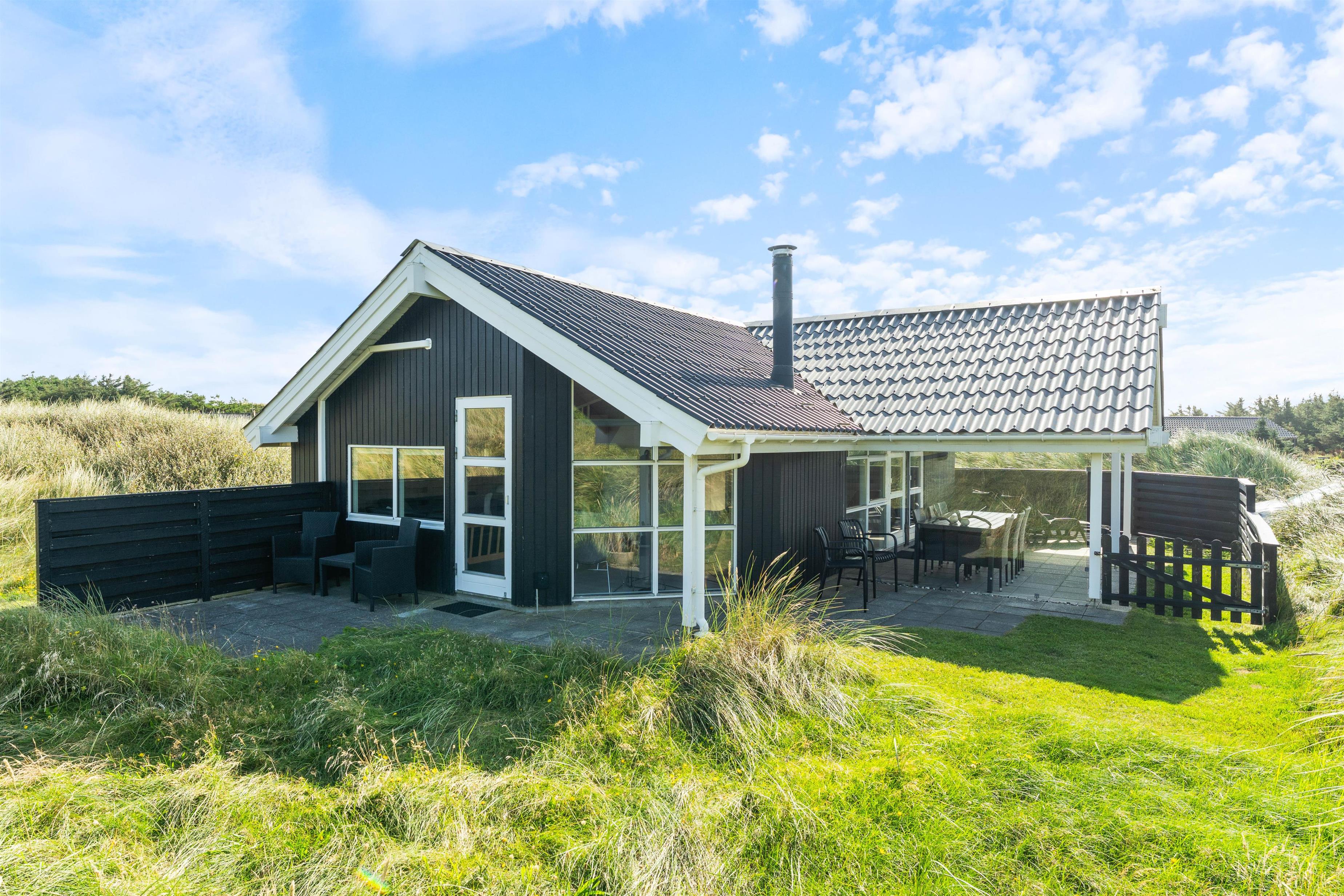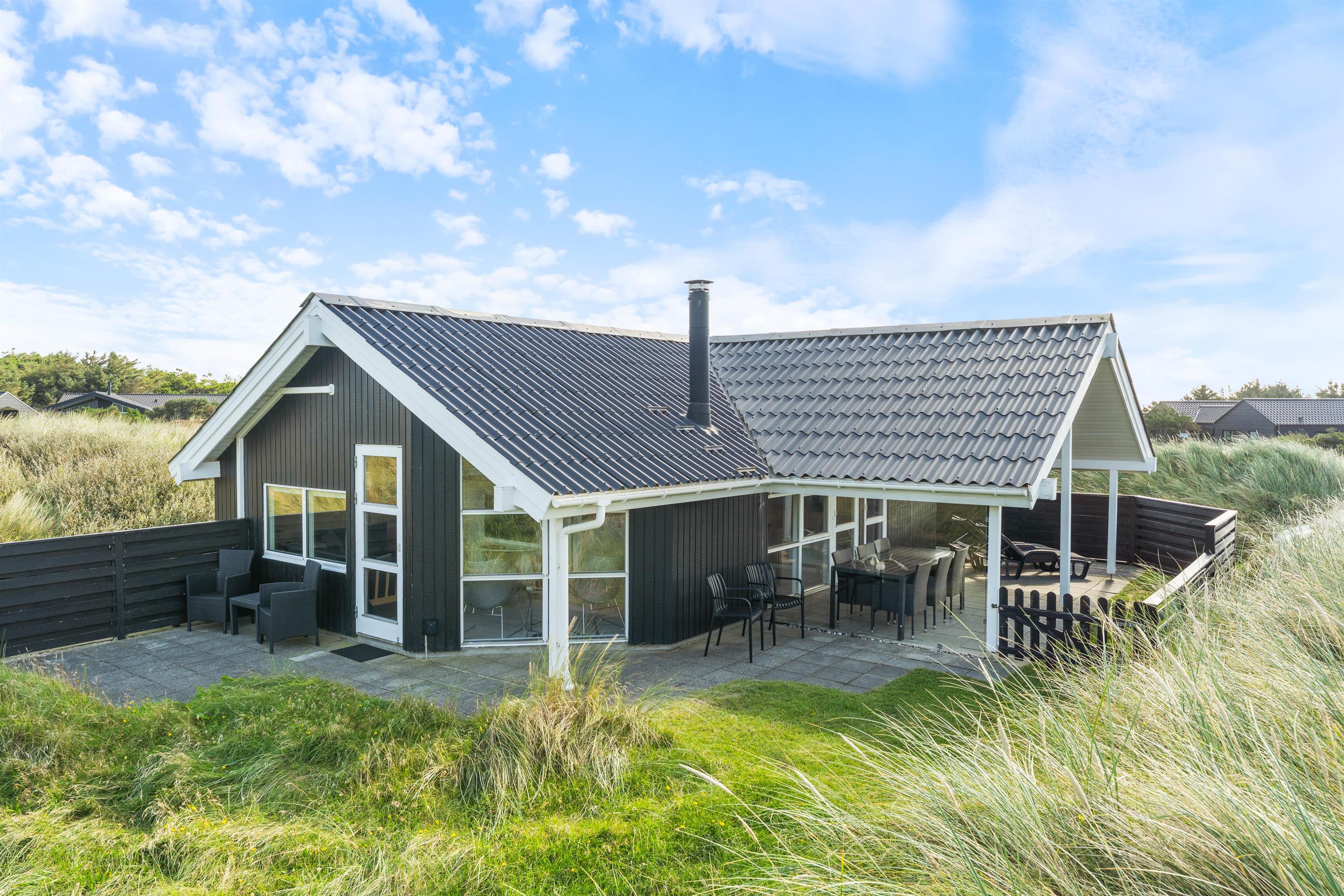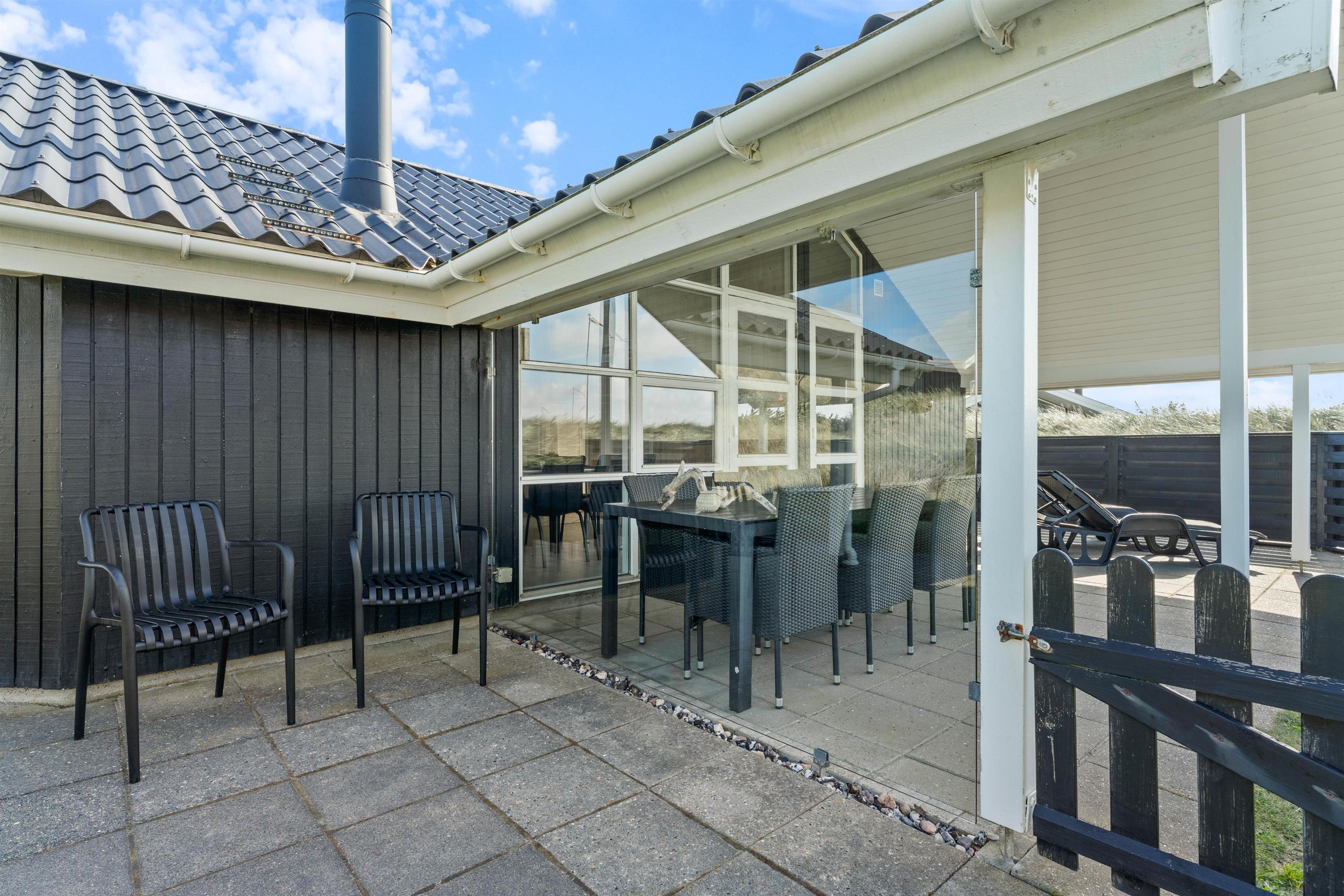 Terrassen løber næsten hele vejen rundt om huset og byder både på god afskærmning, en overdækket del og jeres egen lille græsplæne. En klitbanke rundt om huset sørger for yderligere læ og ugenerede dage i solen.