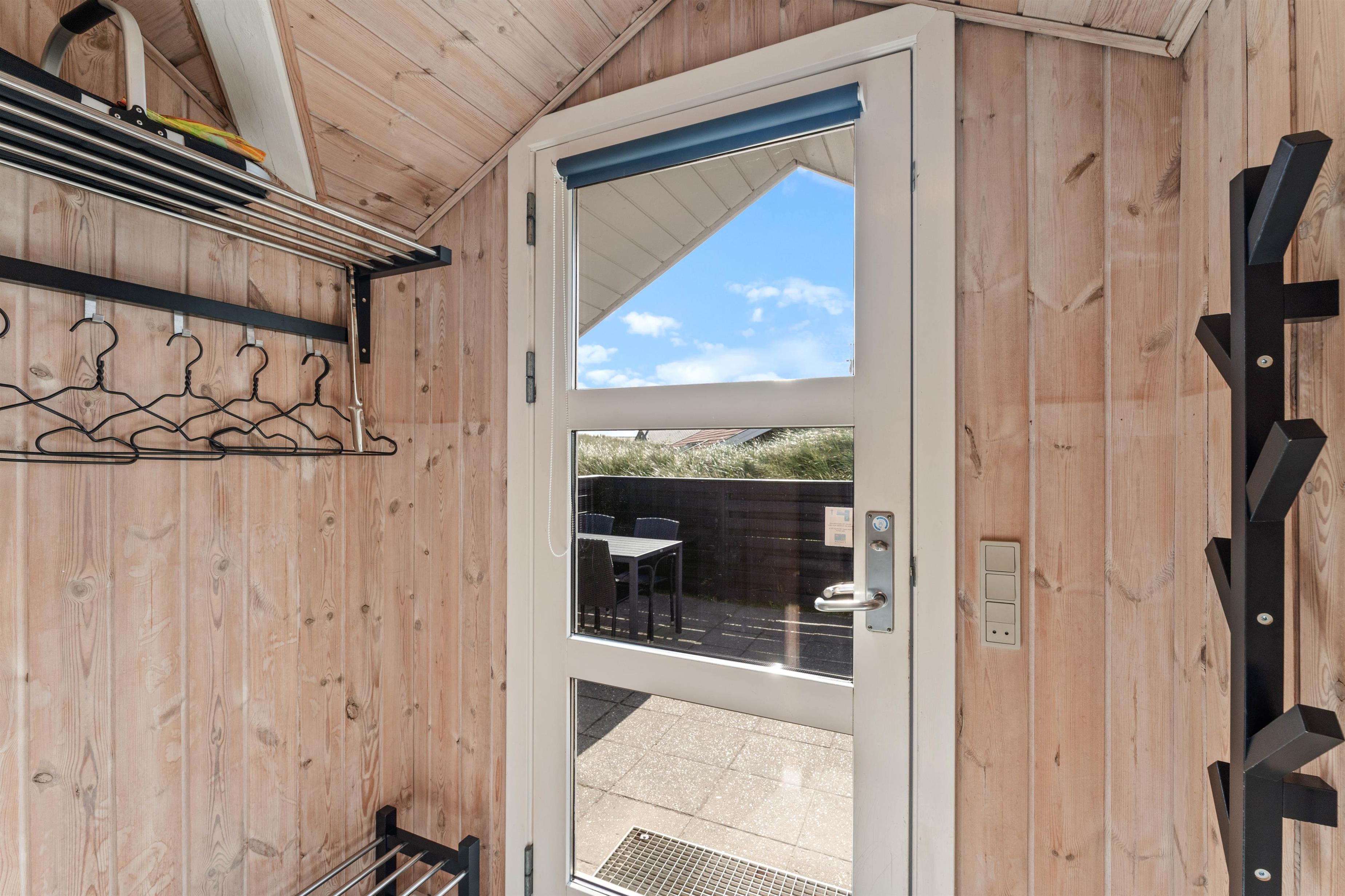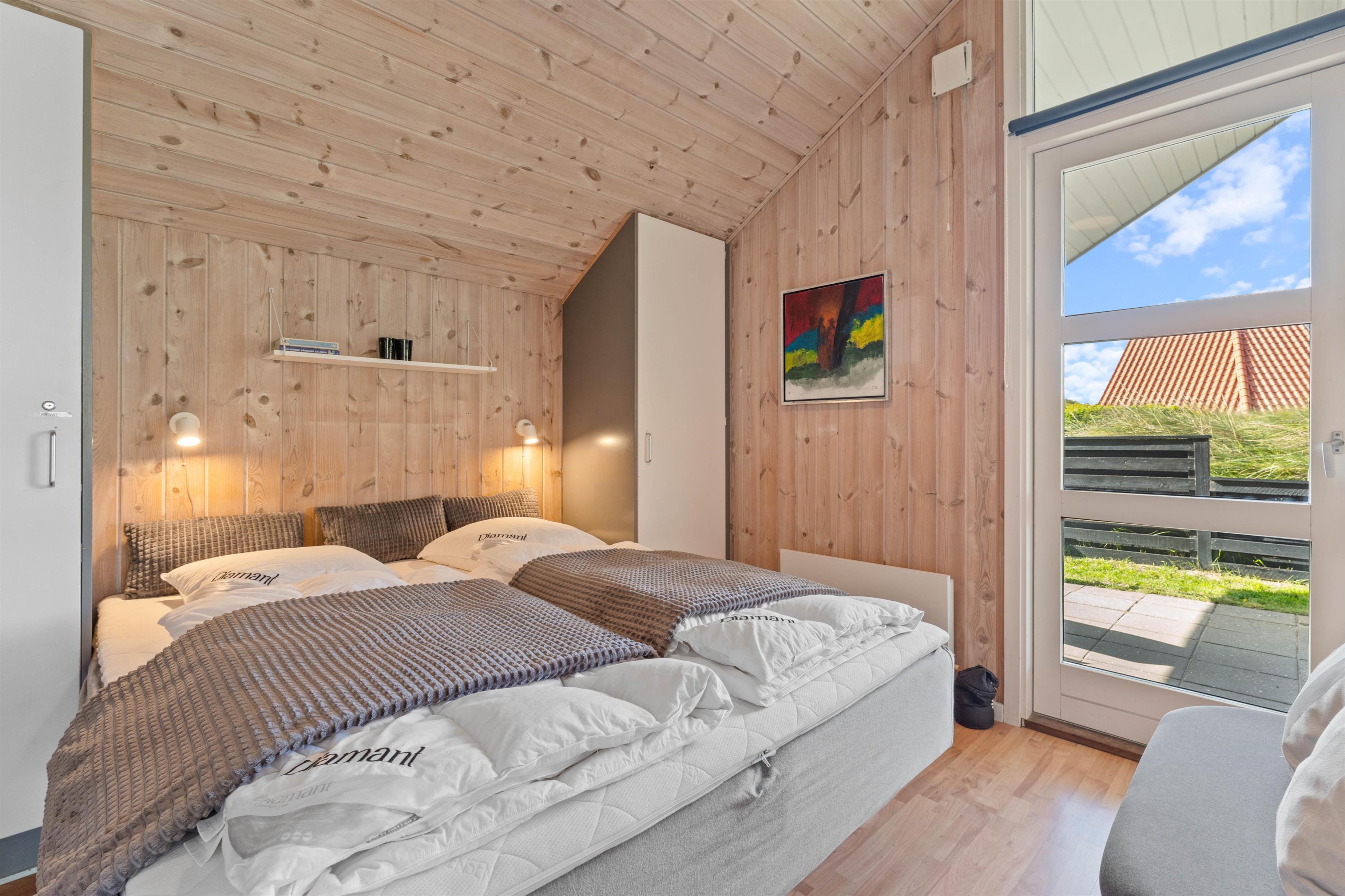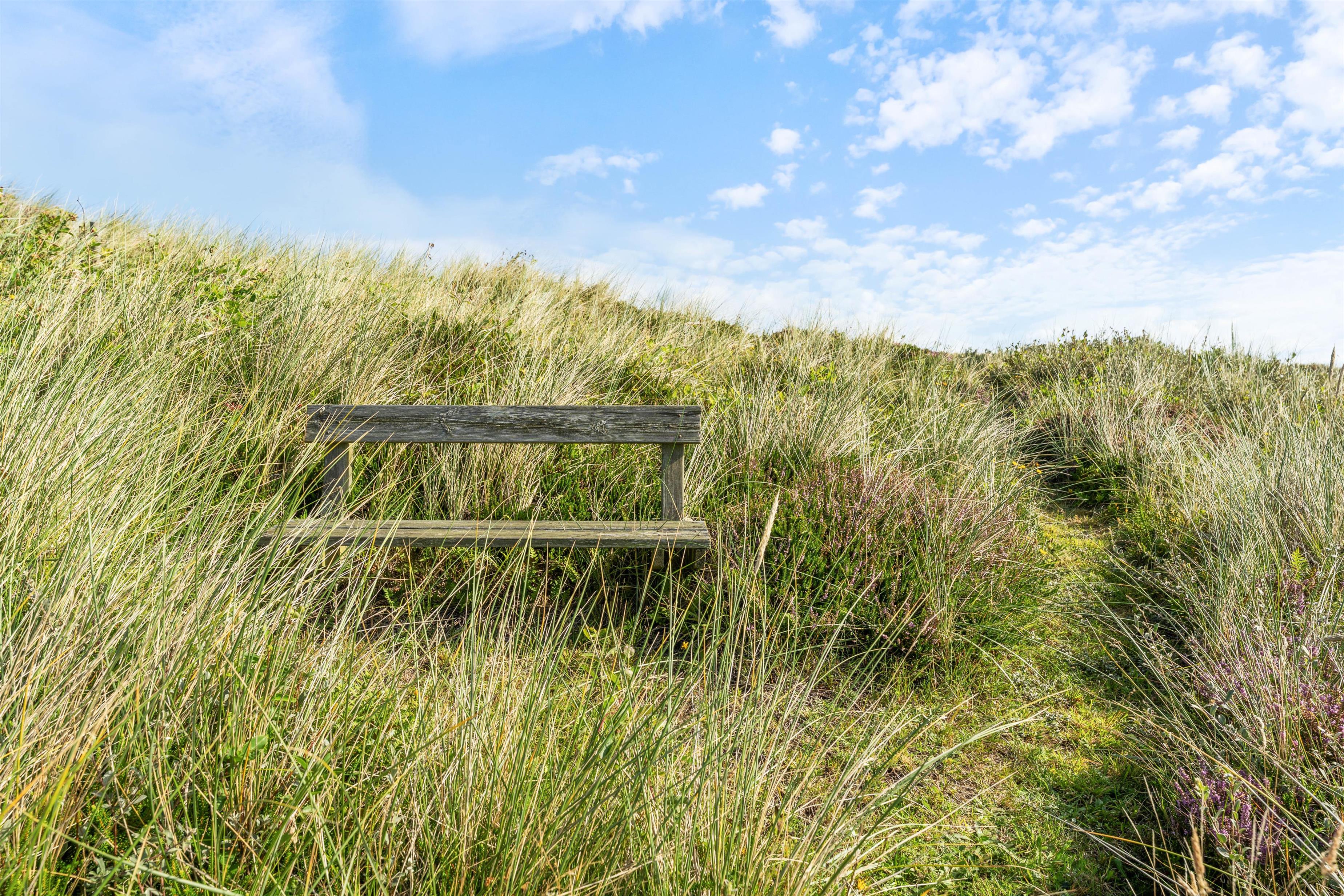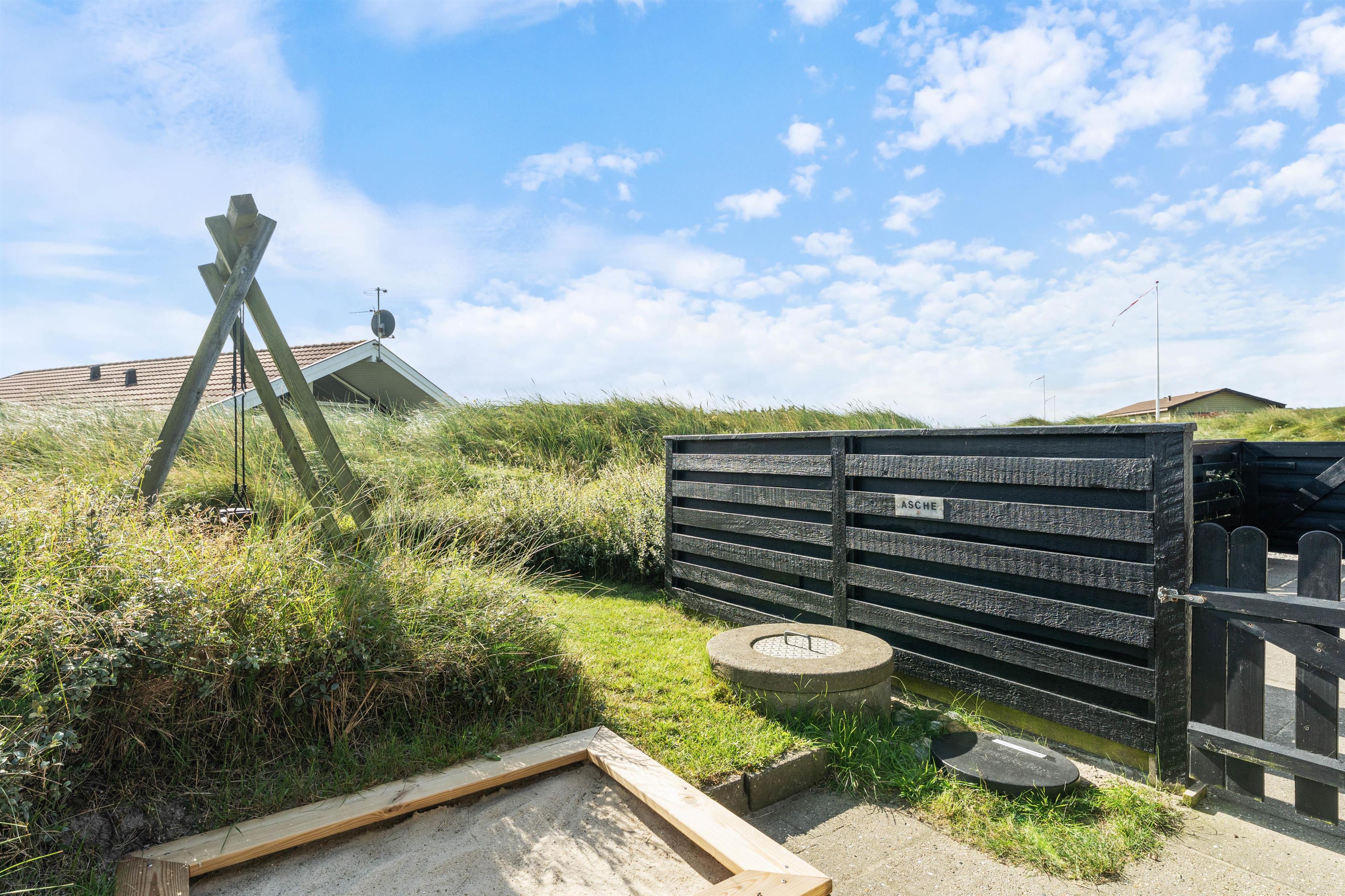 Terrassen løber næsten hele vejen rundt om huset og byder både på god afskærmning, en overdækket del og jeres egen lille græsplæne. En klitbanke rundt om huset sørger for yderligere læ og ugenerede dage i solen.