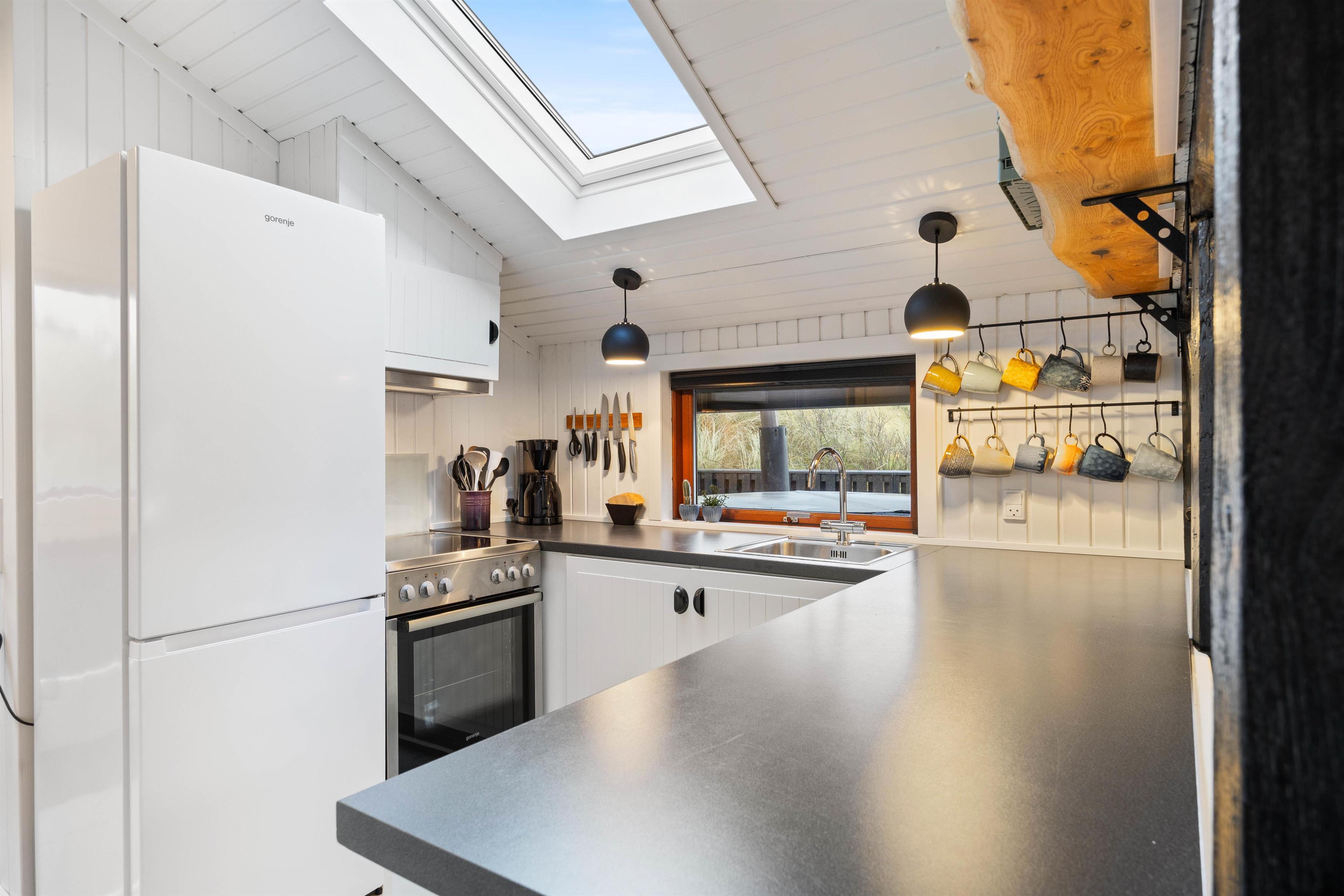 I køkkenalrummet i sommerhuset vil I hurtigt føle jer hjemme. Det veludstyrede køkken giver jer mulighed for at tilberede en mangfoldighed af lækre måltider med hjælp fra mikroovnen, den 50 liters fryser og opvaskemaskinen. Nyd jeres måltider omkring køkkenbordet, efterfulgt af en hyggelig aften i sofaområdet foran fjernsynet. Her kan I drage fordel af varmen fra brændeovnen, der tilfører ekstra sommerhuscharme til jeres ferie.