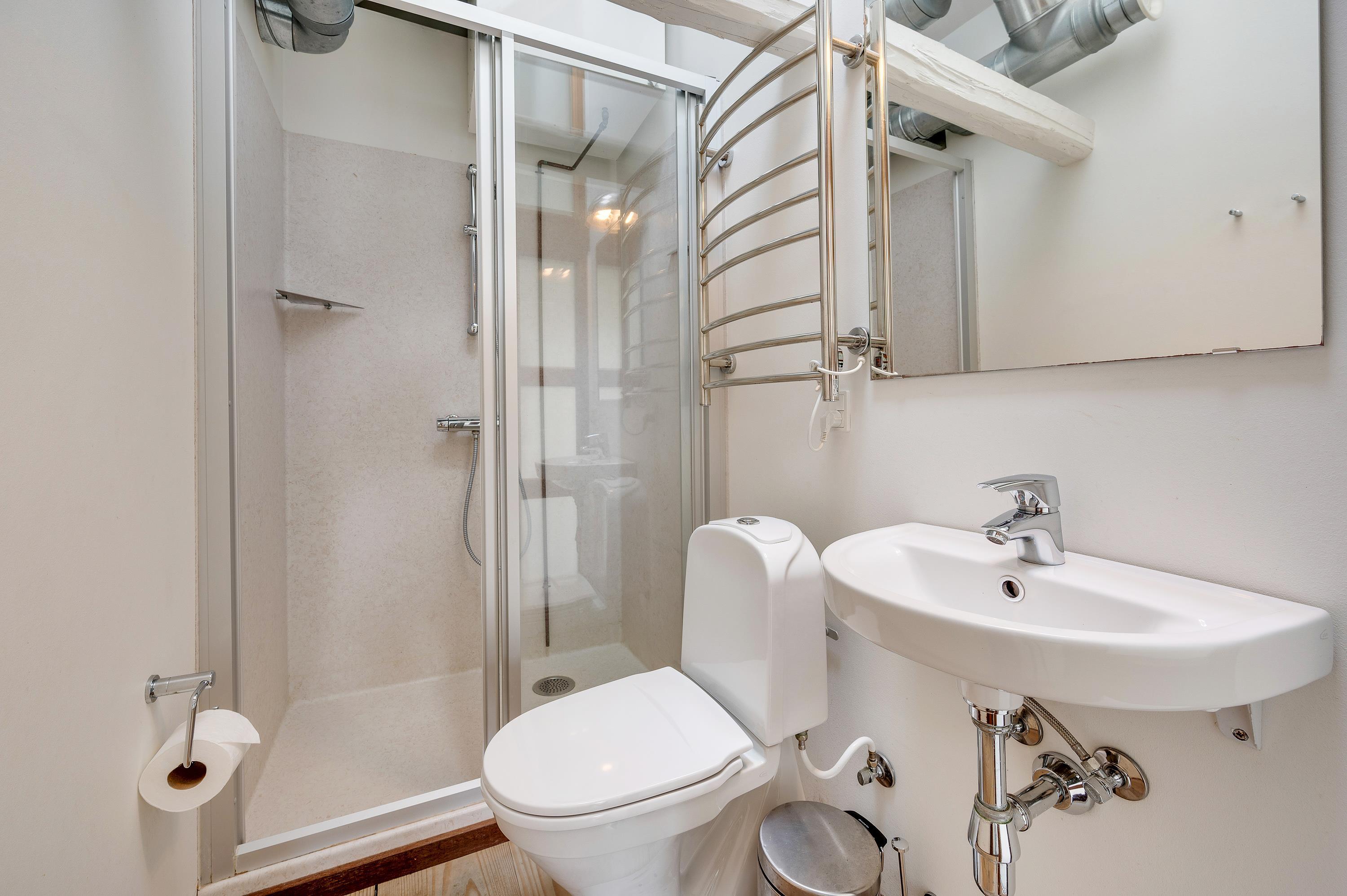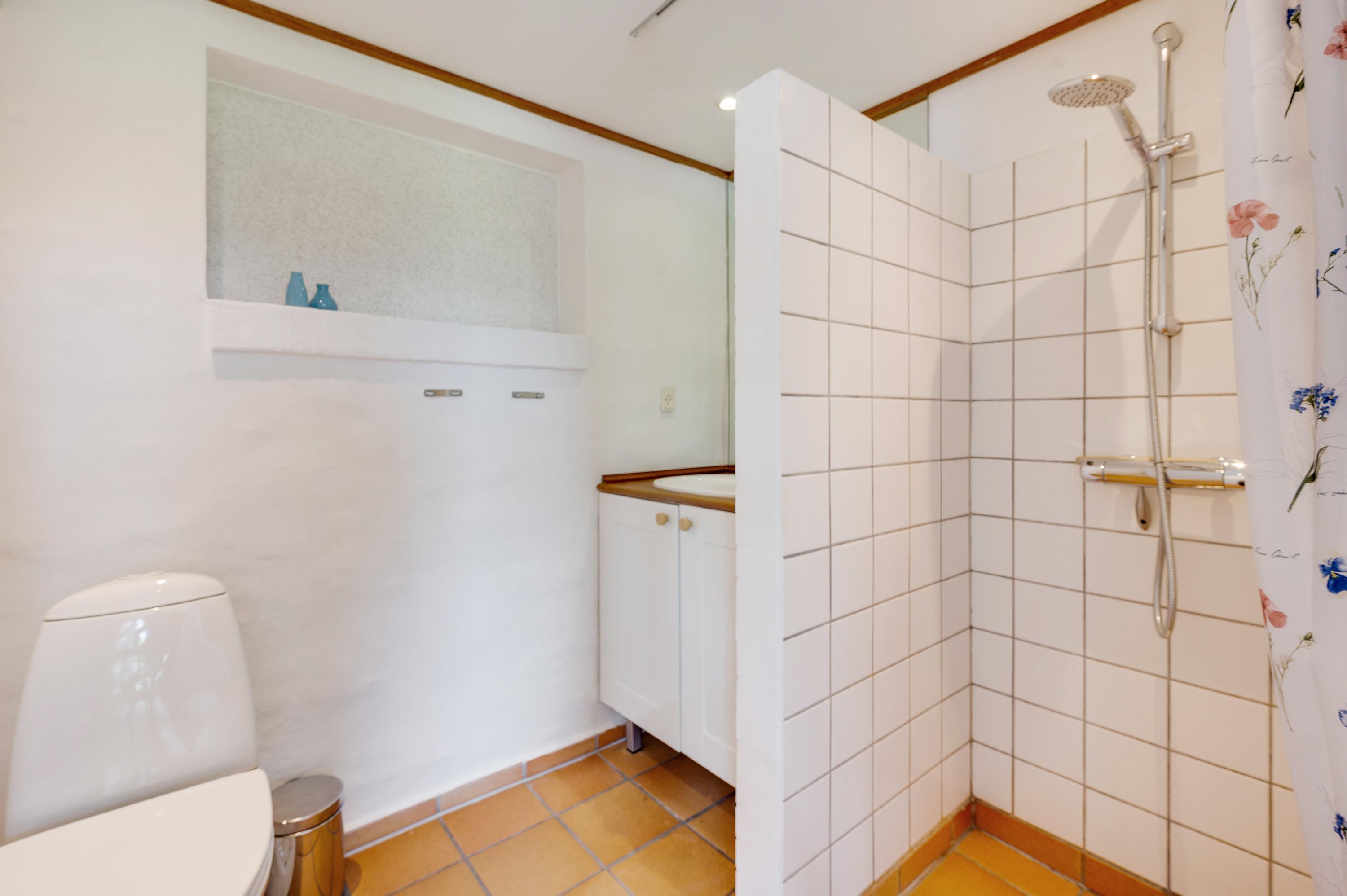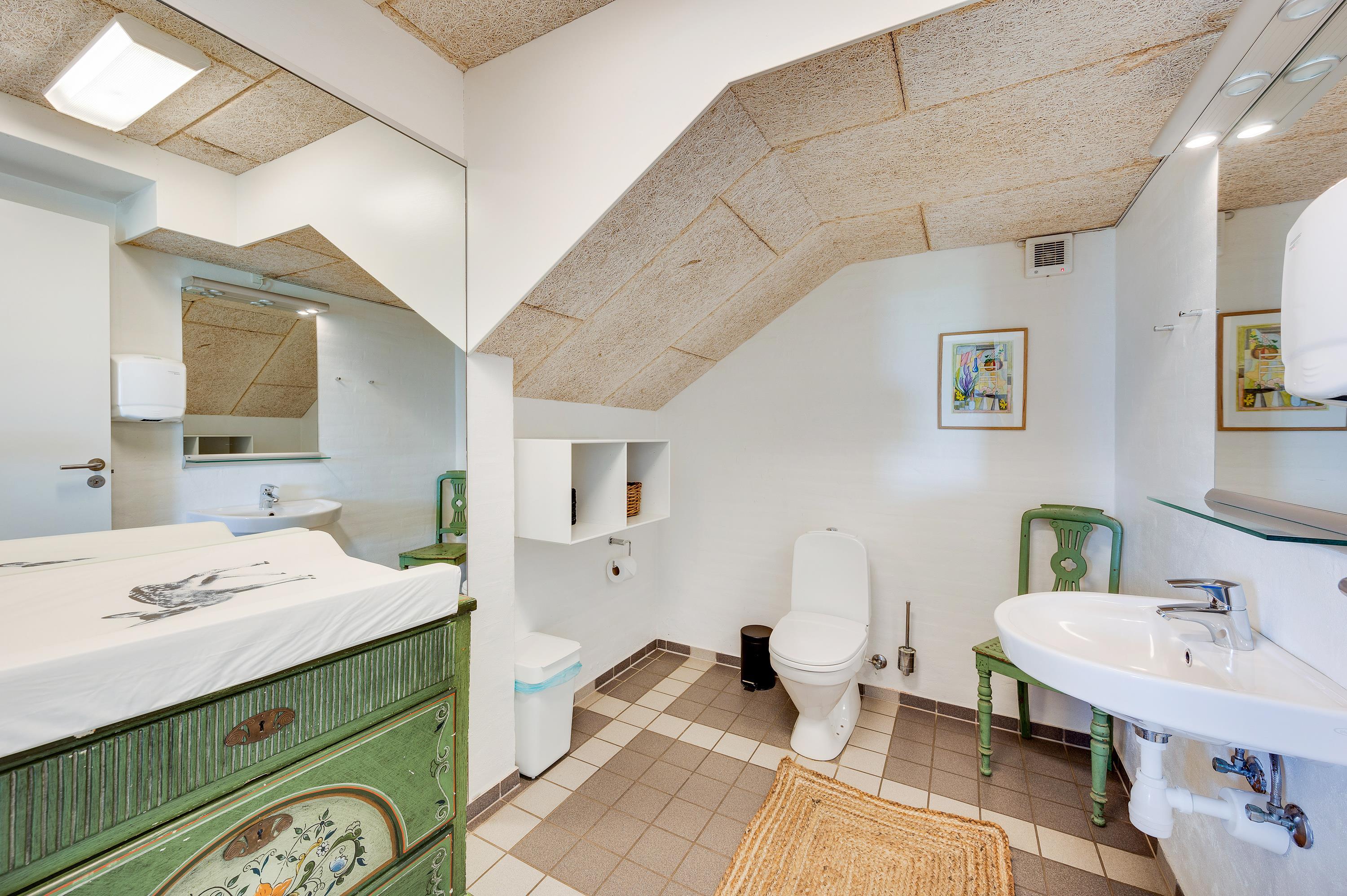 Der er I alt 7 badeværelser og 7 gæstetoiletter med gulvvarme. Heraf et bruserum med to private kabiner. Præstegården varmes primært op med den billige fjernvarme, men der er også en brændeovn hvis I synes det er hyggeligt.