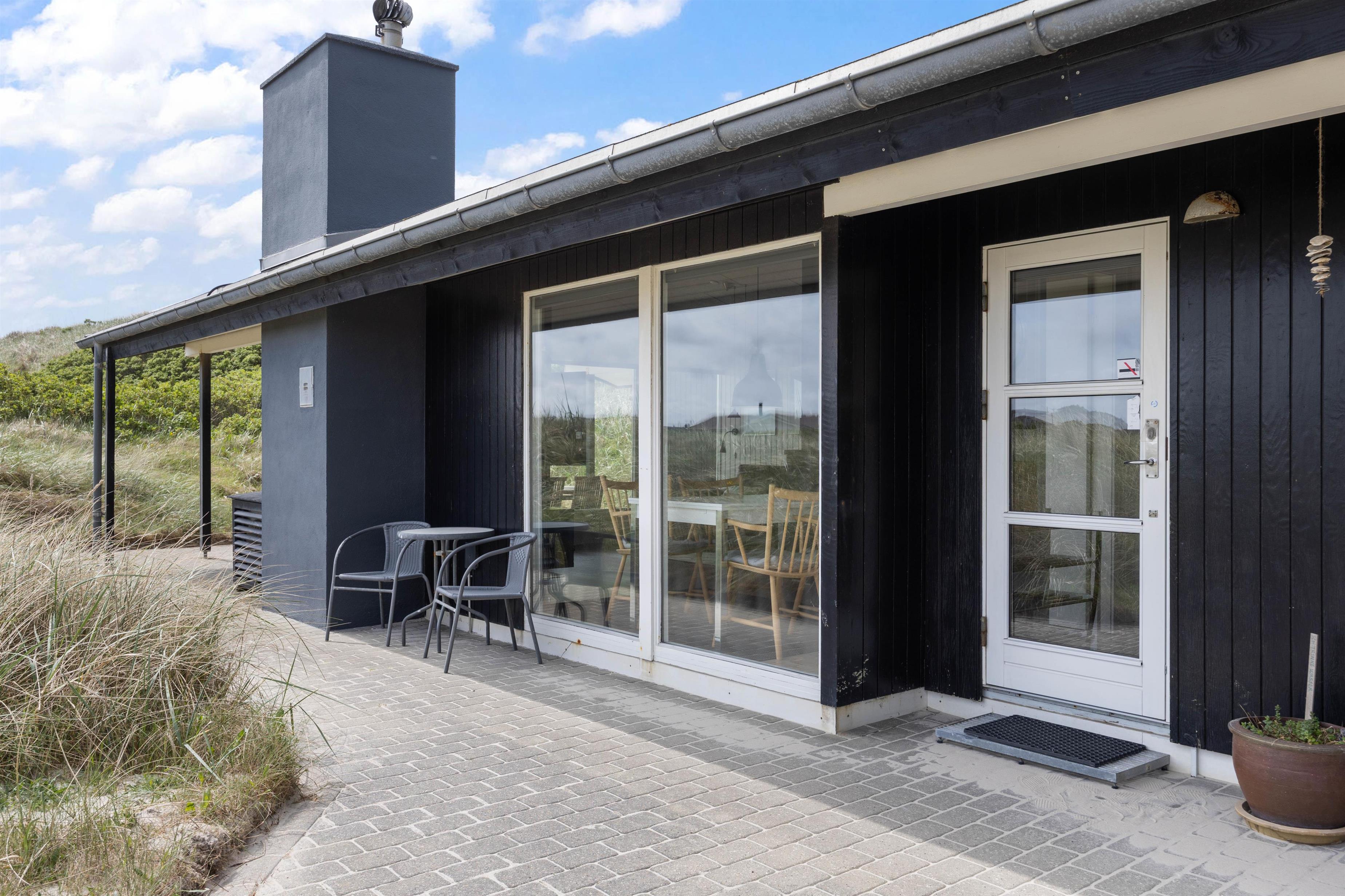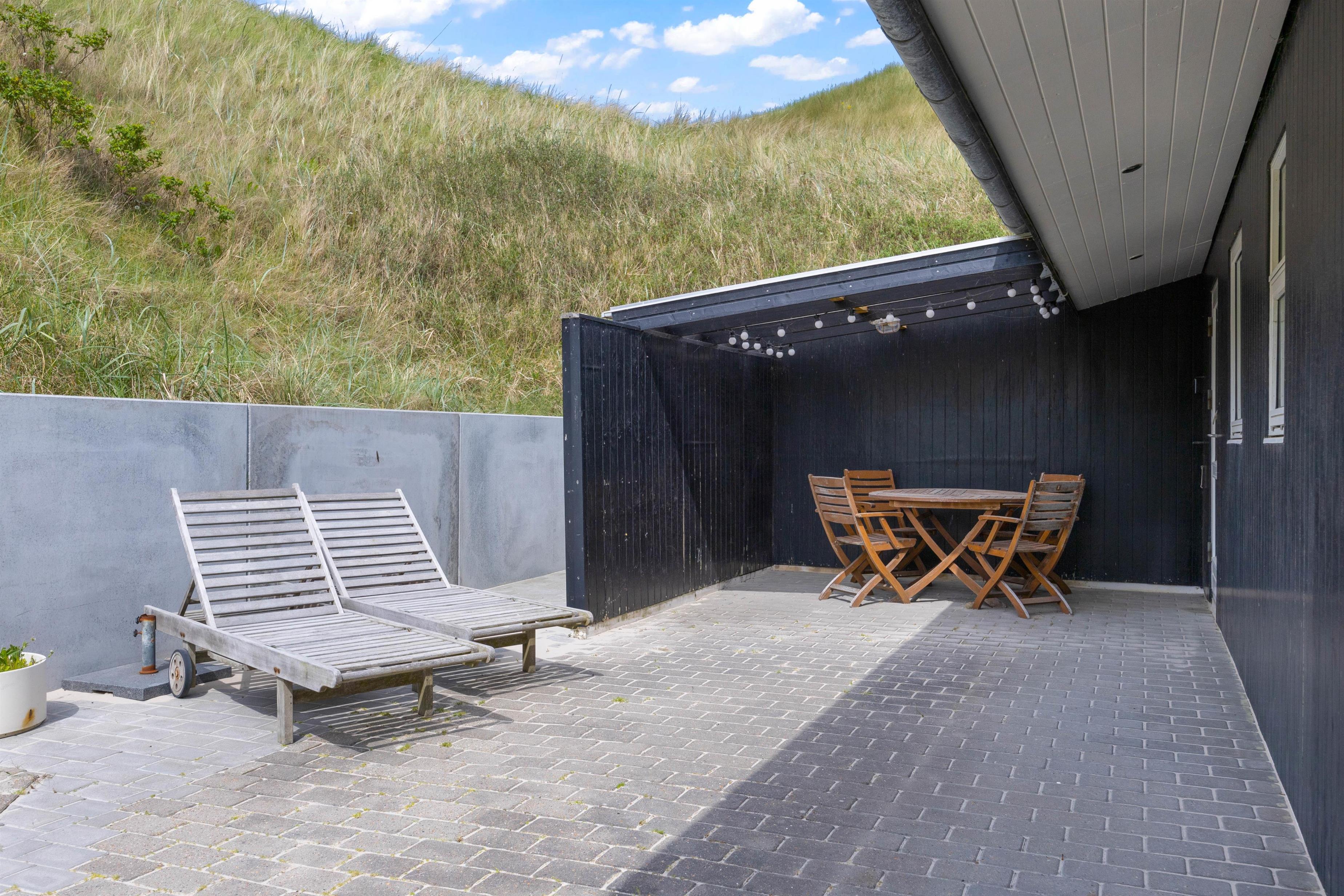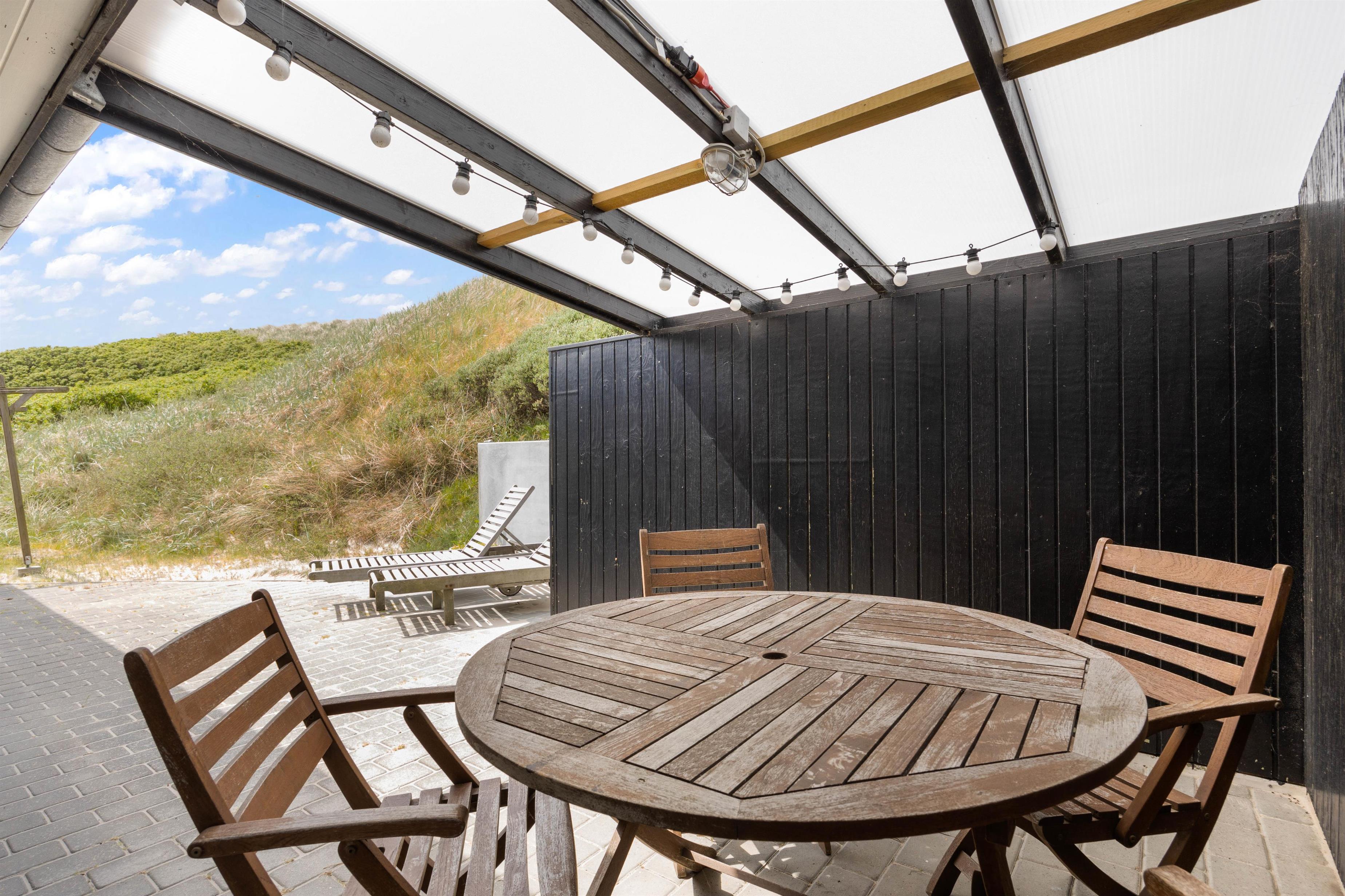Rundt om feriehuset finder I hele tre terrasser; en syd-/sydvestvendt, en østvendt og en vestvendt, som I kan nyde ferien og de varme solskinsdage på. Her kan I altid finde en god plet i solen, hvor I kan læne jer tilbage i liggestolene og sætte jer godt til rette i havemøblerne og slappe fuldstændig af. Den vestvendte terrasse ligger i læ af en klit, og er derfor helt perfekt på de dage, hvor der skulle være en frisk vind.