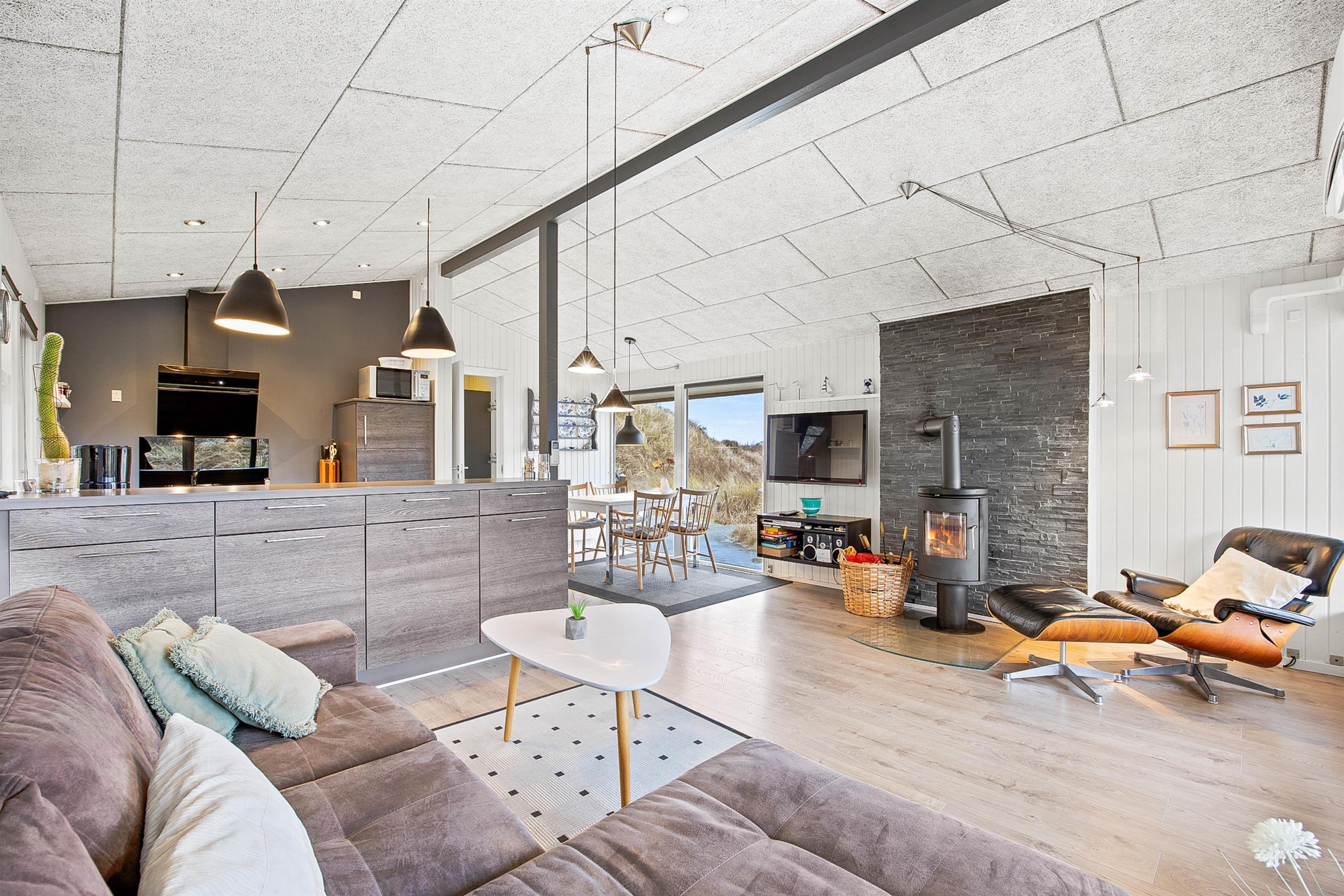 I stuen kan I tænde op i brændeovnen og skrue ekstra op for feriehyggen og varmen. Ellers sørger en energivenlig varmepumpe for et godt indeklima i feriehuset.
