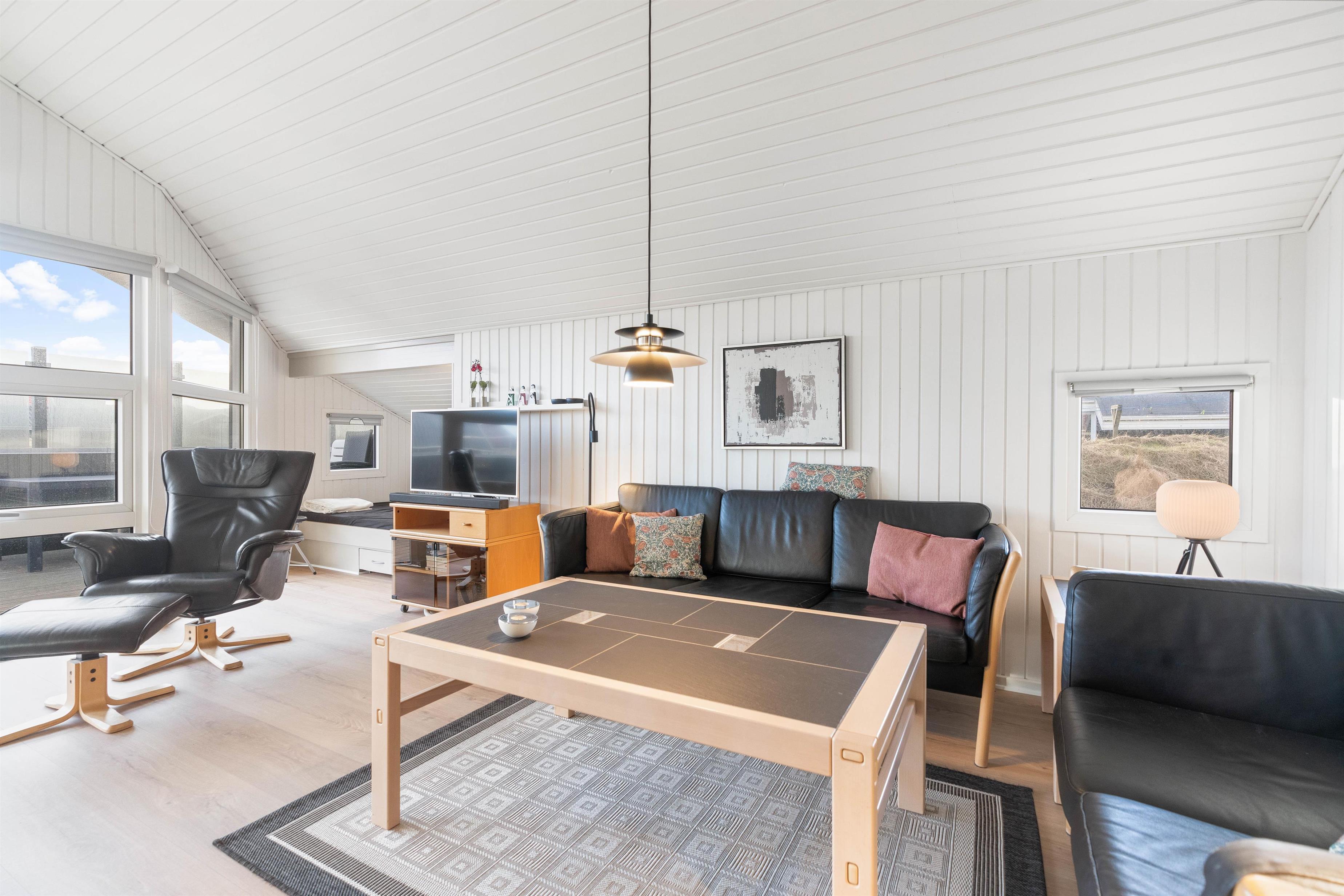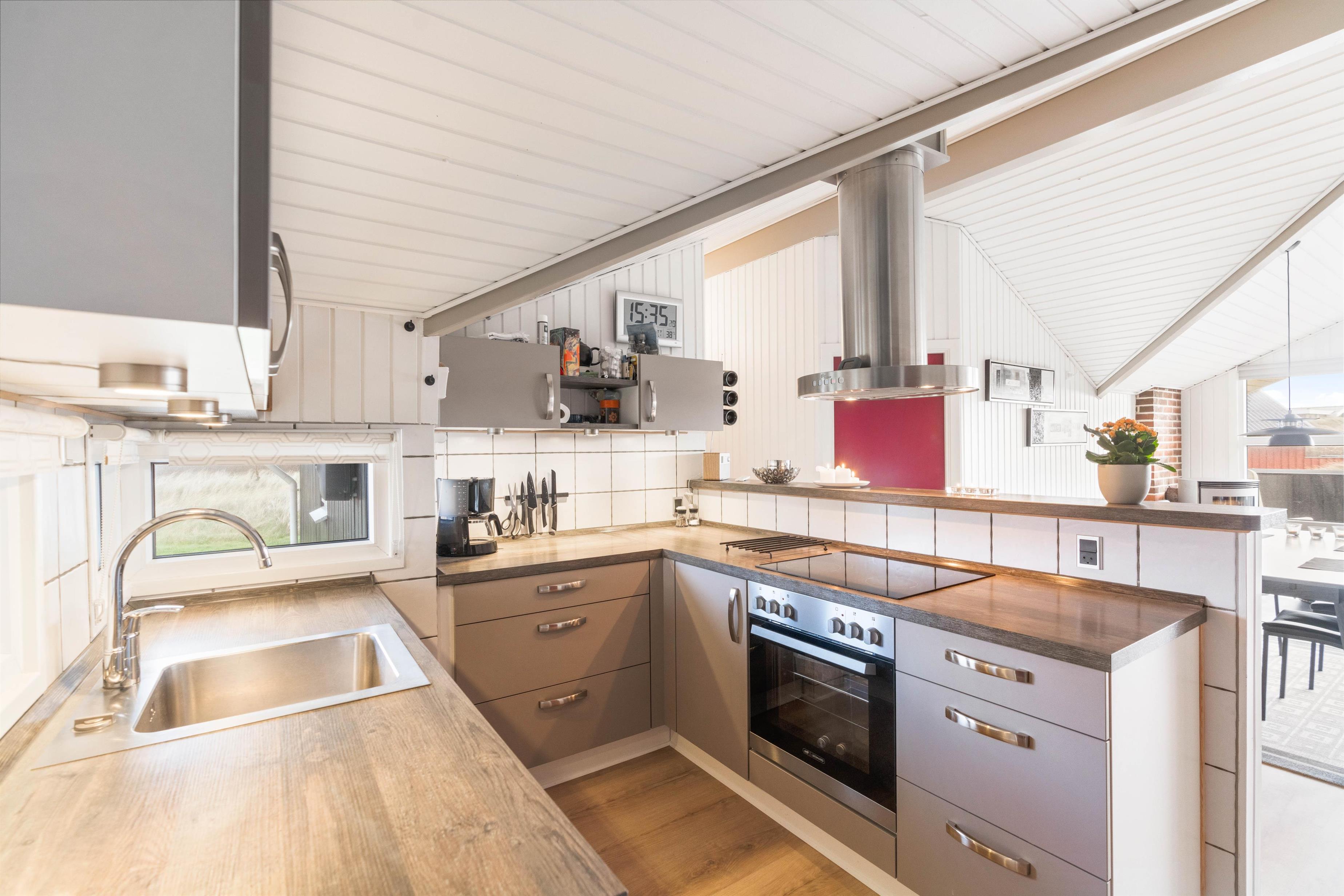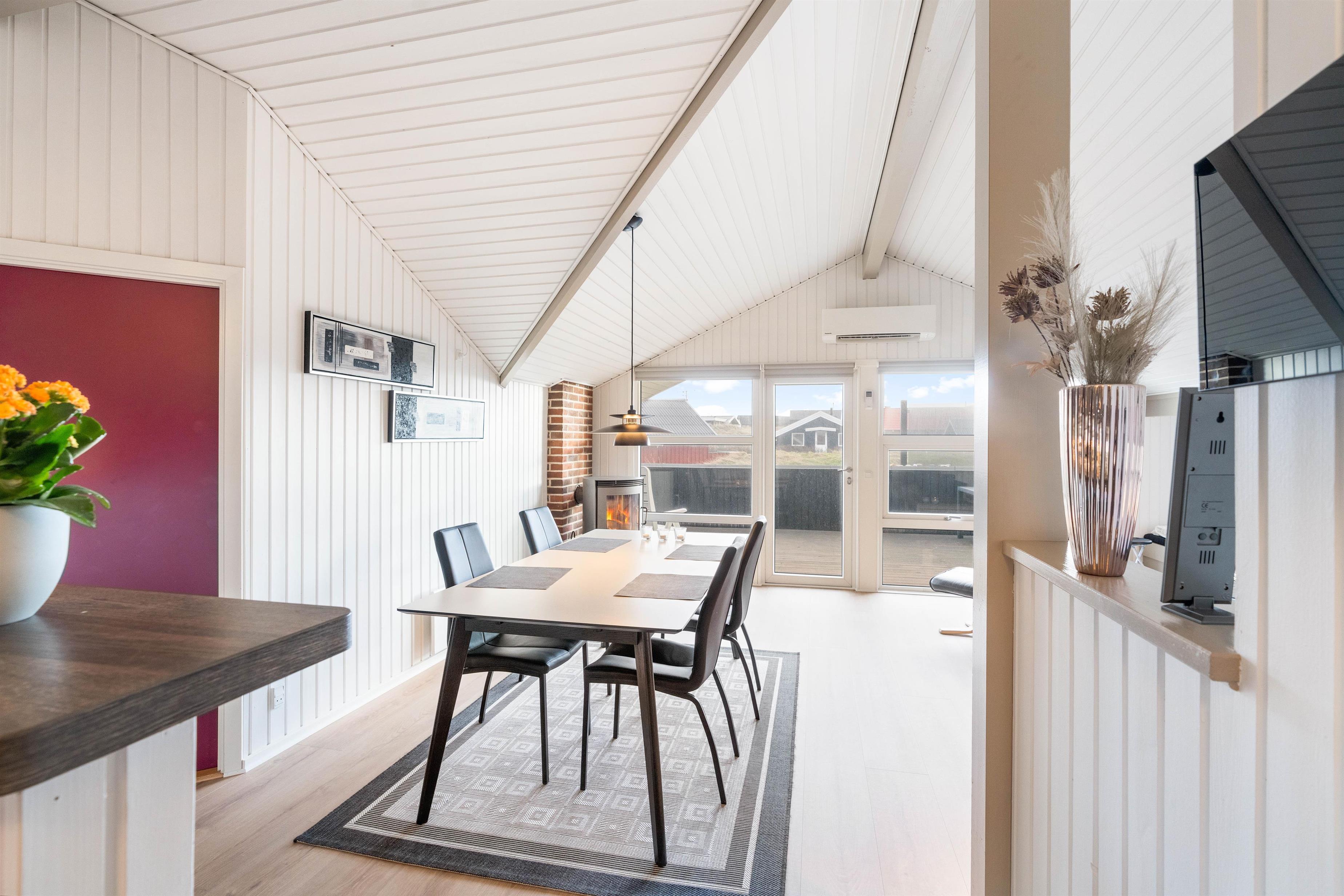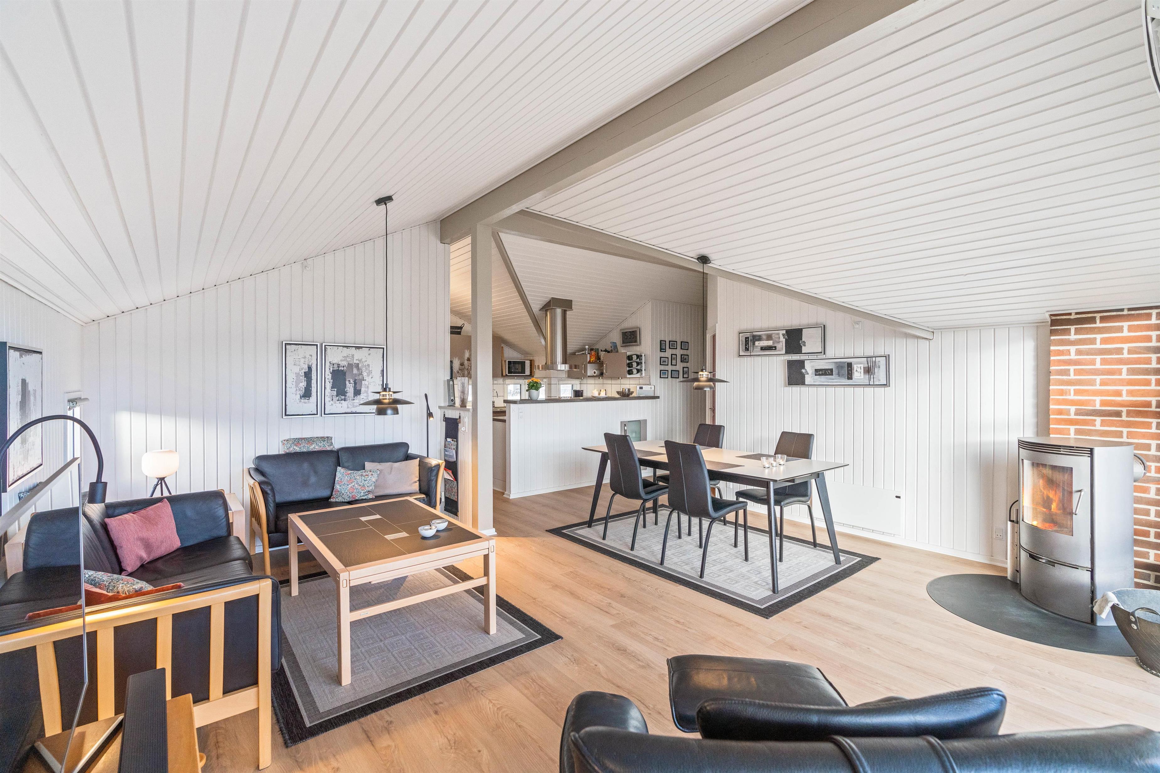 Husets spise- og opholdsstue er lyst og venligt indrettet med gode, komfortable møbler. Huset er på alle måder et dejligt fristed, hvor familien kan hygge sig og skabe gode ferieminder – både inde og ude. De lyse træbeklædte vægge og lofter løfter taget og giver en skøn fornemmelse af mere plads. I sofaen kan I samles med popcorn og lave en hyggelig filmaften, idet I kan streame alverdens film via husets Chromecast. Samtidig kan I nyde varmen fra de knitrende flammer i husets brændeobn.