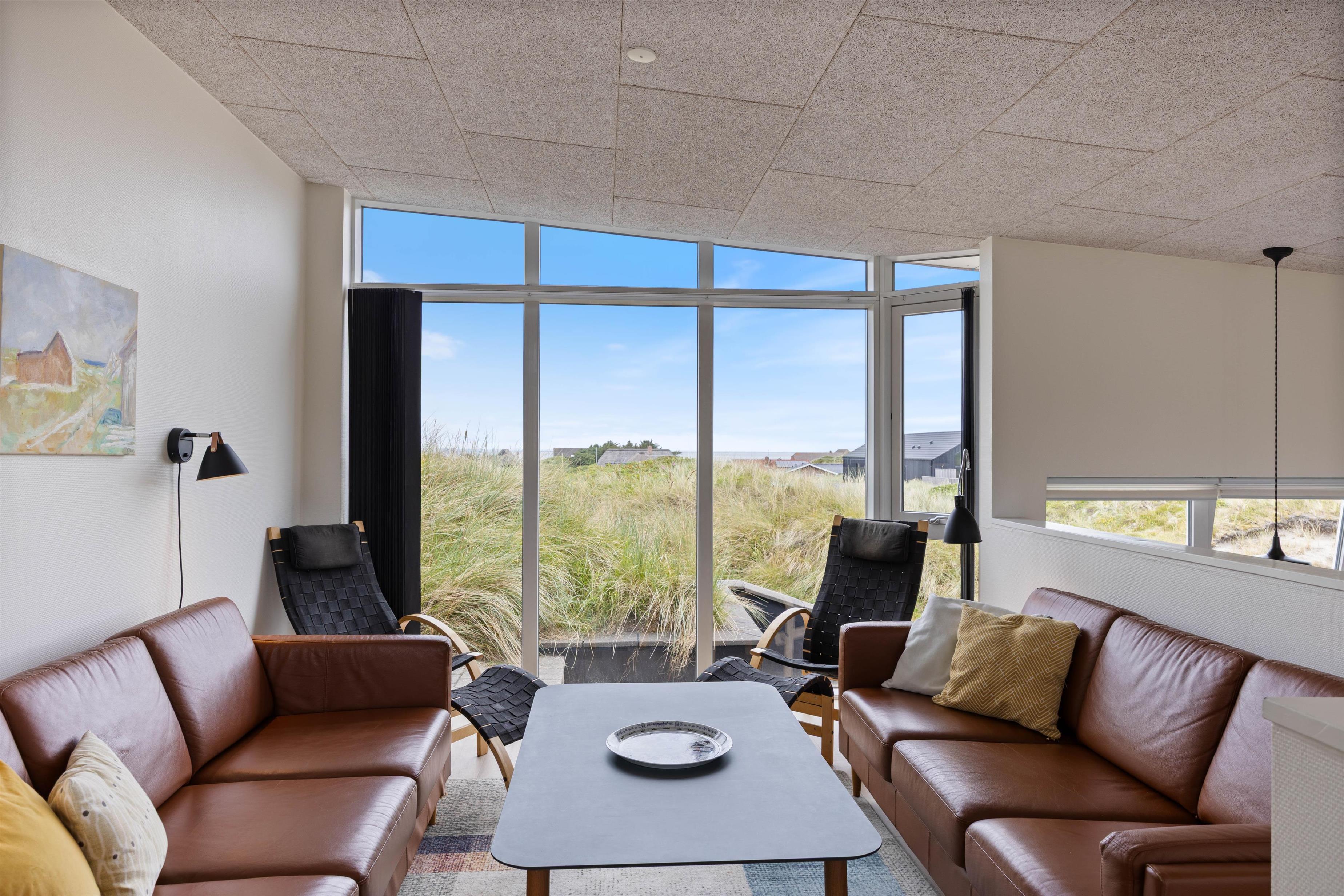 Den varierende natur og feriehusets forskudte plan skaber masser af ”hyggerum” og gode terrasser rundt om huset. Der er plads til alle – til morgenkaffe på den østvendte terrasse, hvor I kan nyde solopgangen over Ringkøbing Fjord, og til en hyggelig grillaften på den store og ugenerede terrasse med den flotte panoramaudsigt over klitterne mod vest. I det varme vejr kan I holde drikkevarerne kolde ved hjælp af den indebyggede isterningemaskine, som I finder i køleskabet.