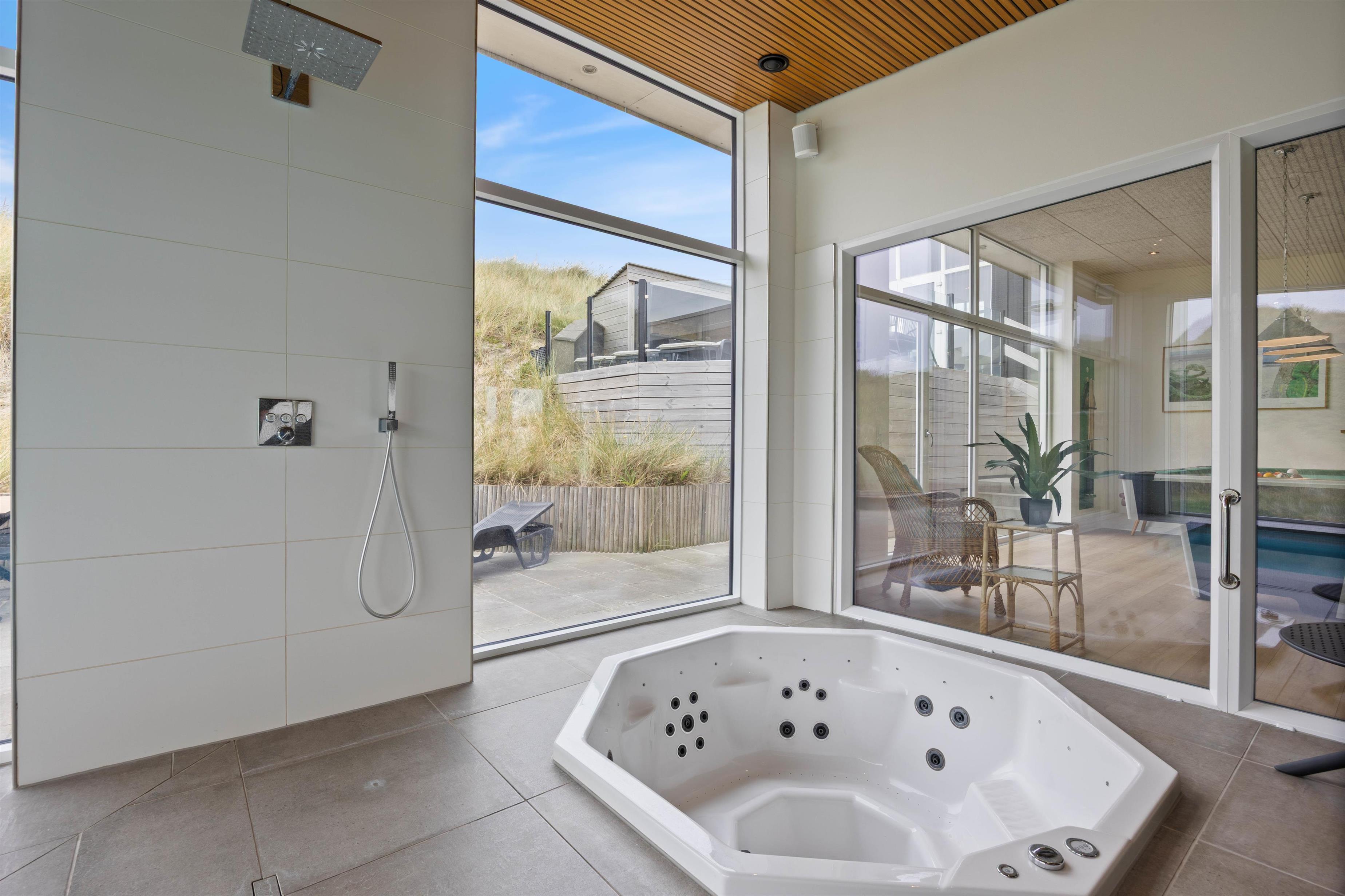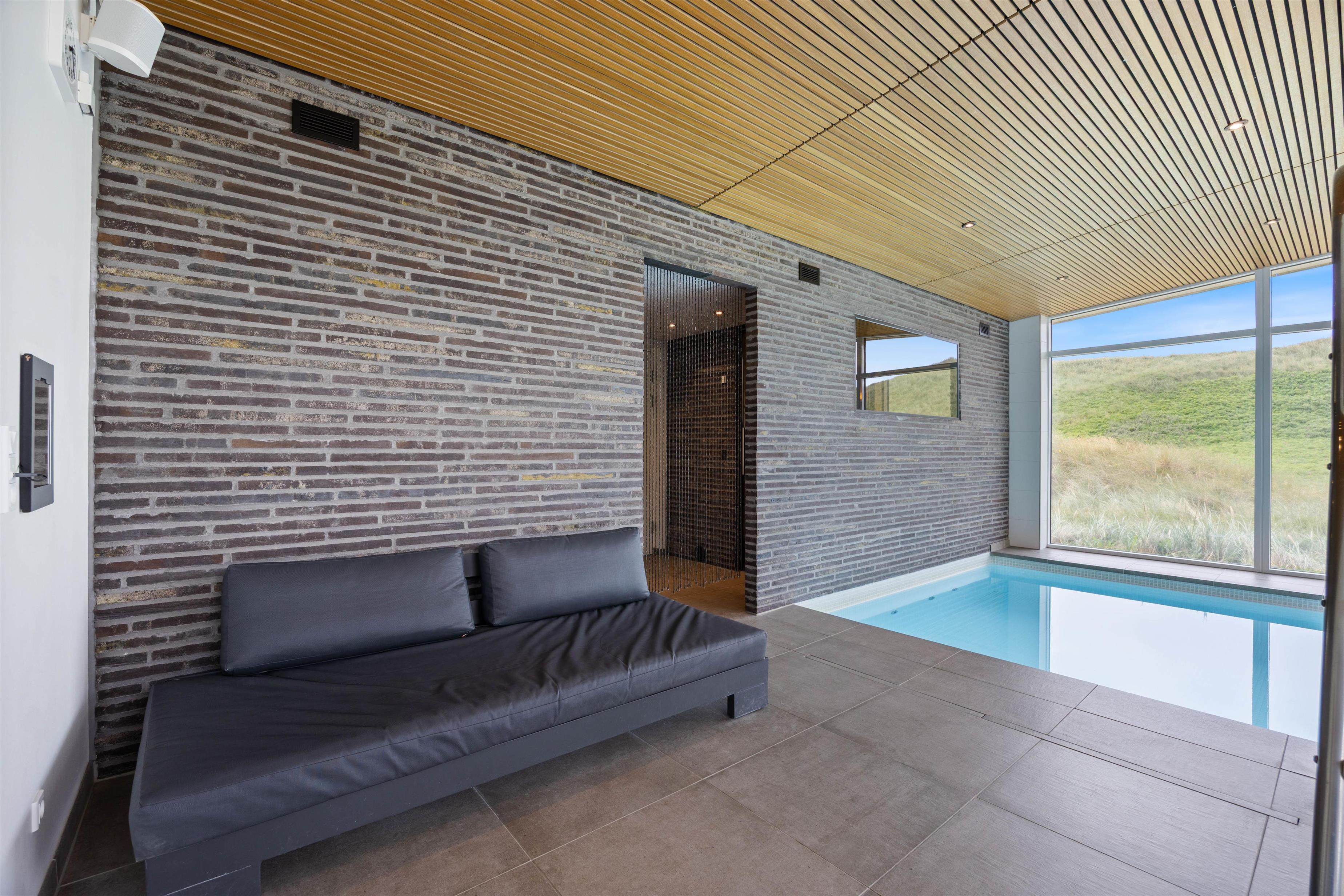 Det flotte poolområde er et sandt mekka for alle vandglade børn - og voksne. Den 18 kvadratmeter store pool er bygget i 2020 med en helt ny teknologi, som betyder, at poolen er godt isoleret og dermed har et meget lille varmeforbug. Er du ikke til den vilde leg i vandet, kan du nyde den store 7 personers-spa, mens du holder øje med børnene i poolen eller nyder det flotte klitlandskab lige uden for de store vinduer. Slap af og lad jer gennemvarme i saunaen efter al vandlegen.