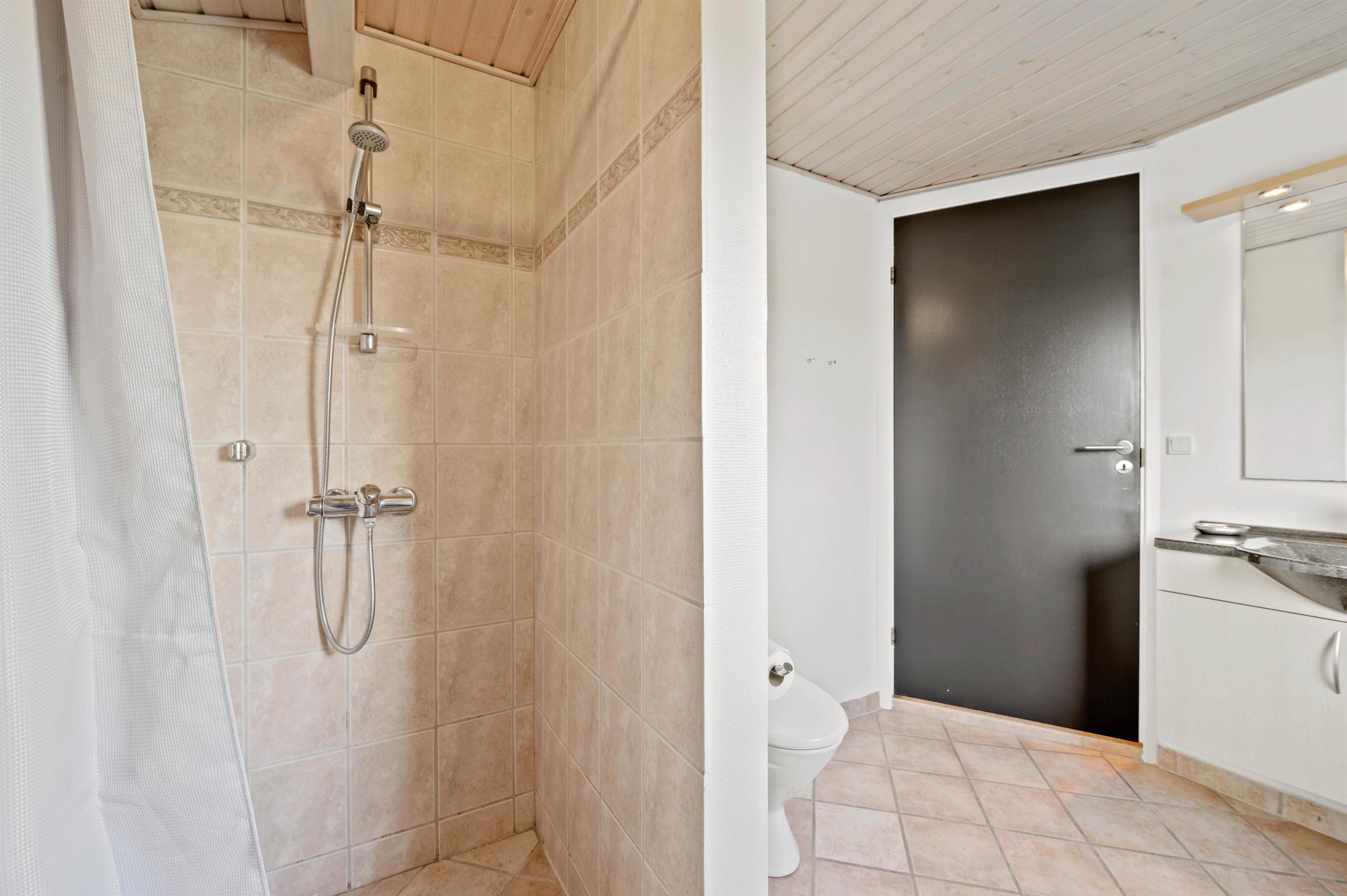 Efter en lang tur ved stranden, eller en kold efterårsdag. Vil man i sommerhusets store lyse badeværelse have mulighed for at blive opvarmet med gulvvarmen eller den lune træbeklædte sauna som også er til at finde på badeværelset.