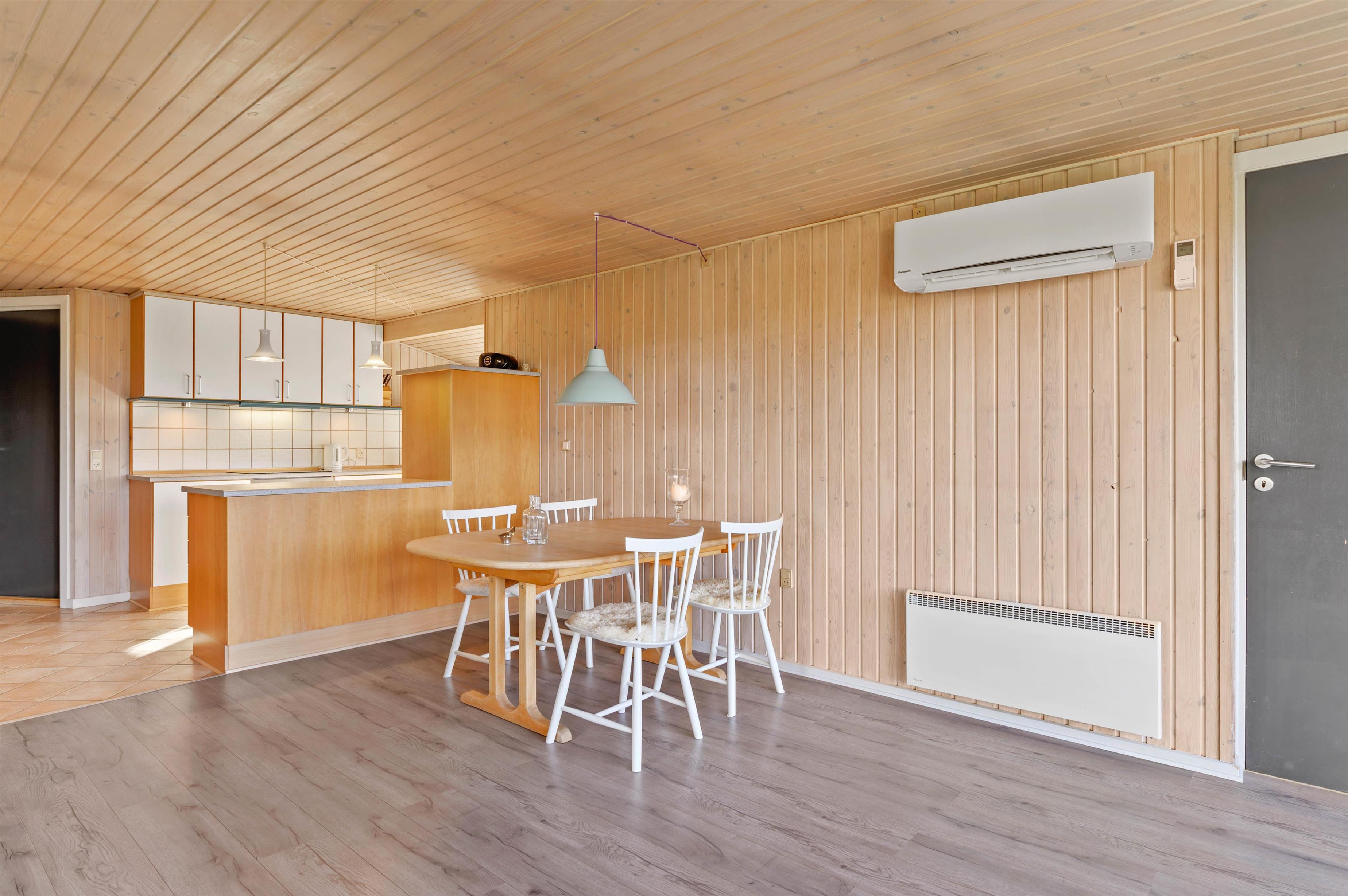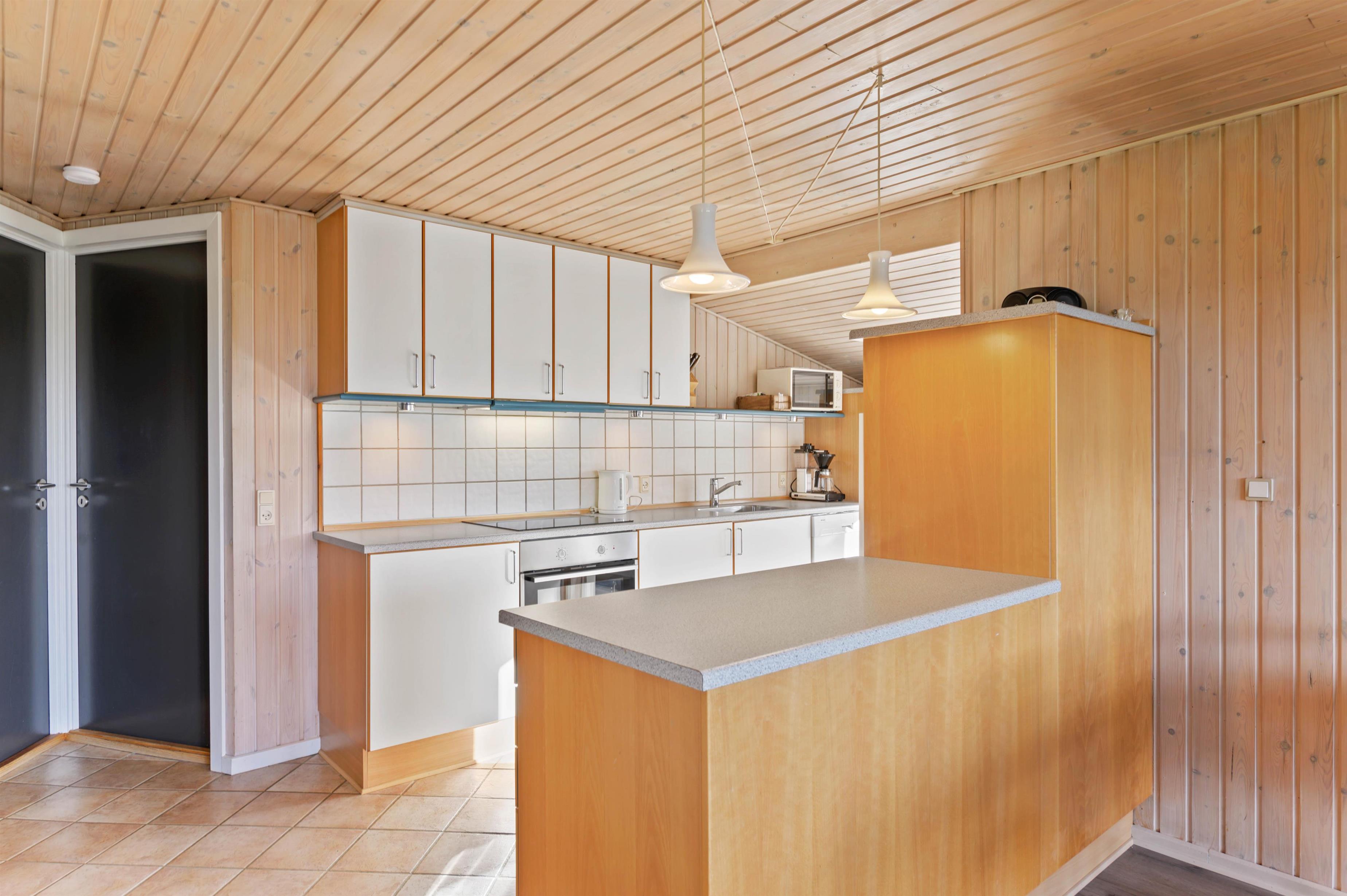 I køkkenalrummet som udgør hjertet af huset, finder man sommerhusets store gulv til loft vinduer som lyser hele rummet op med et naturligt lys. Køkkenet er udstyret med en vaskemaskine, som kan klare opvasken for jer, så I kan få mest muligt ud af jeres tid sammen.