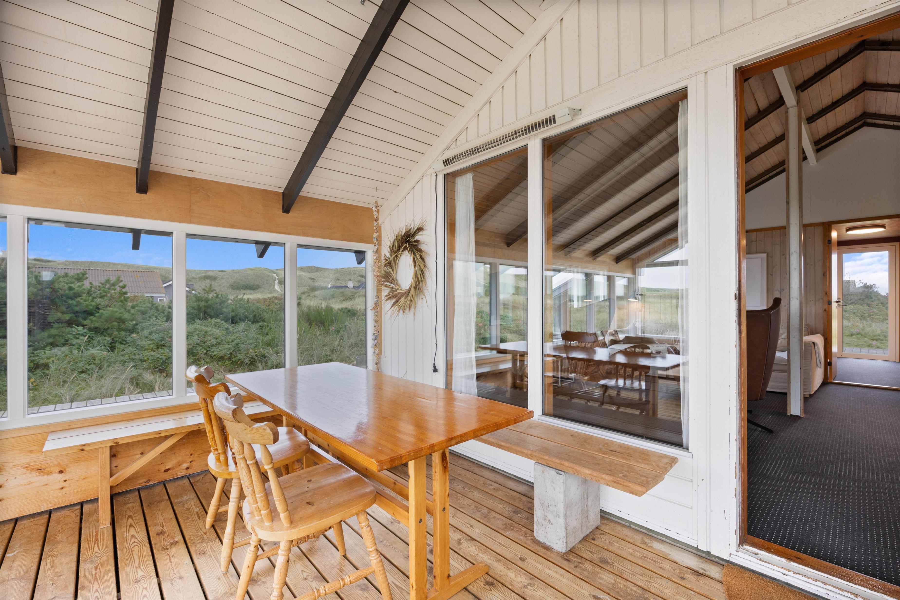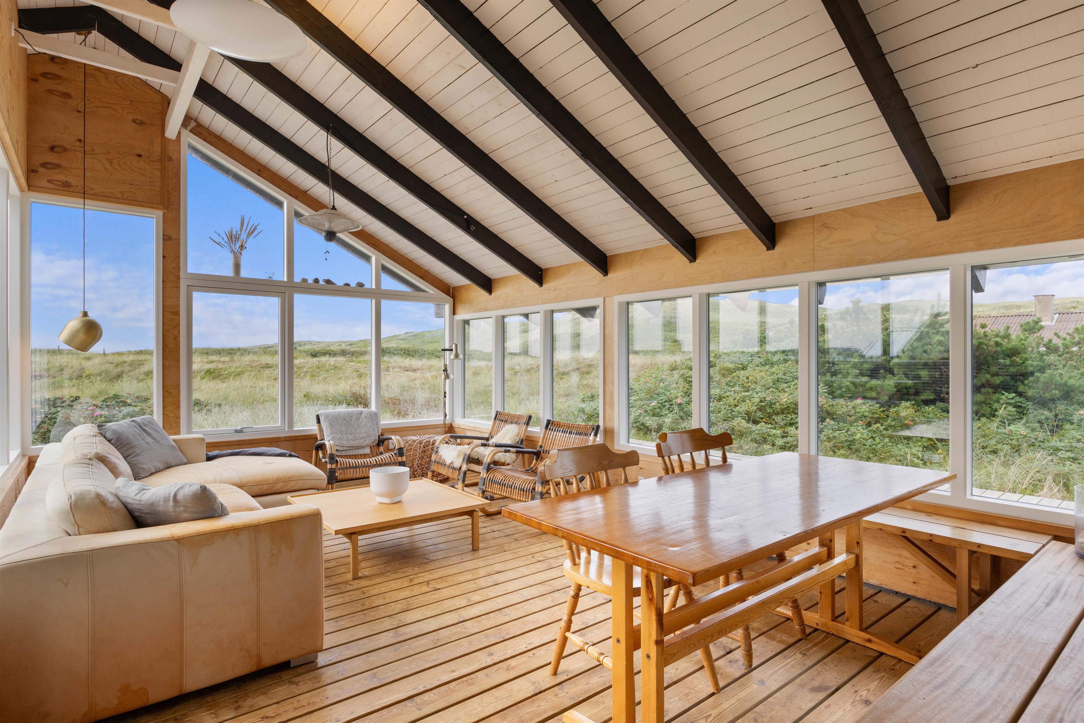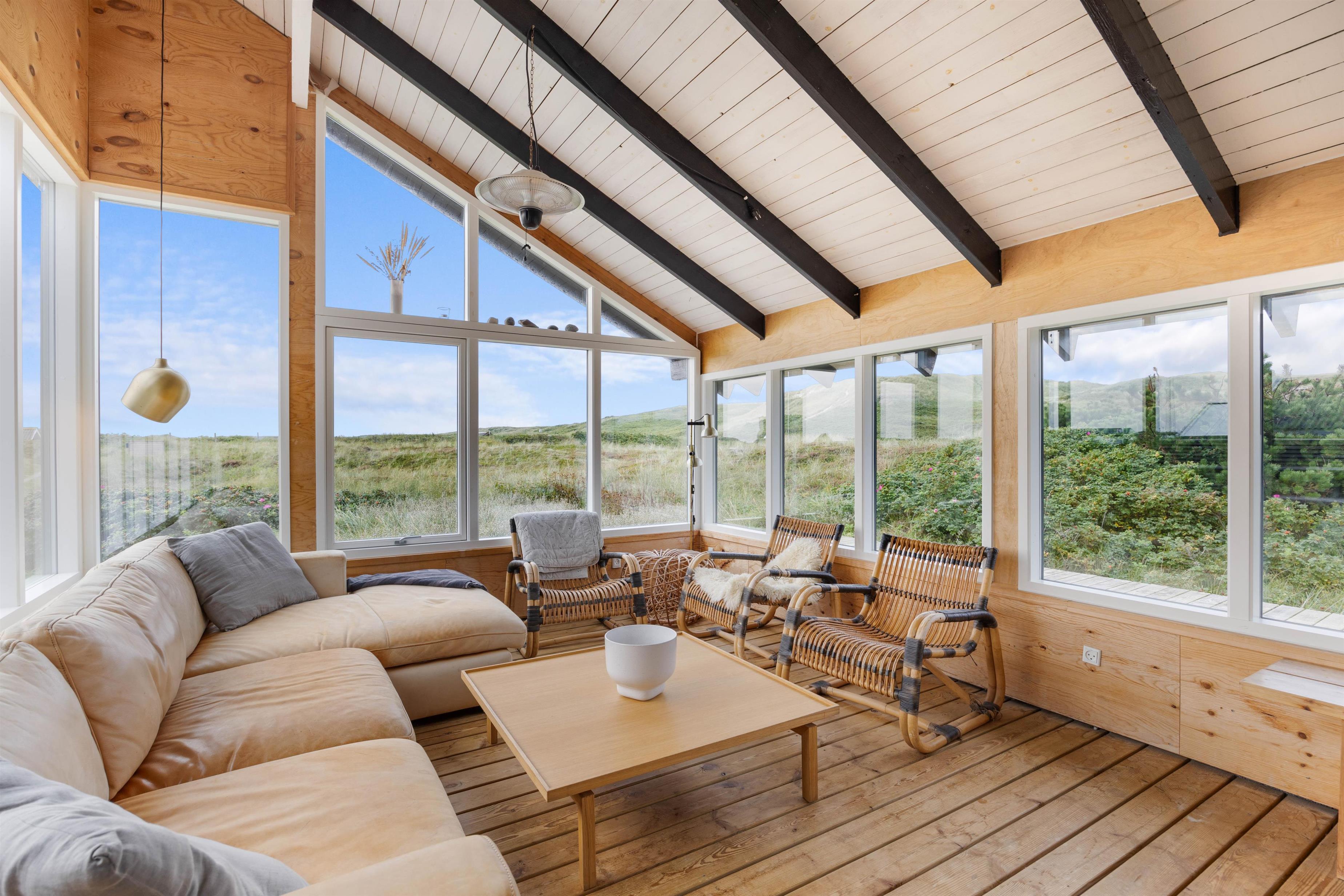 Hvis I glæder jer ekstra meget til sommeren eller ikke er helt klar til at den slutter endnu, kan I forlænge sæsonen i sommerhusets store og stemningsfyldte udestue. Her kan I trække indenfor, når mørket falder på, eller når vejr og vind ikke tillader at sidde ude på den dejlige terrasse.