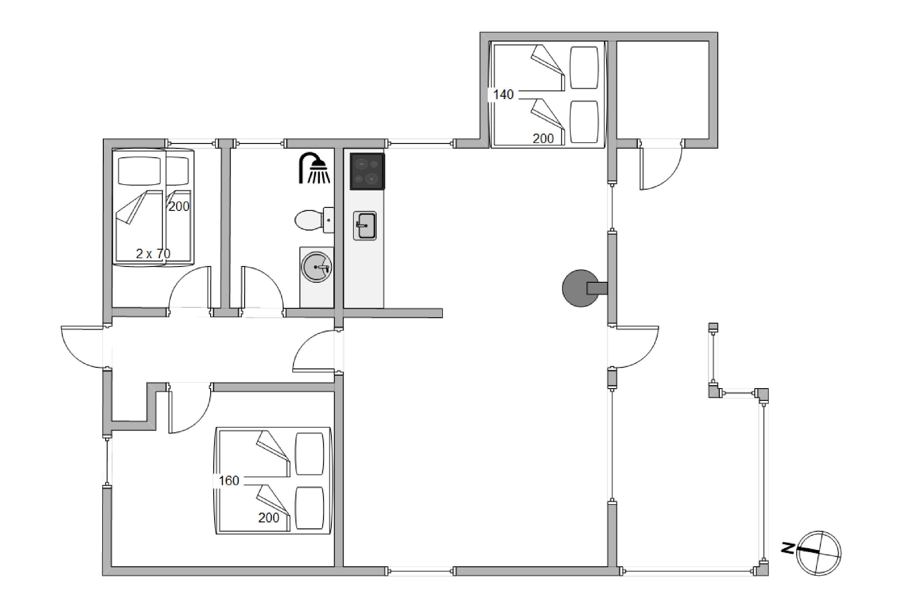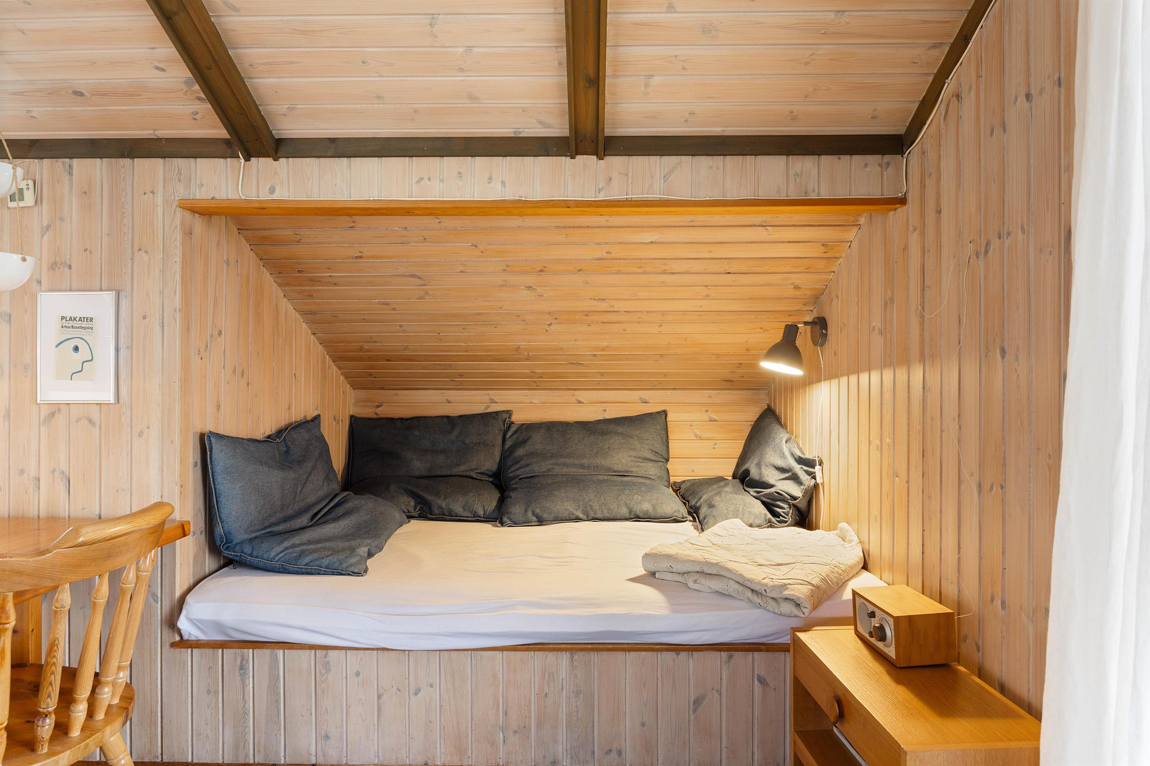 Sommerhuset har 2 soverum med i alt 4 sovepladser, her er der henholdsvis 1 dobbelt seng og 2 enkeltsenge. Soveværelserne fremstår lyse med de træbeklædte vægge. Der er selvfølgelig også et skønt badeværelse med bruser.