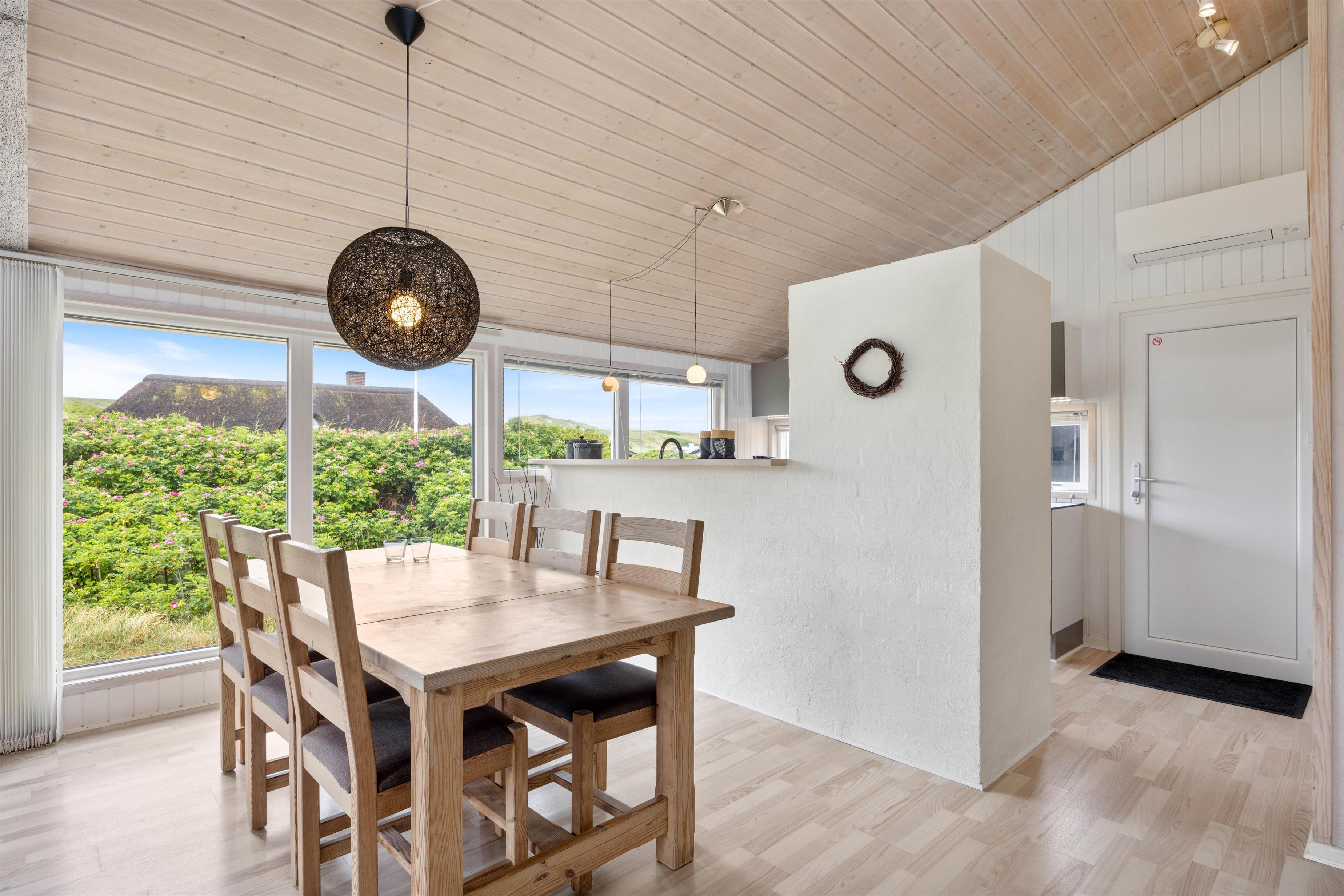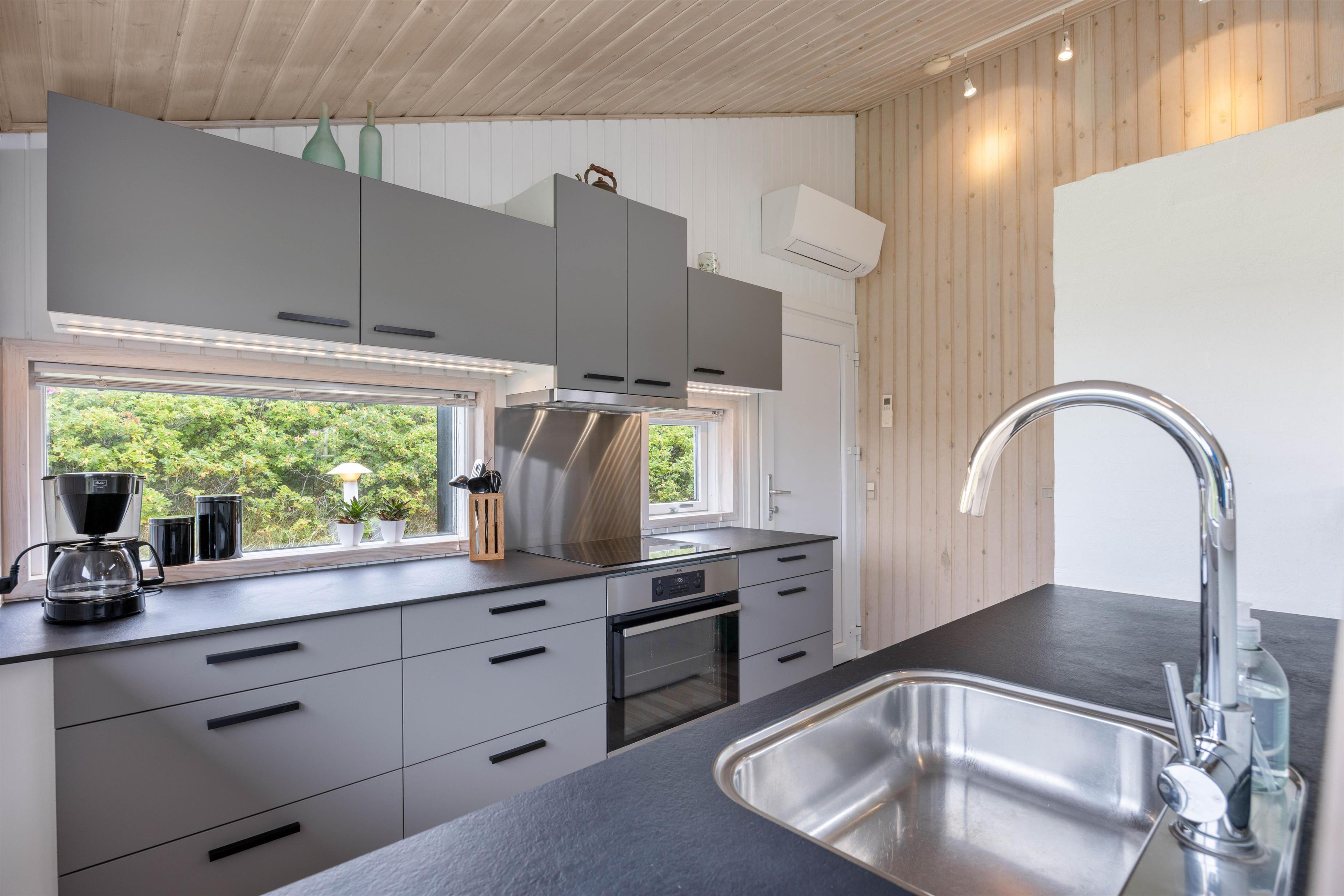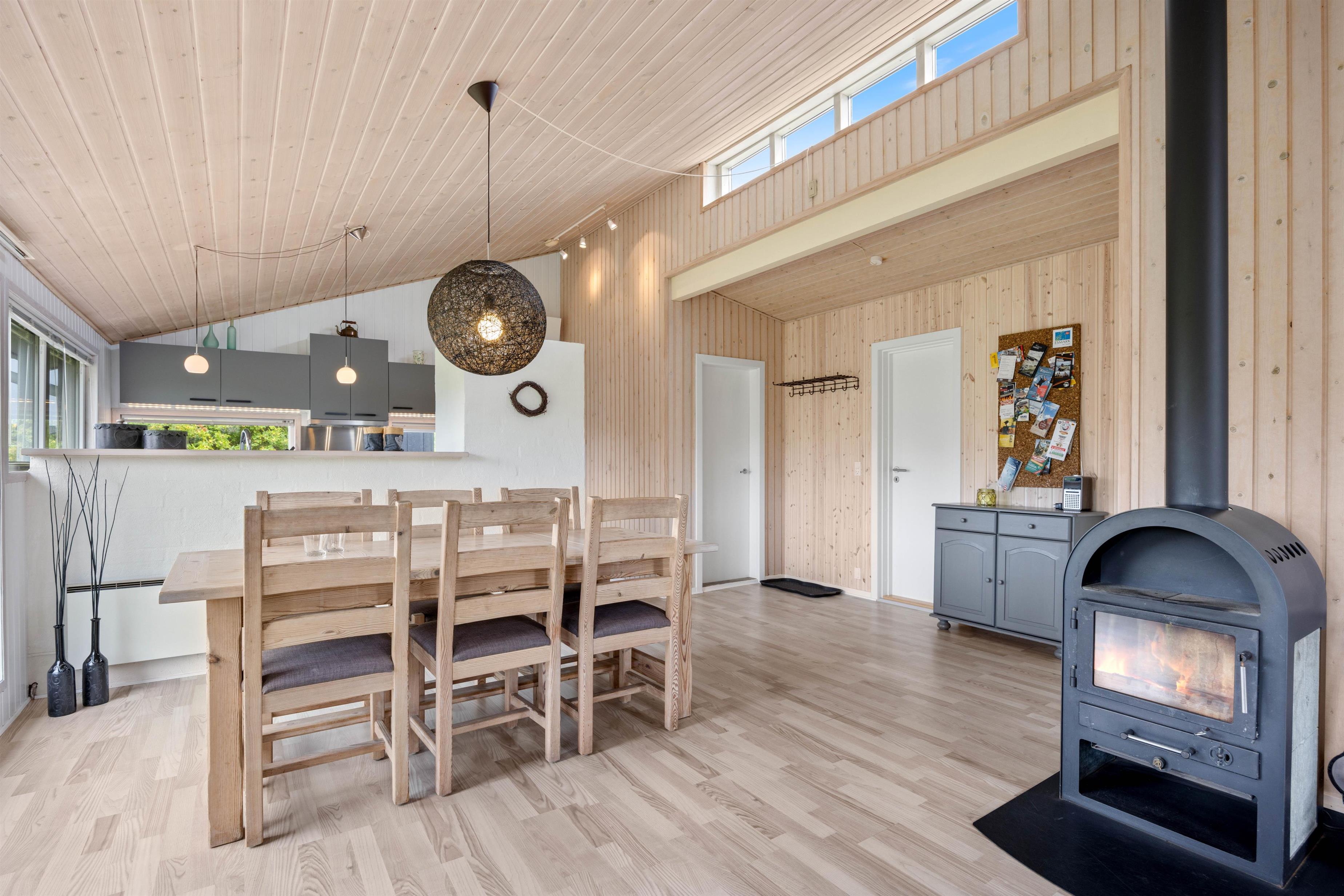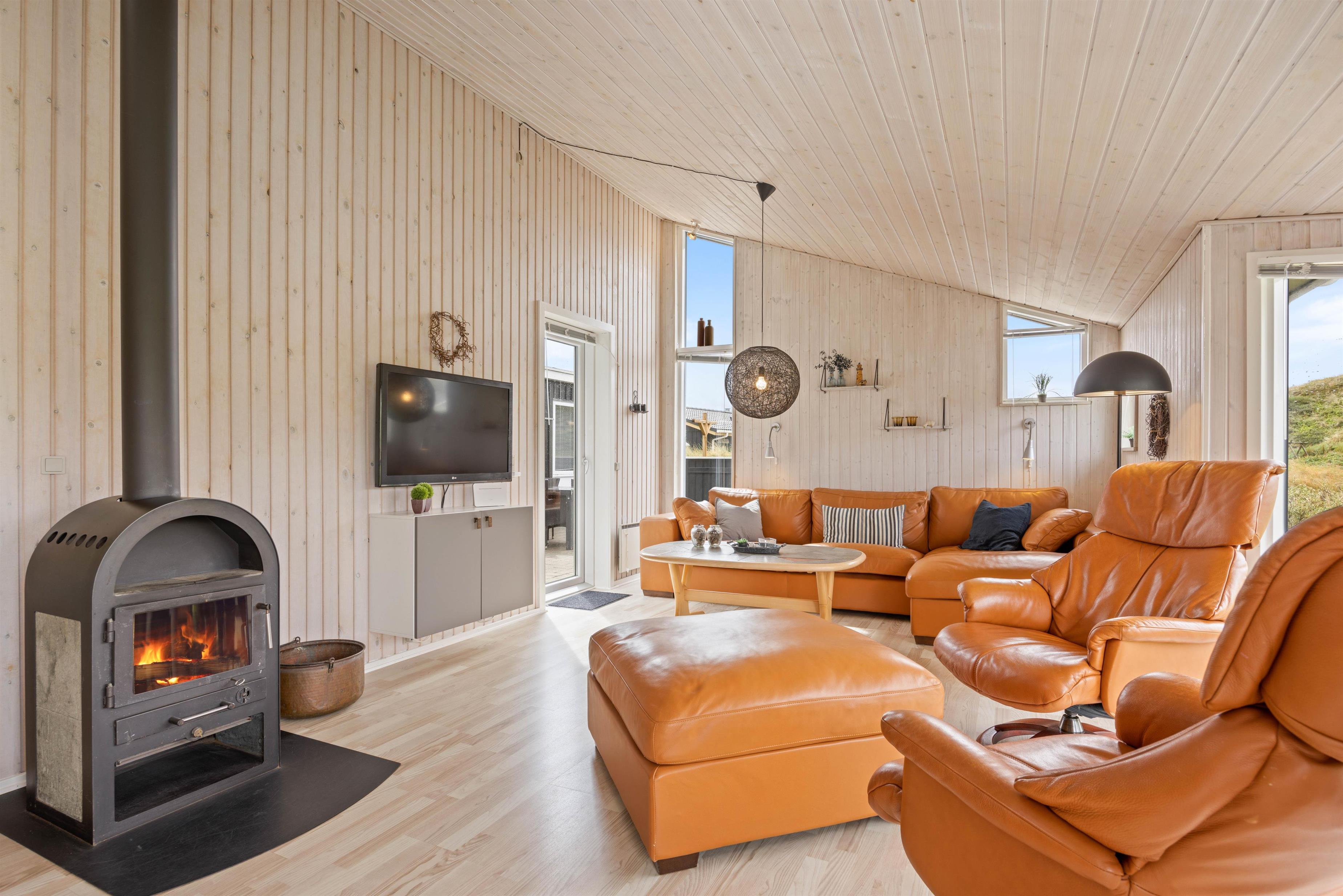 I sommerhusets køkkenalrum finder i den afslappende stue med de smukke brune lædermøbler. Her har I mulighed for at nyde den skønne brændeovn, tage en lille lur eller se en god film. I den anden ende af køkkenalrummet finder i det moderne køkken. Her kan I se ind til stuen, så i stadig kan hyggesnakke med jeres familiemedlemmer.