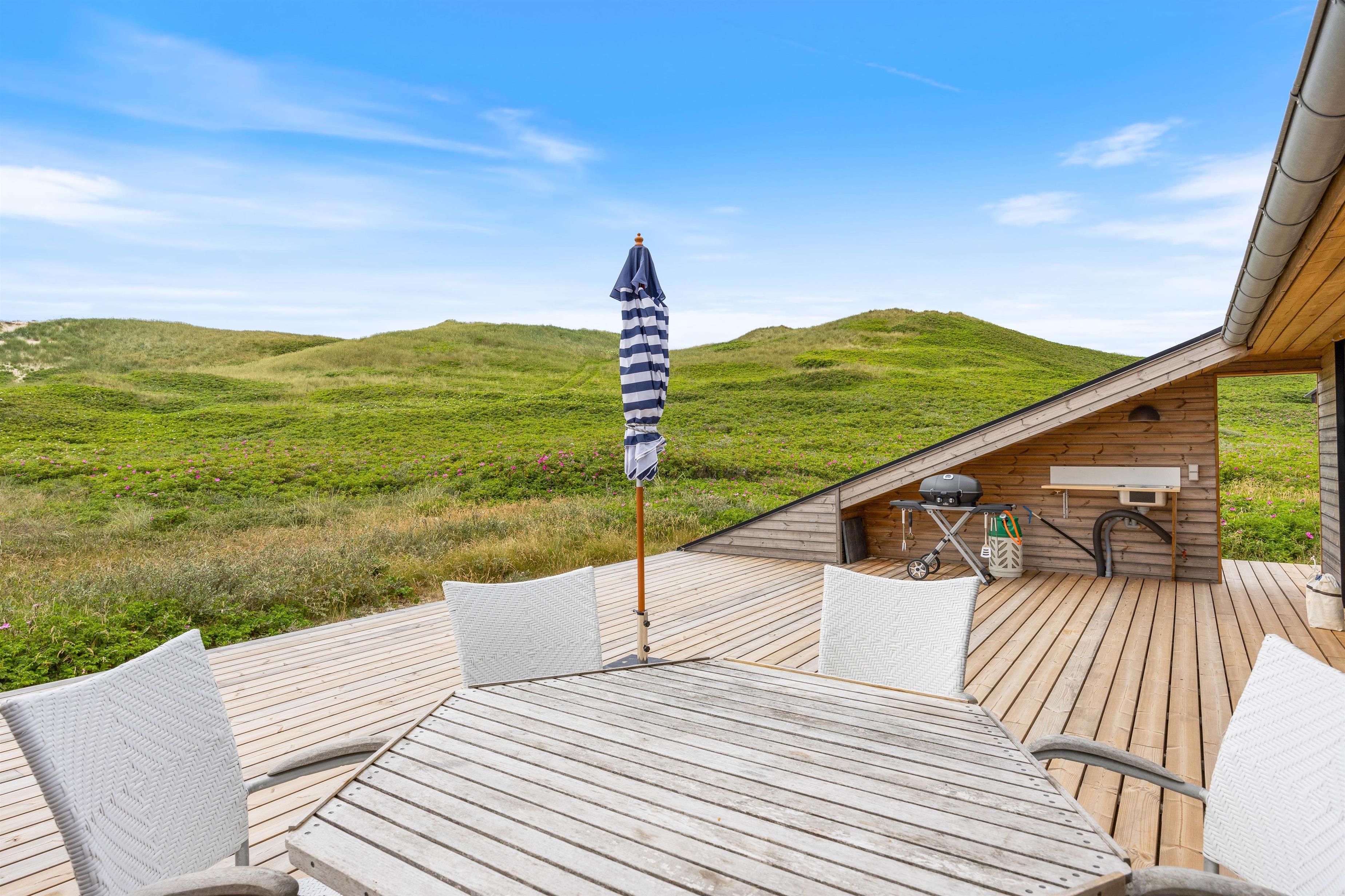 På den store og skønne træterrasse vil I kunne nyde mange timers solskin og livsnydelse. Her er der lækre havemøbler, solvogne og en parasol, som I kan nyde ekstra meget, når vejret tillader det. Gasgrillen vil kunne sikre jer et lækkert grillmåltid - muligvis kan I grille jeres friskfanget fisk her også.