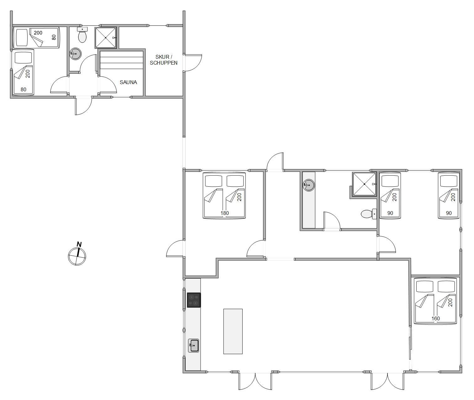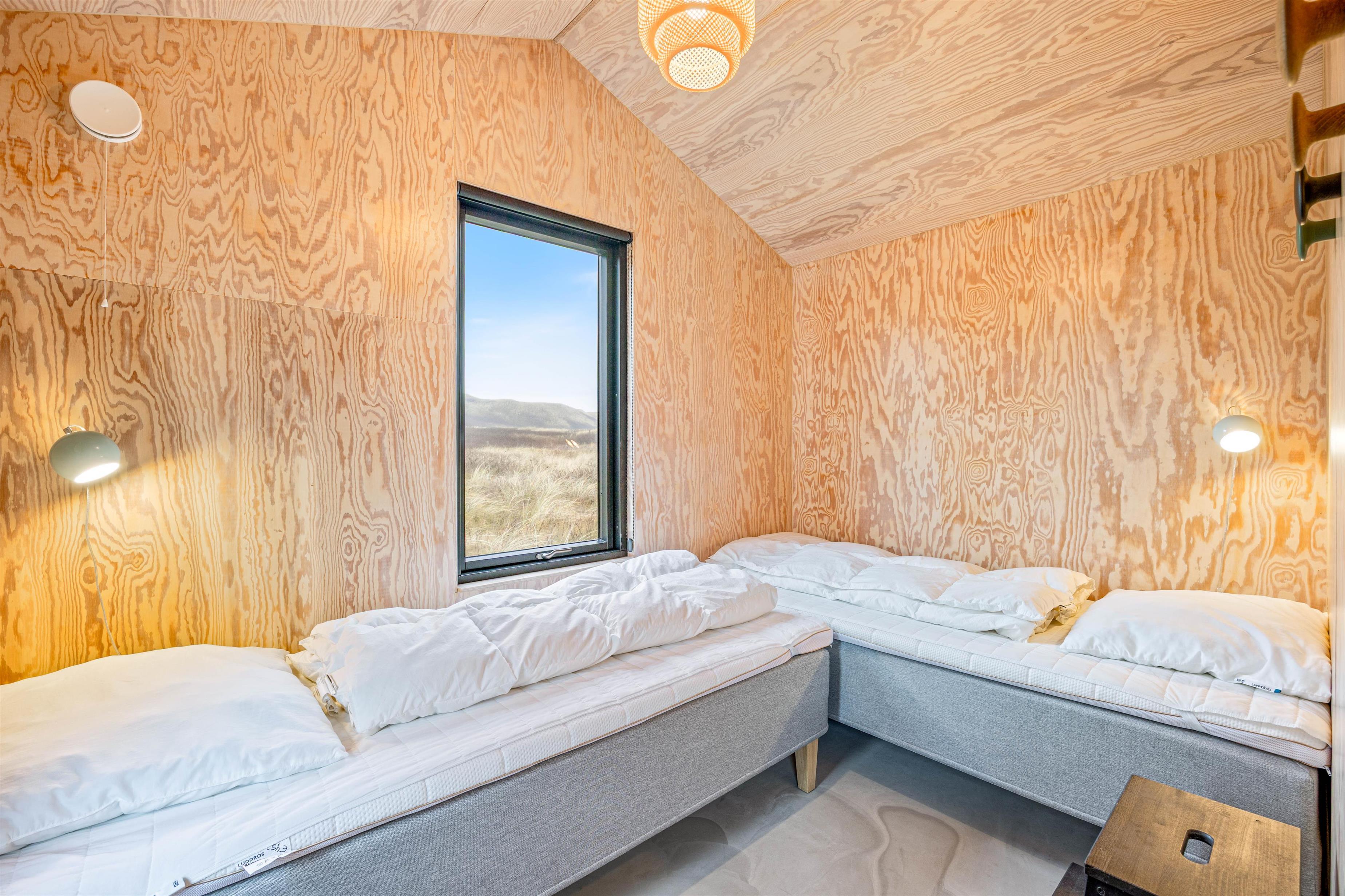 Når det er tid til at sove, er der 3 soverum – 2 x dobbeltsenge og 4 x enkeltsenge. Herunder er to af disse sengepladser i sommerhusets hyggelige anneks. Her er udesaunaen også placeret, til når I trænger til lidt ekstra varme på en kold dag. Der er I sommerhuset også 2 badeværelse med gulvvarme.