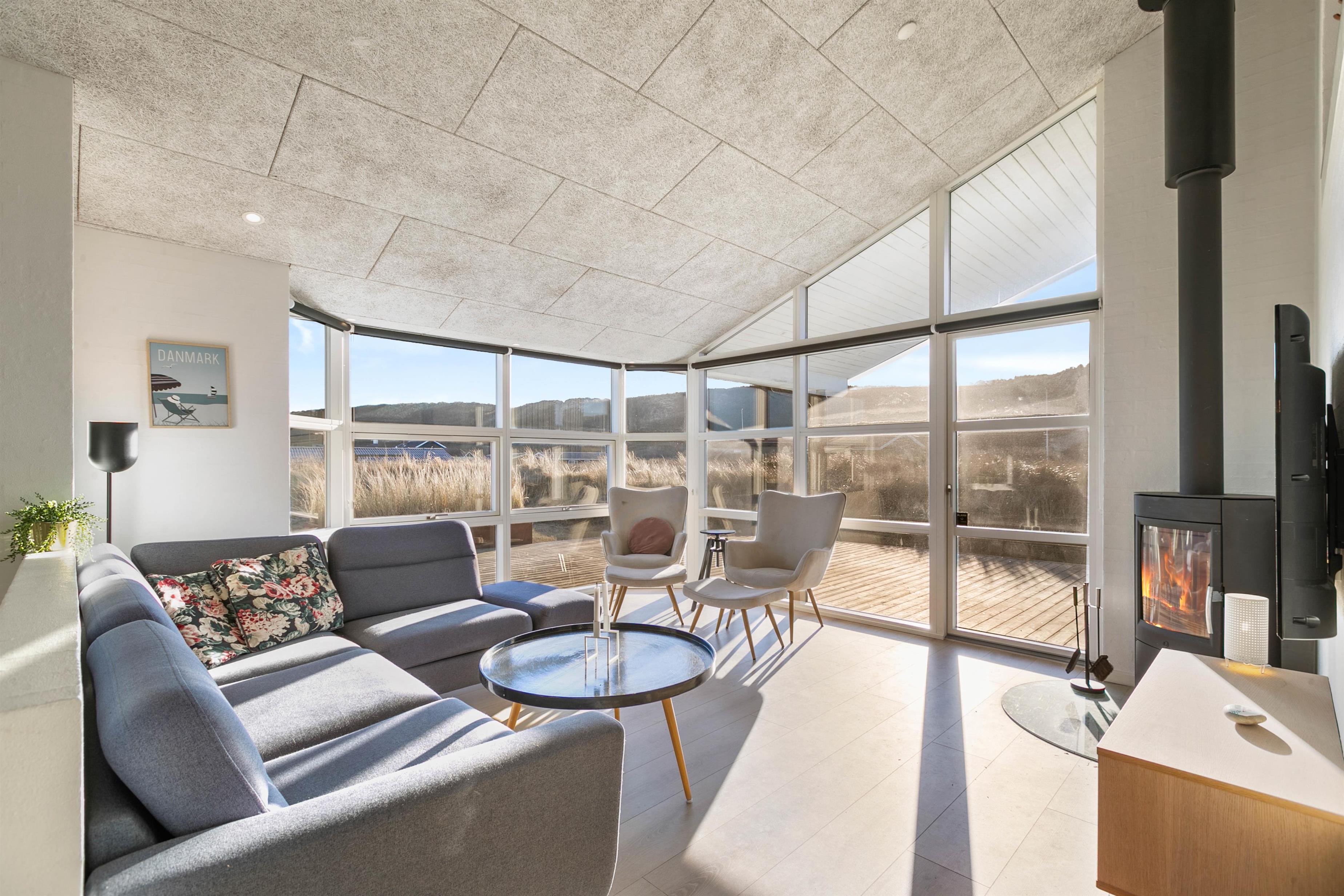 Husets centrum er det store opholdsrum, hvor køkken og stue er slået sammen. Her sørger store vinduesfronter for at åbne op og invitere solens lys såvel som de naturskønne omgivelser indenfor. Den klassiske brændeovn er selvfølgelig på plads, så I får en god varme hele året rundt.