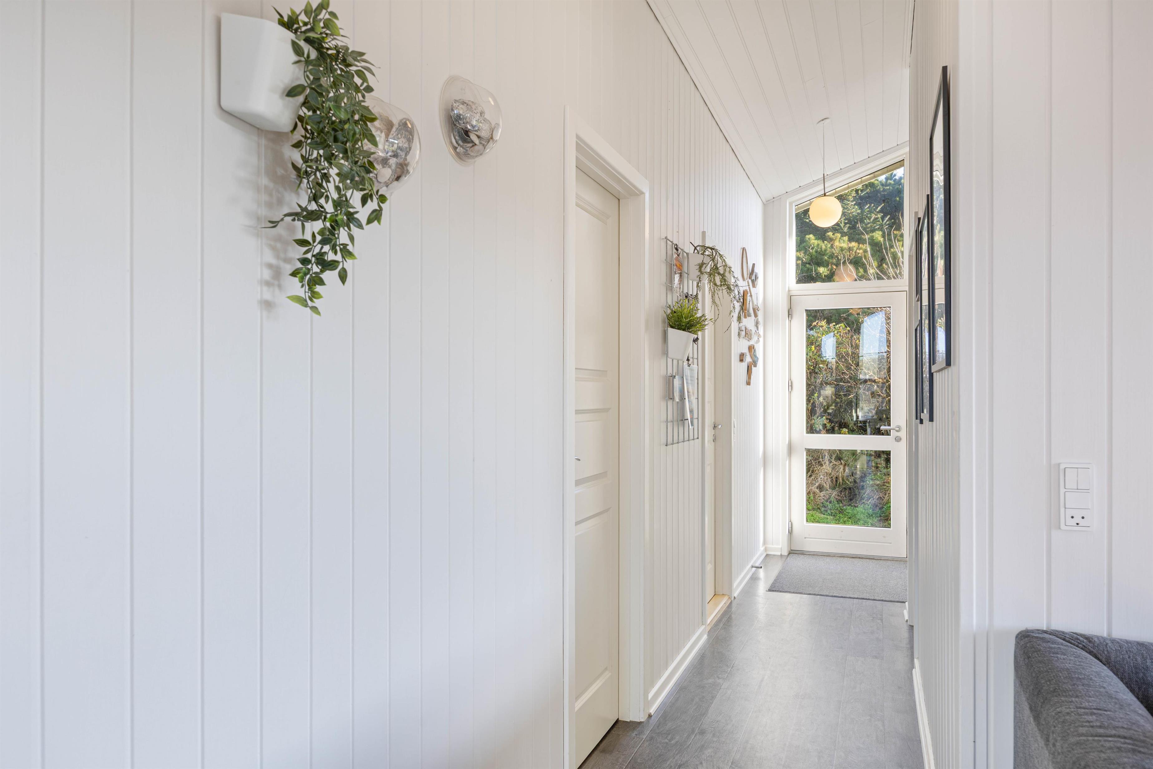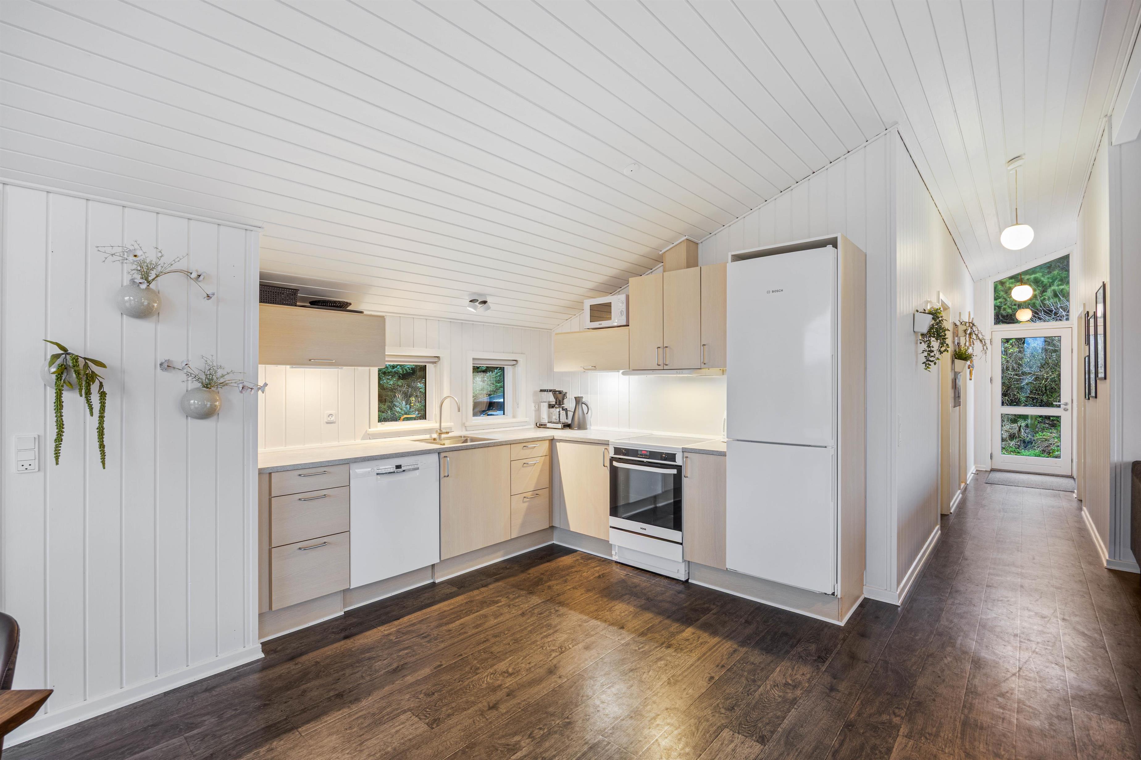 Foran husets brændeovn kan man også slappe af og nyde den kniterende ild. Brændeovnen er nemlig centralt placeret, således at man både får glæde af den i spiseområde og stuen. Også den energibesparende varmepumpe sørger for en behagelig temperatur i huset. Stue og køkken er i åben forbindelse og er hermed det perfekte rum, hvor der er plads til hele familien. Her kan i fælles lave et lækkert måltid samt nyde et godt glas vin i spisekrogen. Det samme kan i gøre på den overdækkede terrasse, mens børnene leger på gyngestativet og hundene nyder den lukkede terrasse.