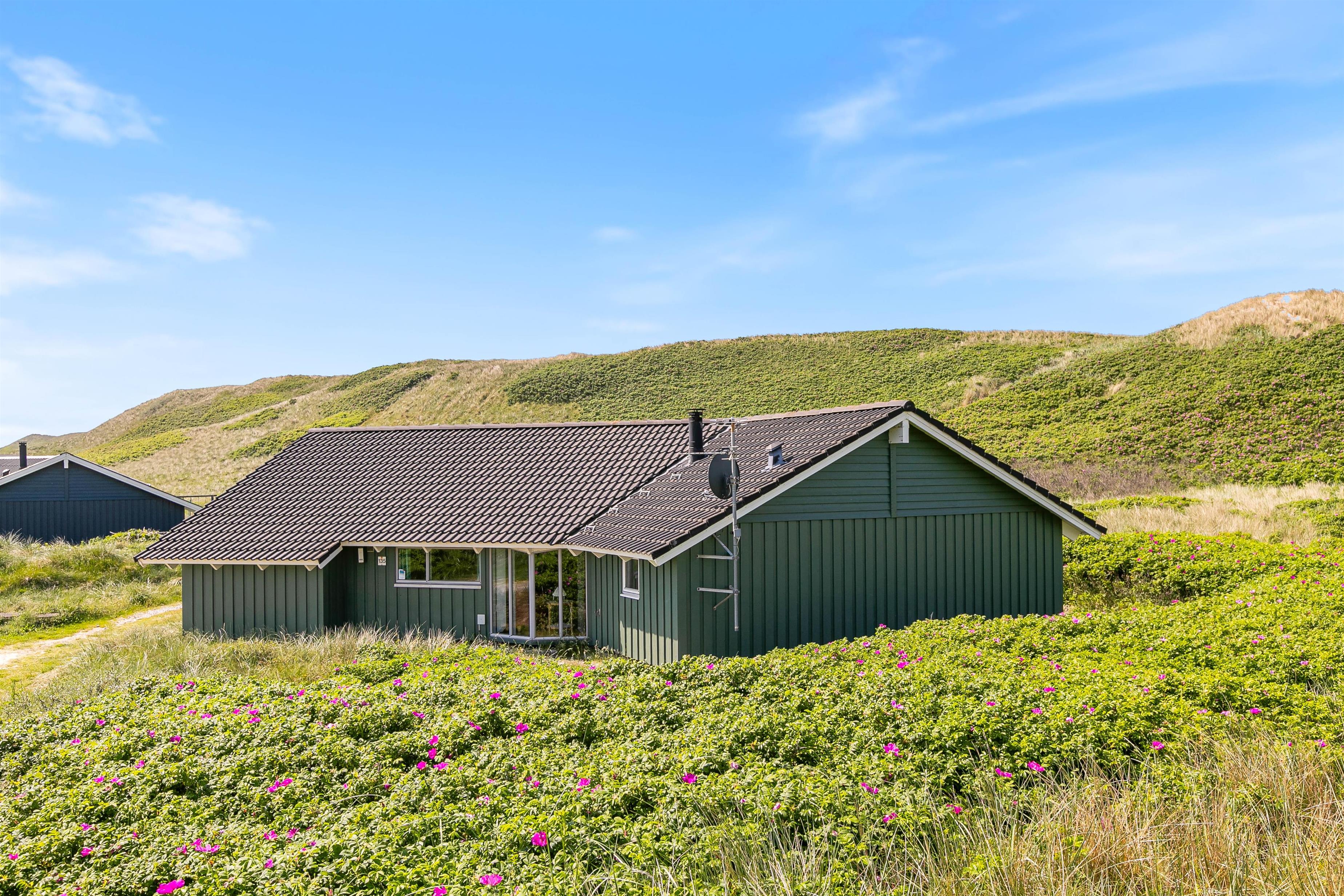 Den store terrasse mod sydvest er både delvist overdækket, delvis afskærmet, og delvist lukket, og kan således bruges meget af dagen. Den lidt mindre terrasse mod sydøst, ved husets indgang, er delvist afskærmet og derfor anvendelig til morgenkaffe på dage med godt vejr. Det smukke klitlandskab er en del af naturgrunden, så man får følelsen af at være et med naturen, når man bor i dette hus. Vesterhavet høres tydeligt fra terrasserne, og der er markerede stier til, når man ønsker at gå til havet.