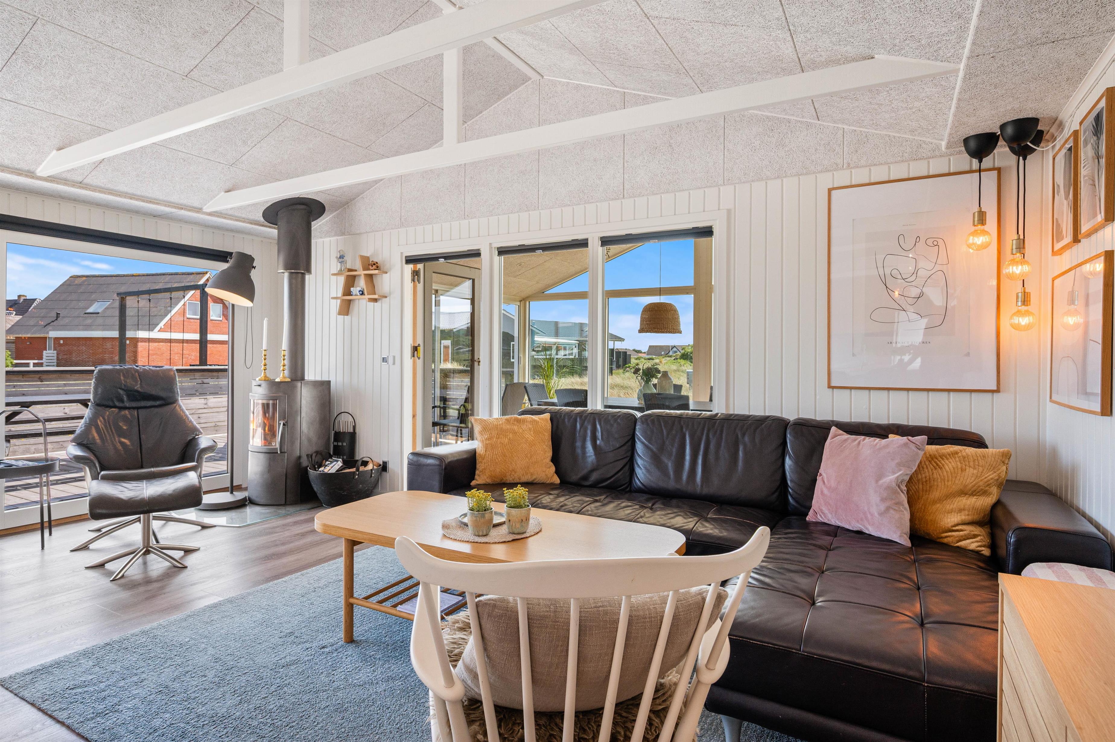 Sommerhuset er særdeles velholdt og indeholder et lyst rum med loft til kip. Stuen er i direkte forbindelse med køkkenet, så der kan kommunikeres fra sofaen til familiens kok, når der skal tilberedes et lækkert aftensmåltid. I stuen er der en brændeovn, som giver varme efter en god gåtur. I kan også bruge den energibesparende varmepumpe til at holde temperaturen behagelig.