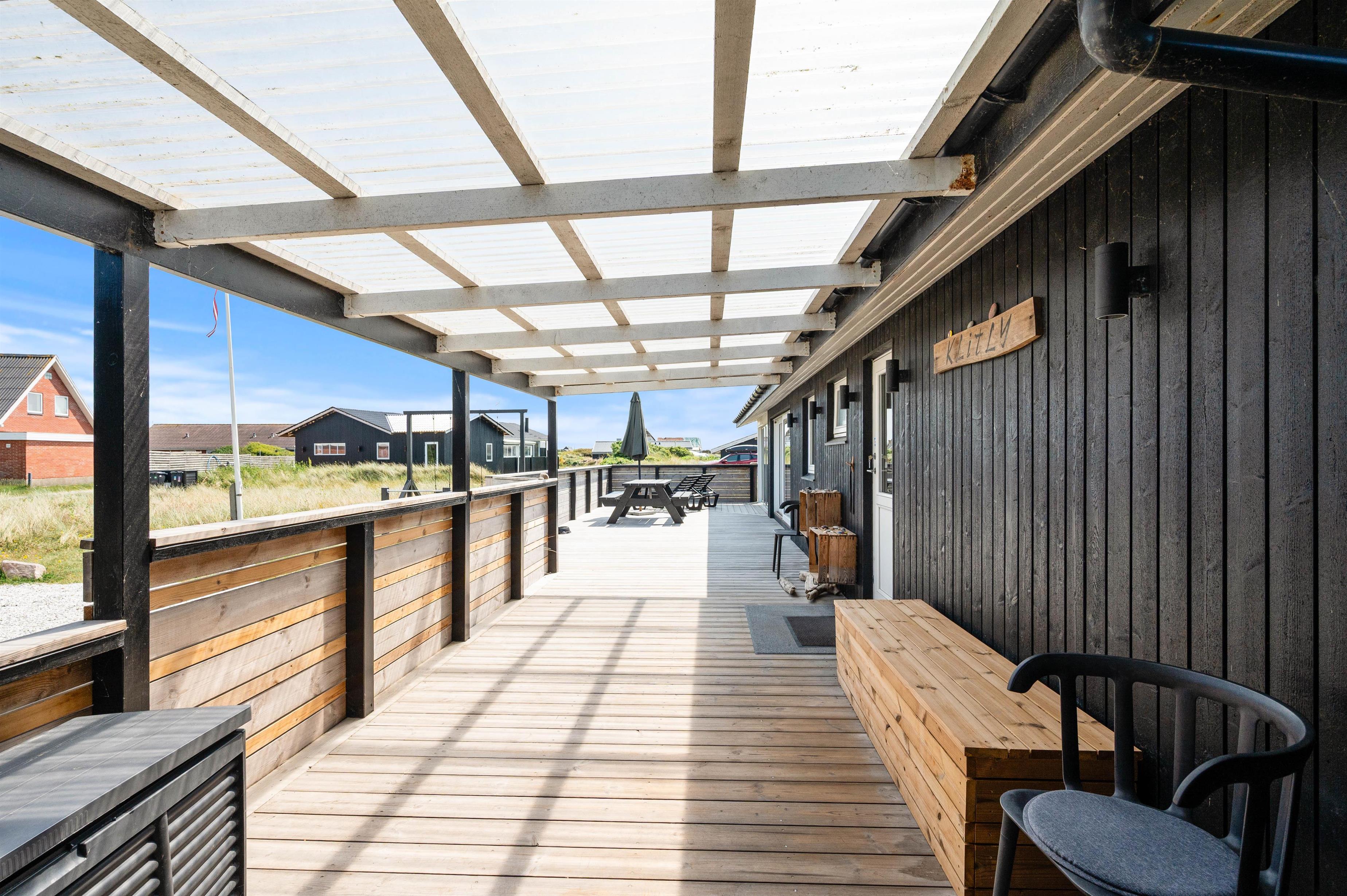Sommerhuset har en dejlig lukket og overdækket træterrasse, hvor hunden kan boltre sig uden at være i snor.