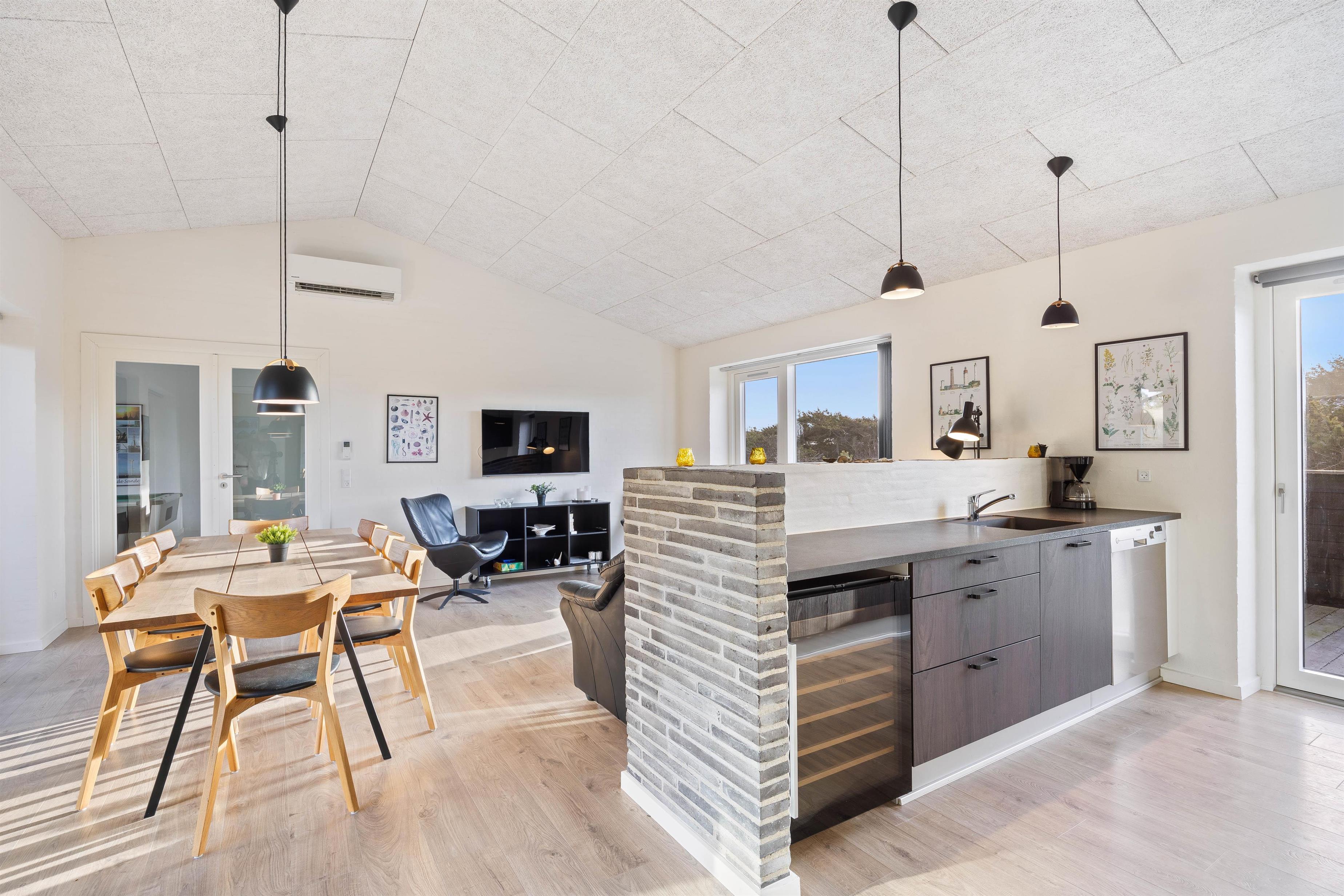 Det flotte opholdsrum med stue, spiseplads og køkken er hjertet i feriehuset, og hvor familien naturligt samles. Igennem de store vinduespartier mod syd har I en flot udsigt ud over sommerhusområdet og det flotte klitlandskab.