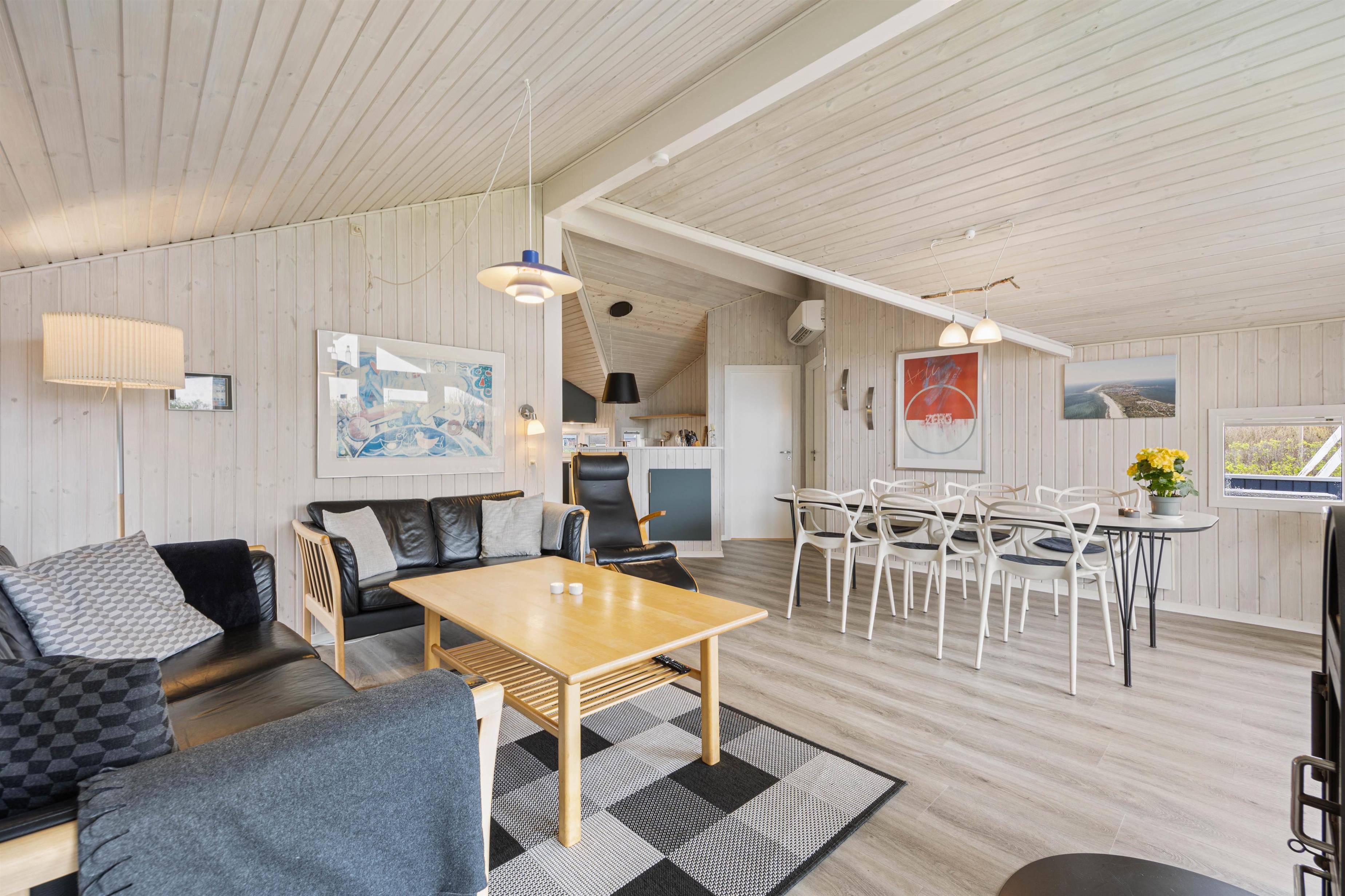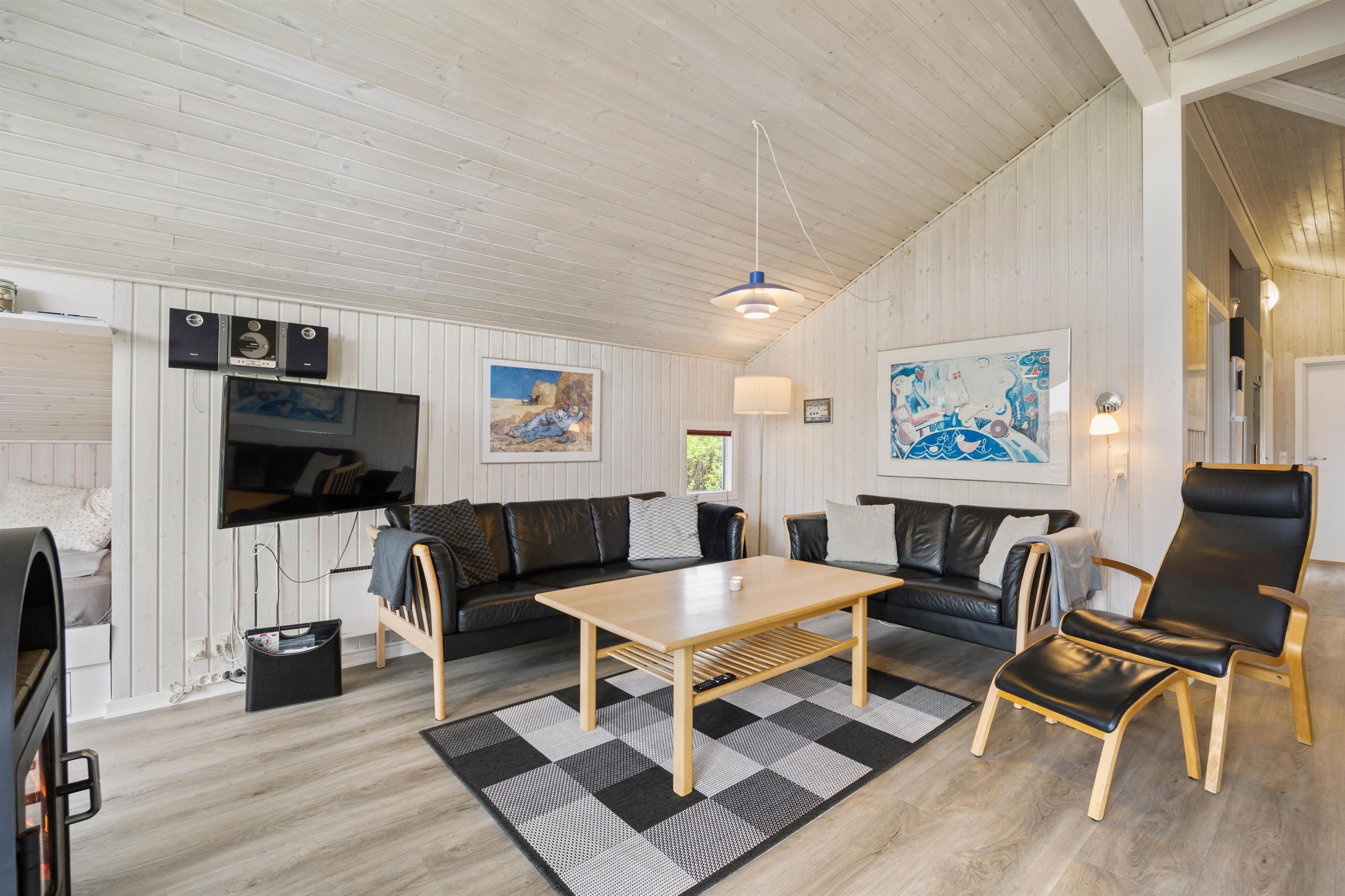 Sommerhuset har et rummeligt køkkealrum kombineret med stuen. Her er åbent til kip og masser af lysindfald fra glaspartiet mod syd, så i altid kan nyde solstrålerne. Sæt dig godt til rette i de komfortable stuemøbler, mens du nyder lyden af den knitrende brændeovn og stream jeres yndlingsfilm eller serie på chromecasten.