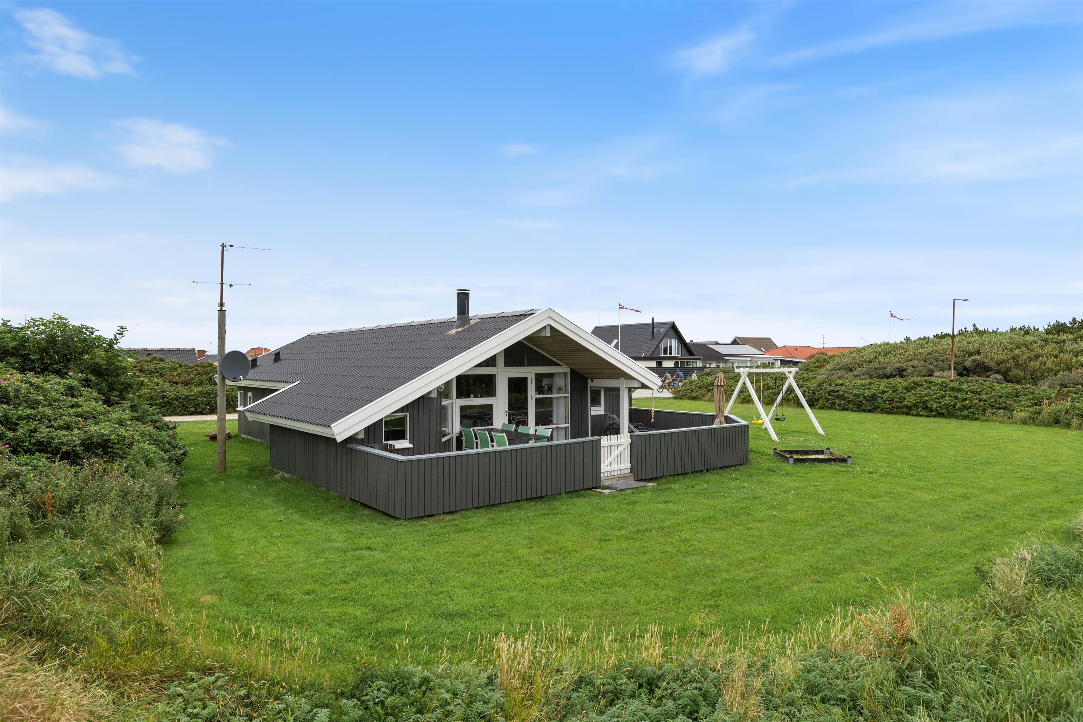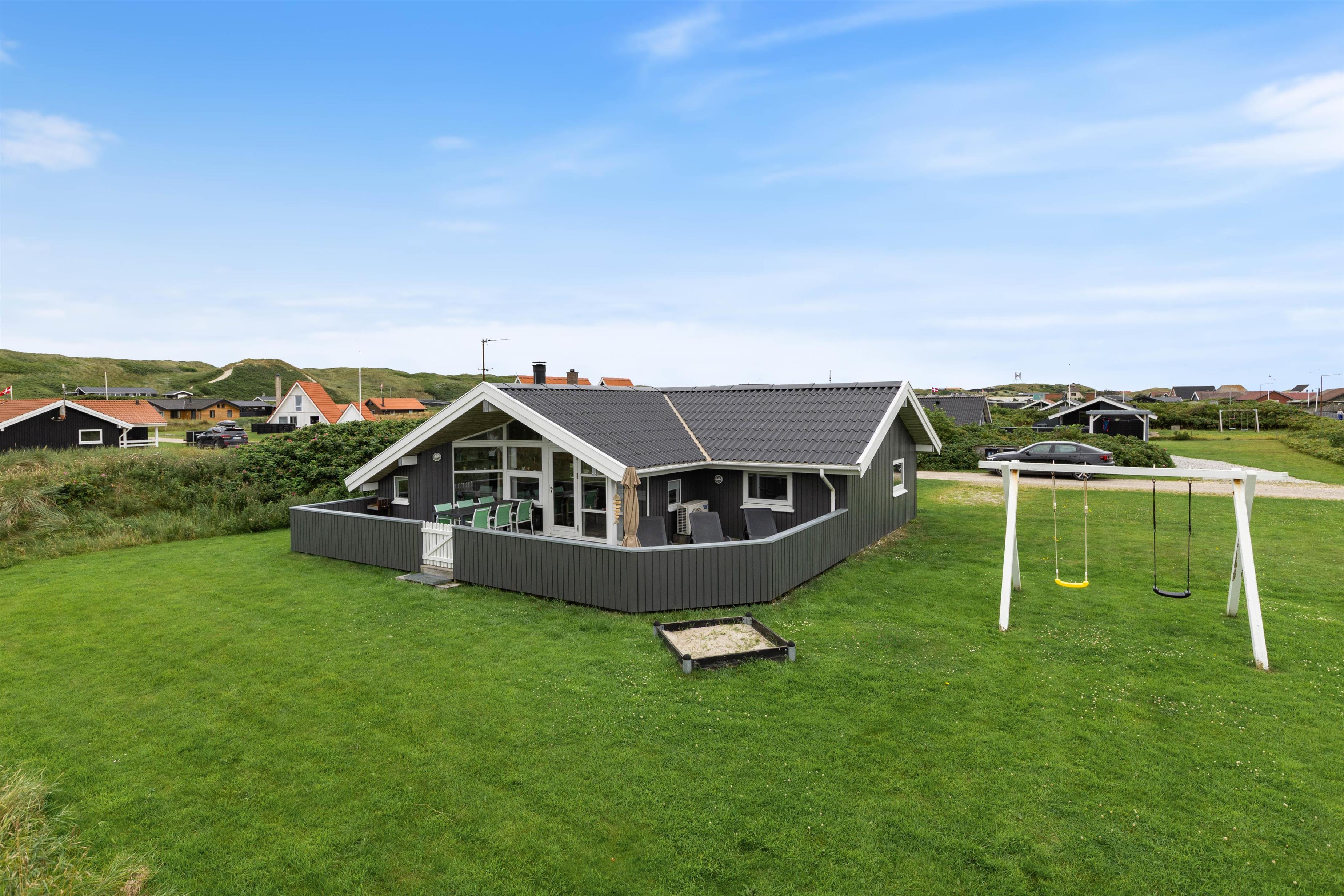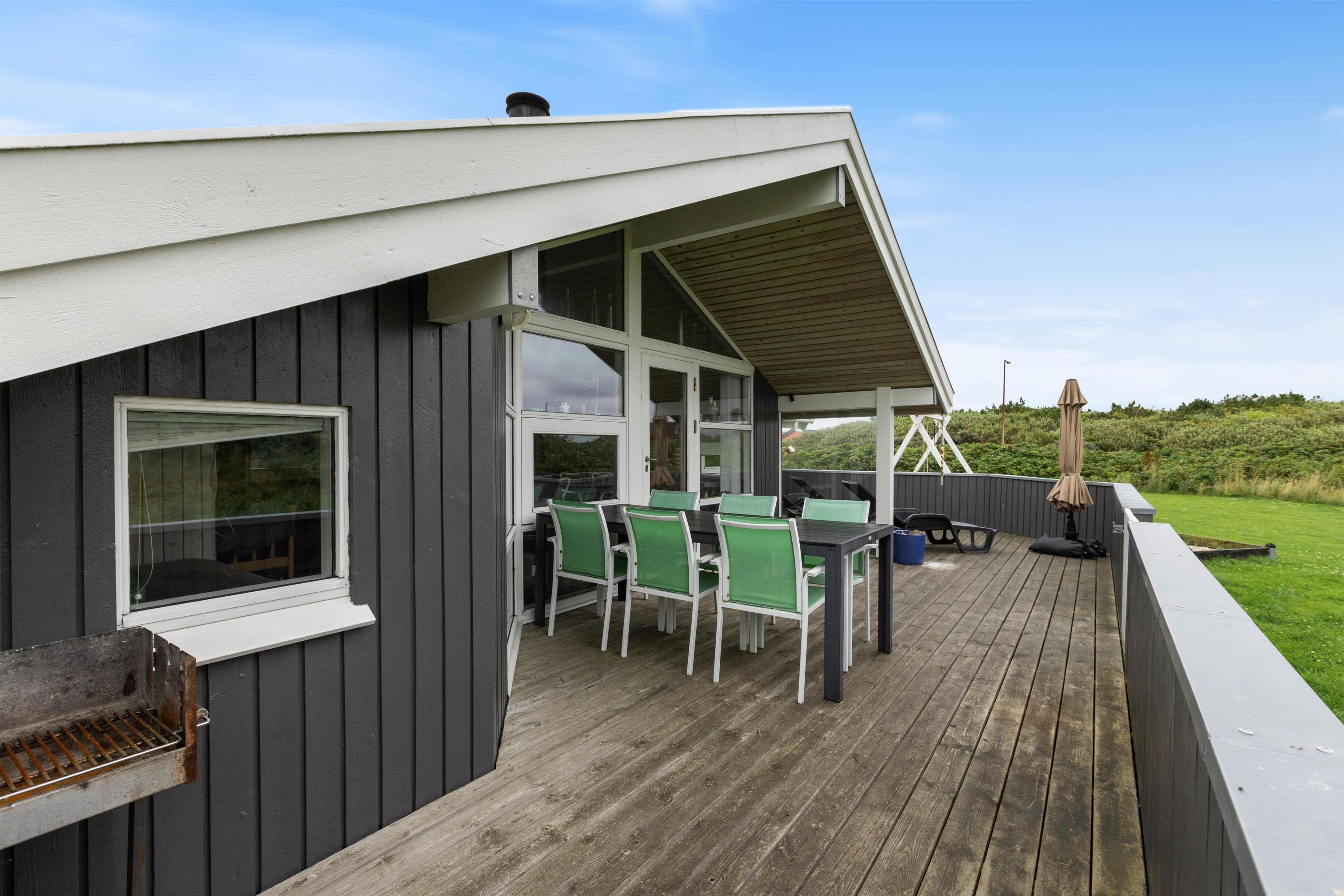 Sommerhusets lukket terrasse byder på mange timers afslapning i solen, hvor I kan lade jeres mindre børn og hund rende rundt uforstyrret. Her kan der også tilberedes dagens aftensmad på grillen, mens børnene er underholdt i sommerhuset sandkasse og på gyngestativet. Til aften kan i afslutte dagen på en afslappende måde i husets have møbler med et tæppe over benene og et brætspil