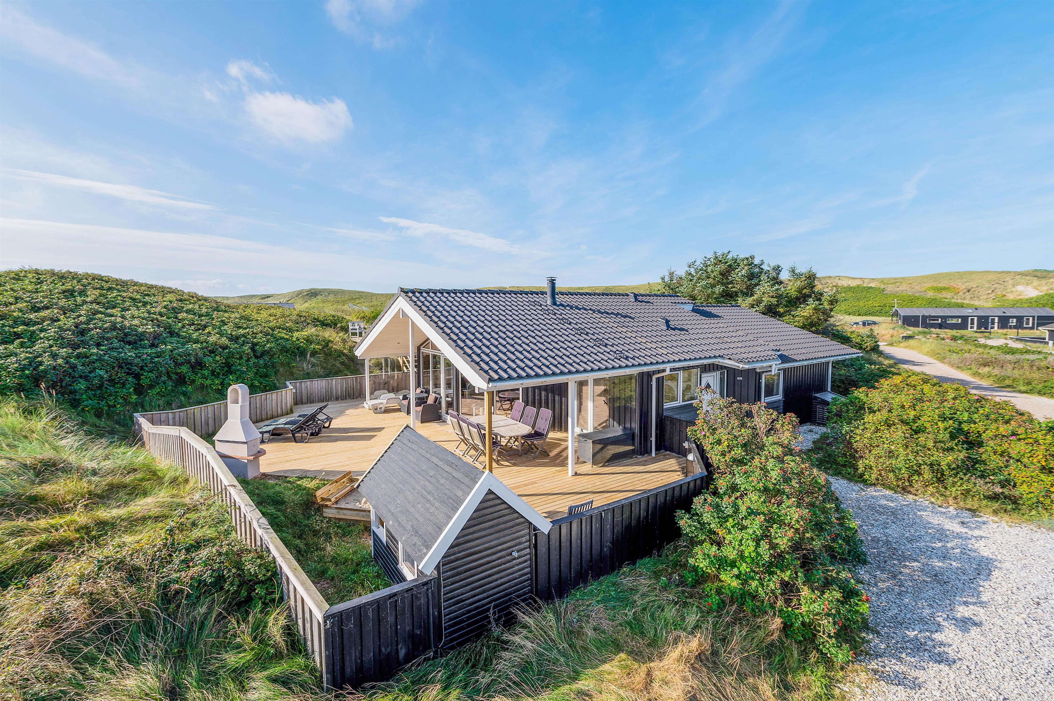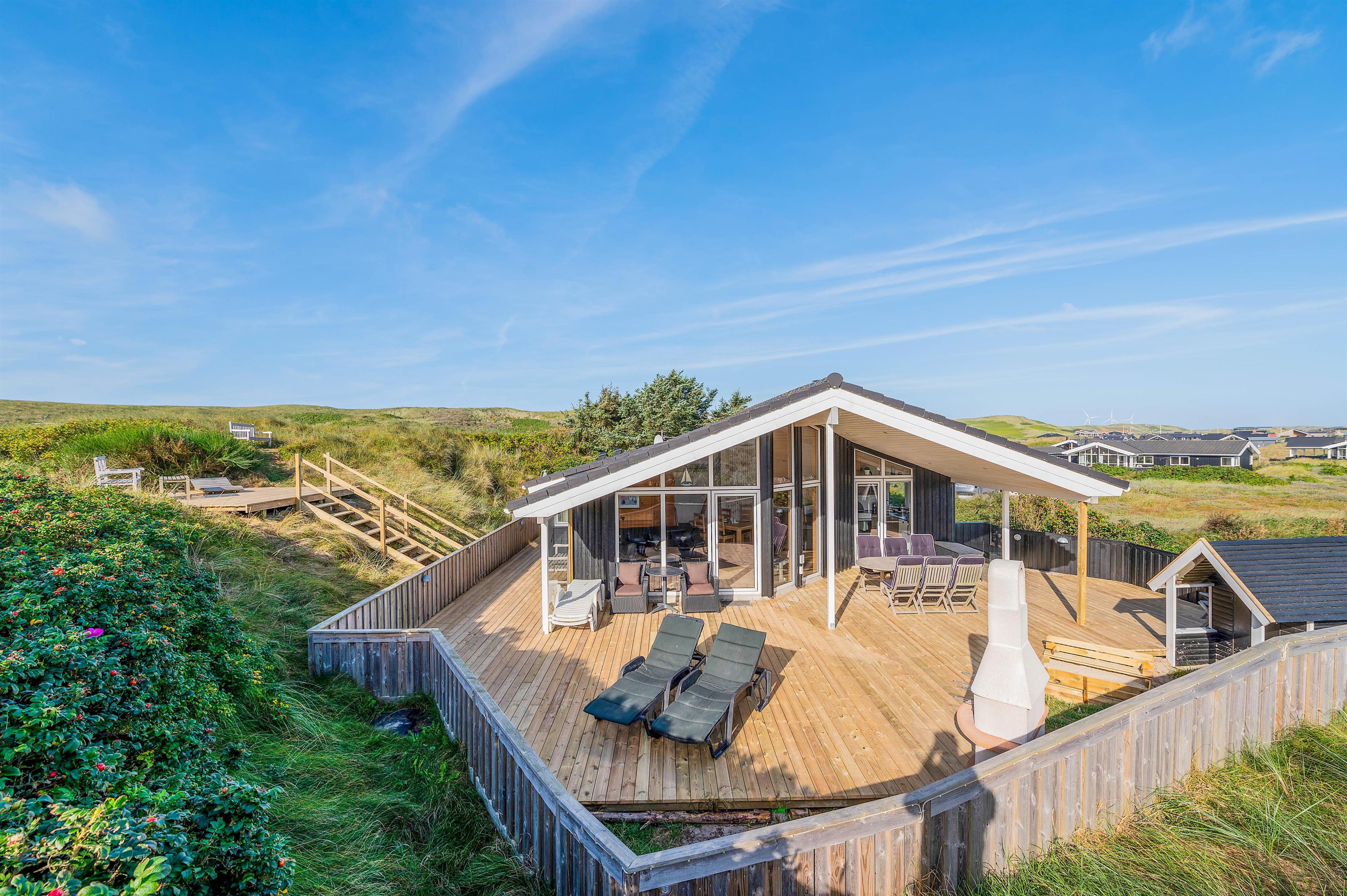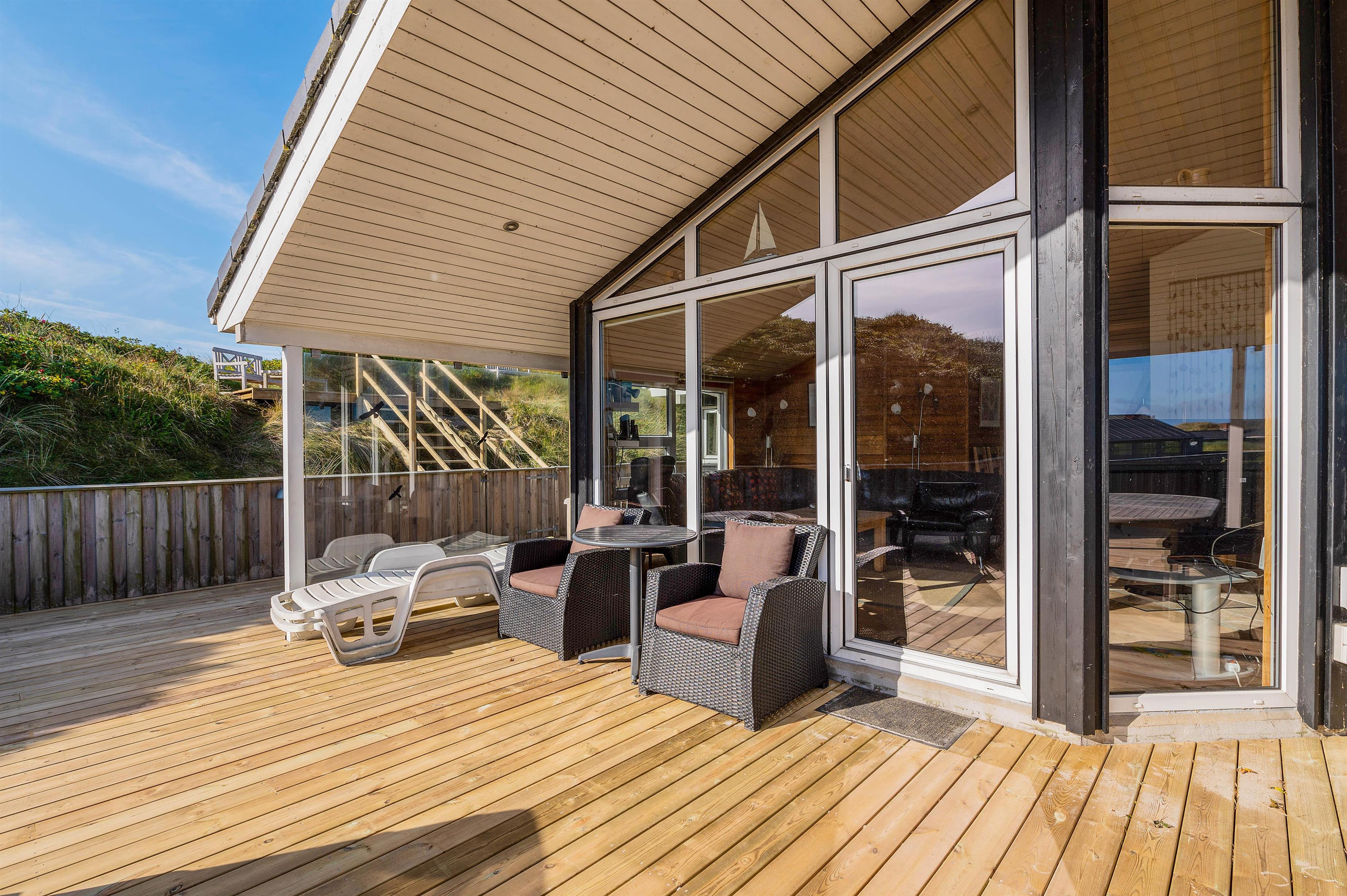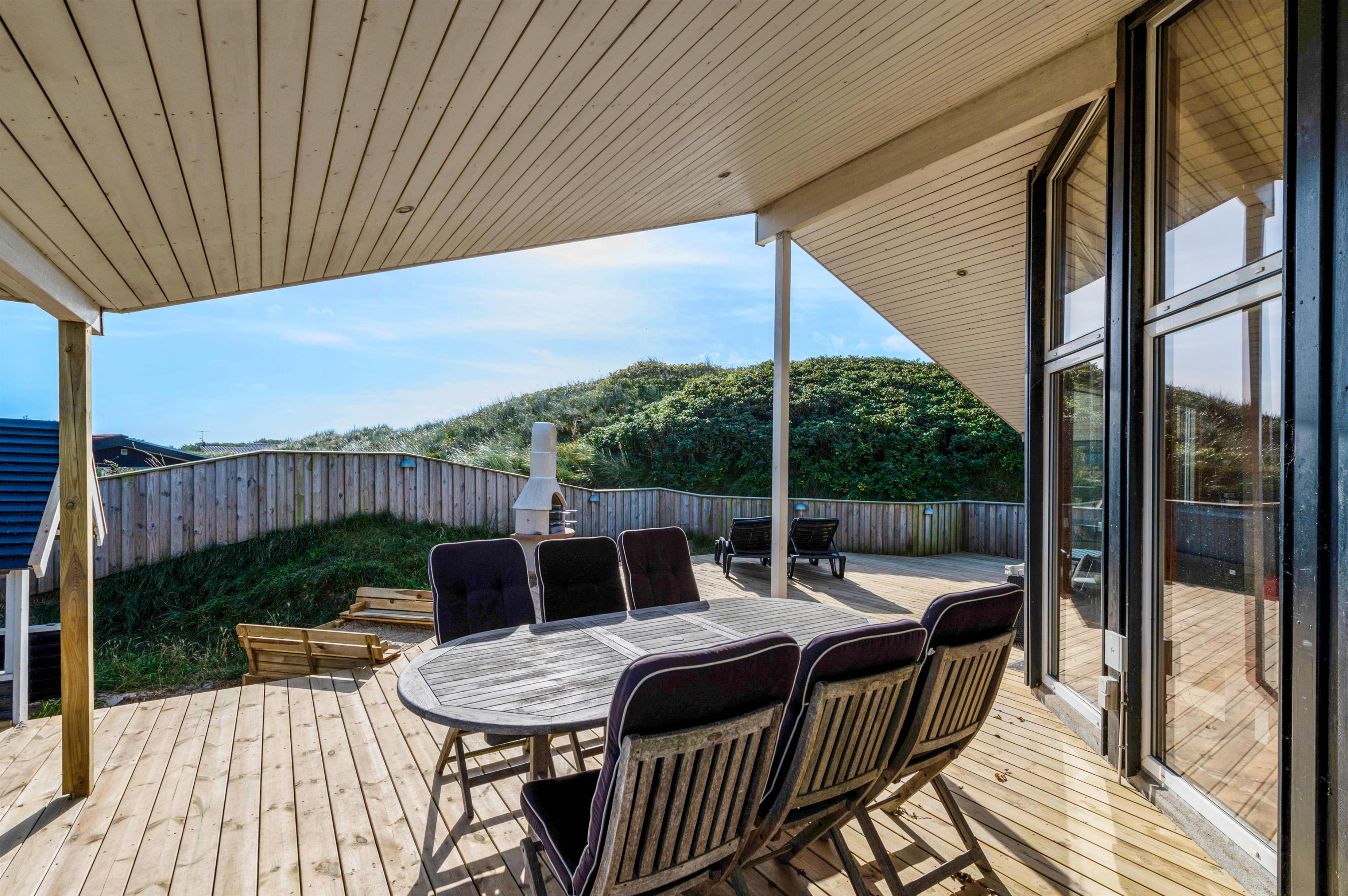 Udsigten til klitter og landskab er skøn mange steder fra dette hus og fra terrasserne. Den store terrasse rundt om huset, er lukket, delvist afskærmet og delvist overdækket, her kan I lade børn og kæledyr løbe frit rundt og udforske terrassen.