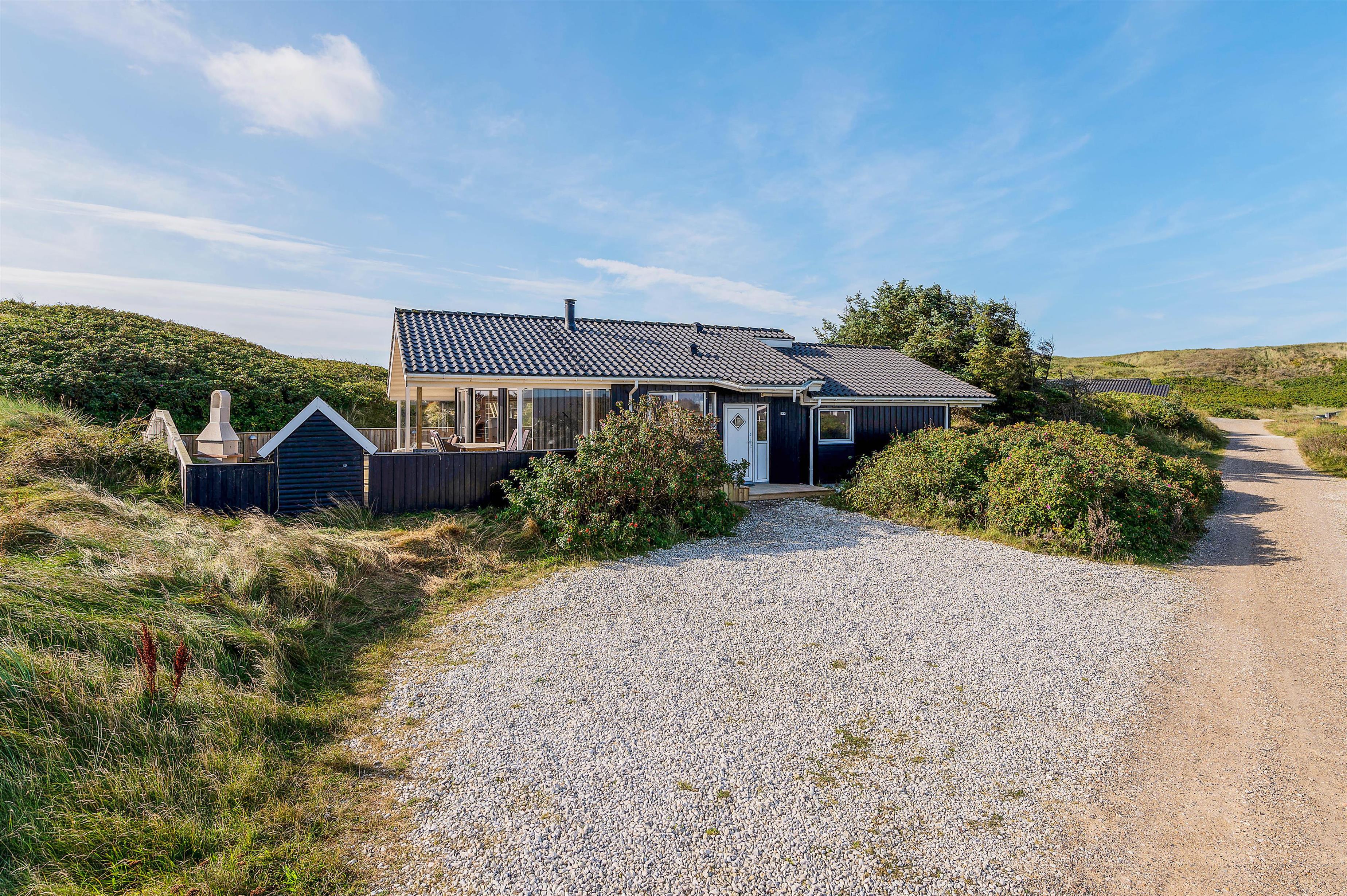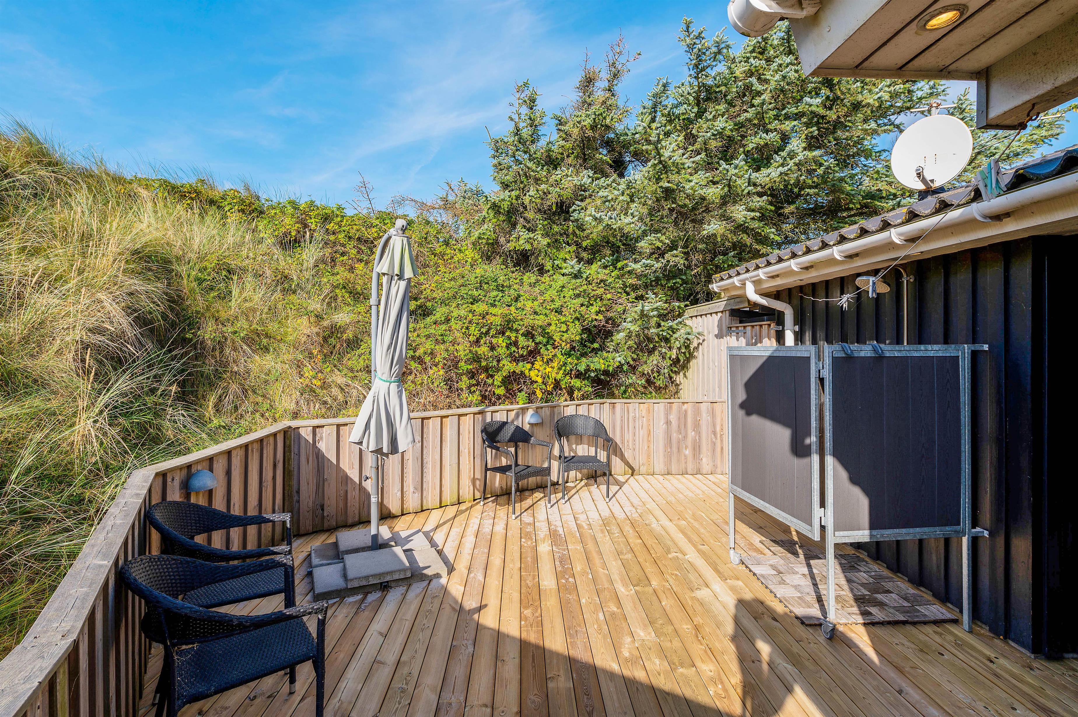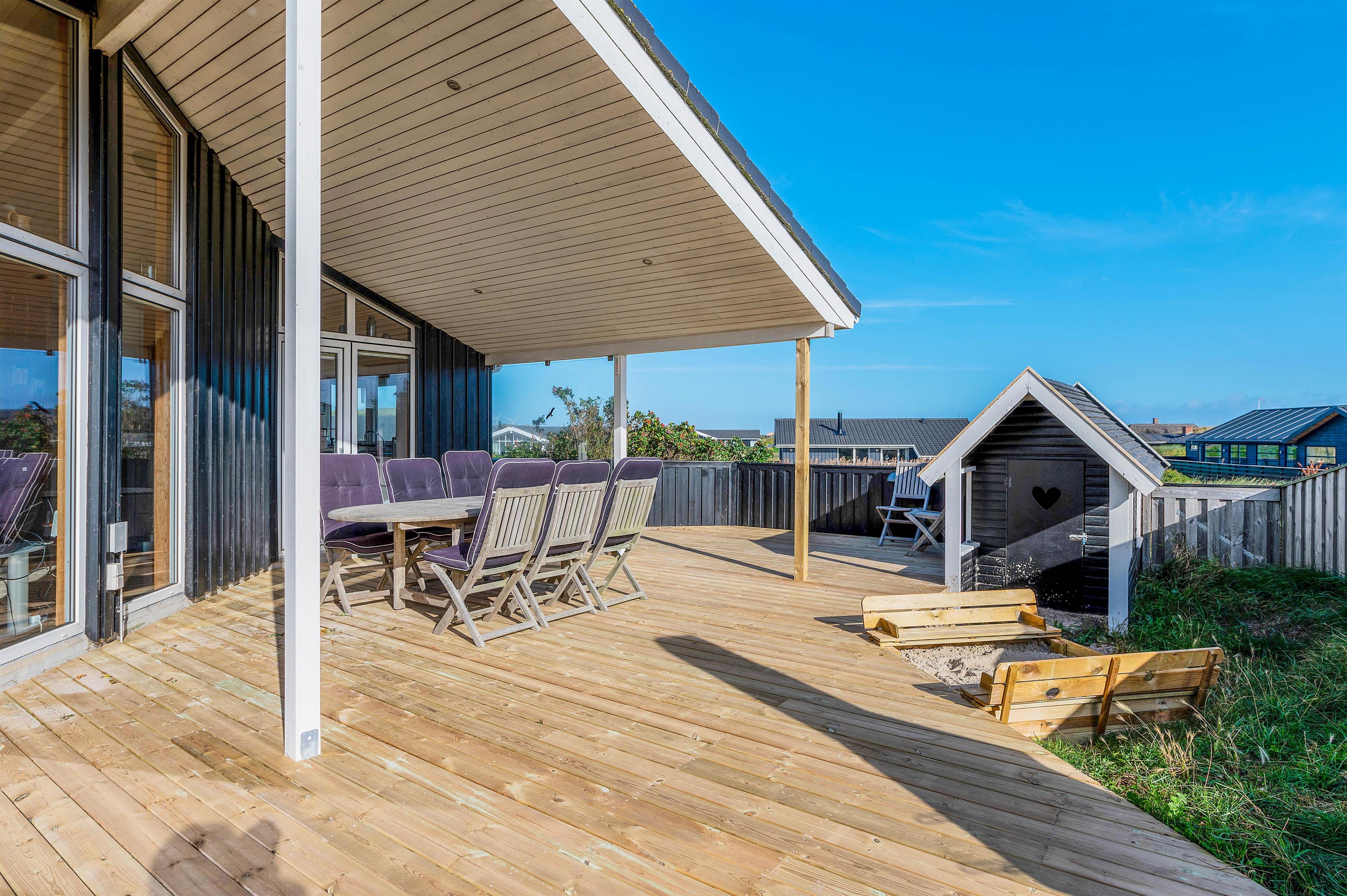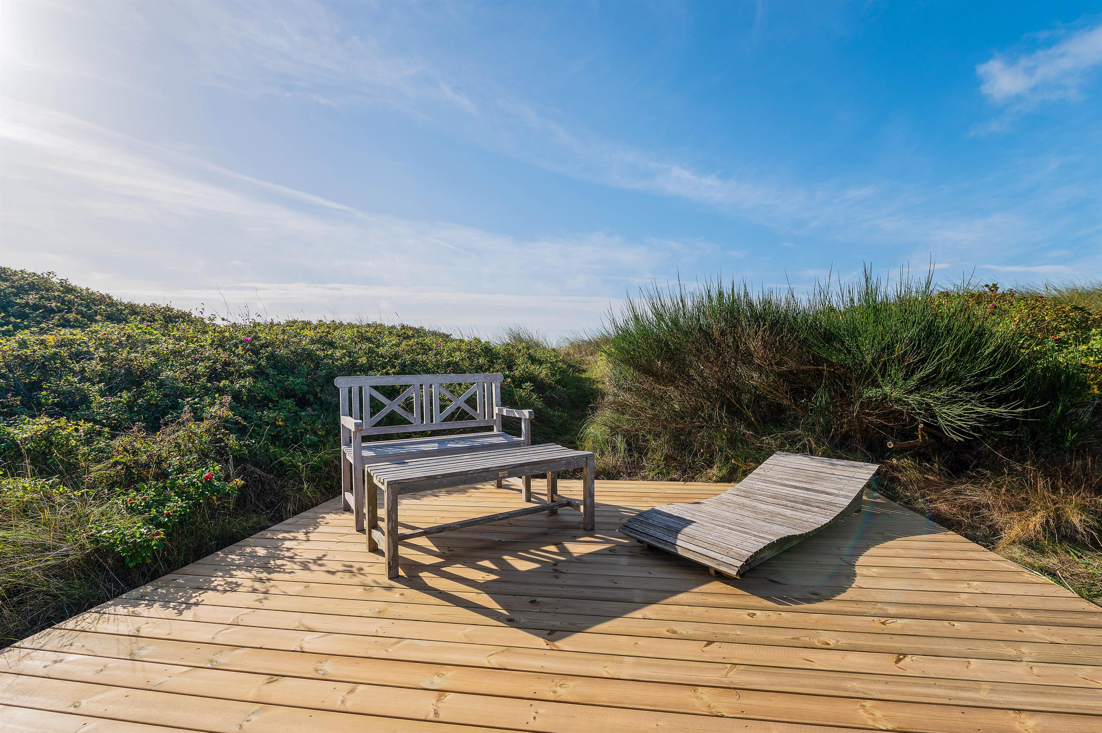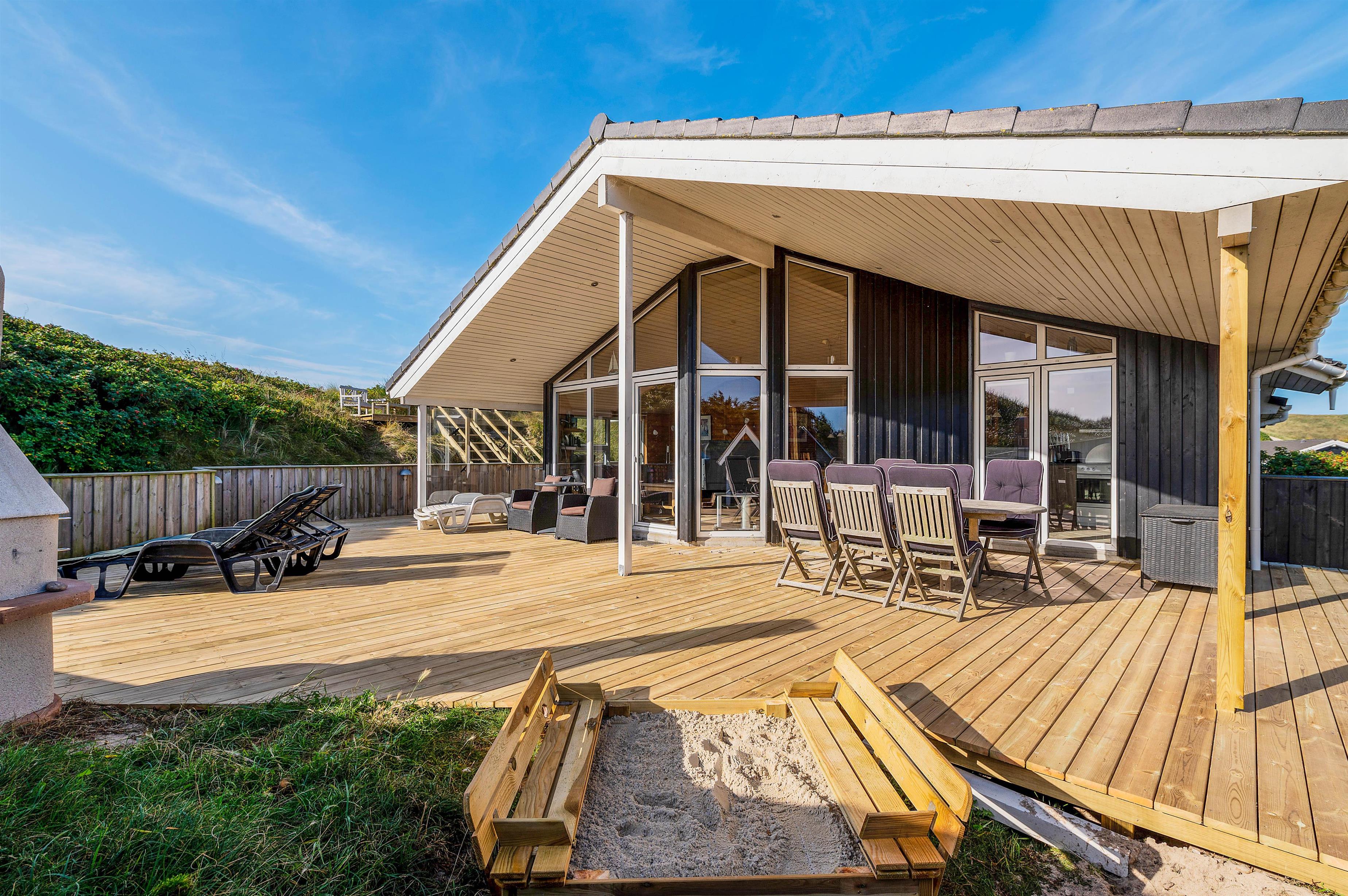 Udsigten til klitter og landskab er skøn mange steder fra dette hus og fra terrasserne. Den store terrasse rundt om huset, er lukket, delvist afskærmet og delvist overdækket, her kan I lade børn og kæledyr løbe frit rundt og udforske terrassen.