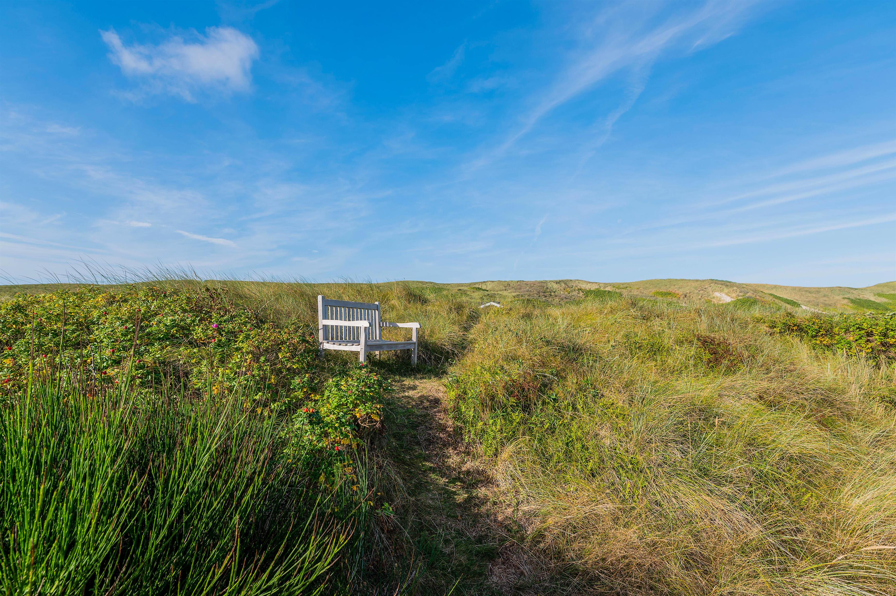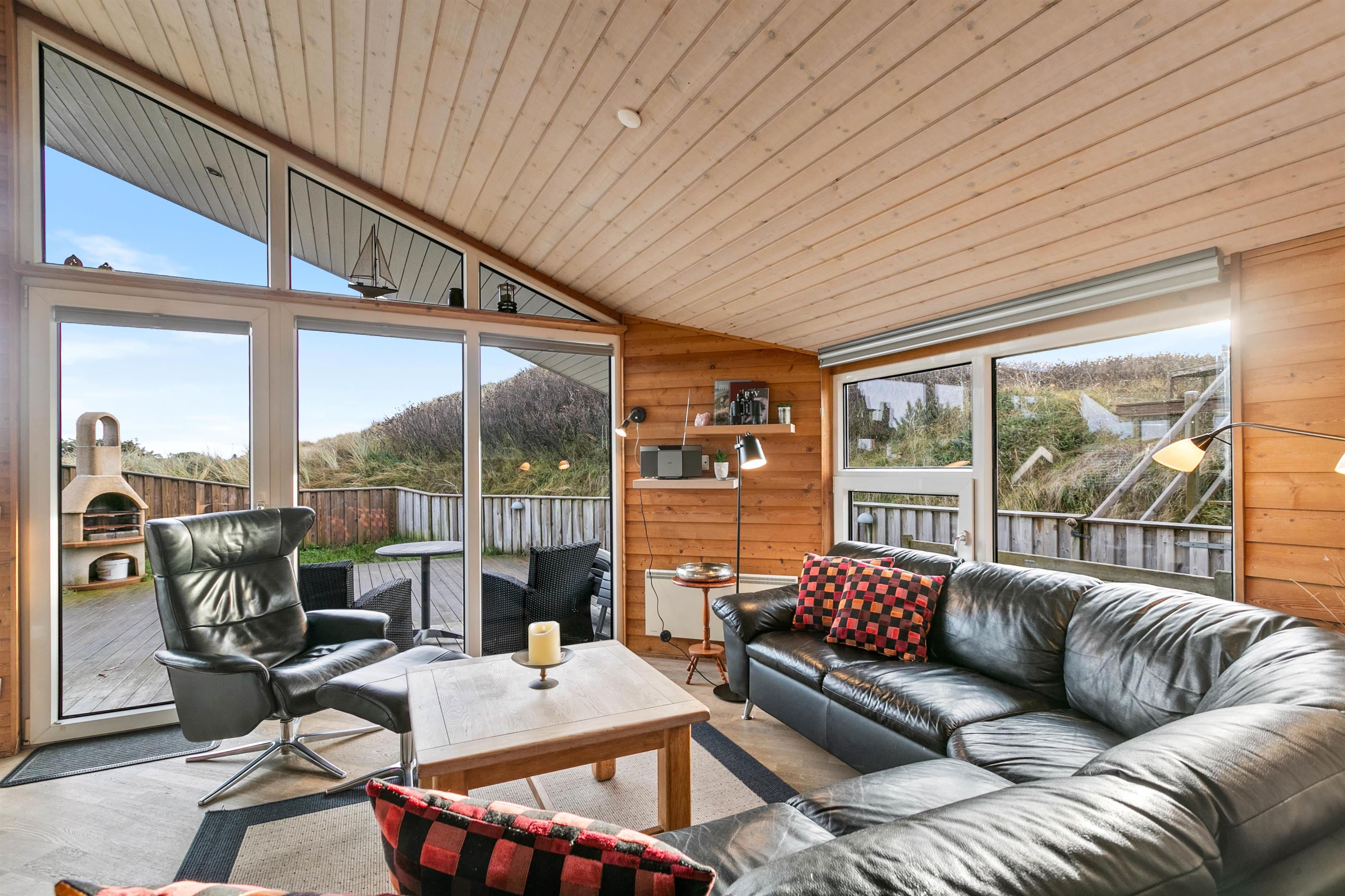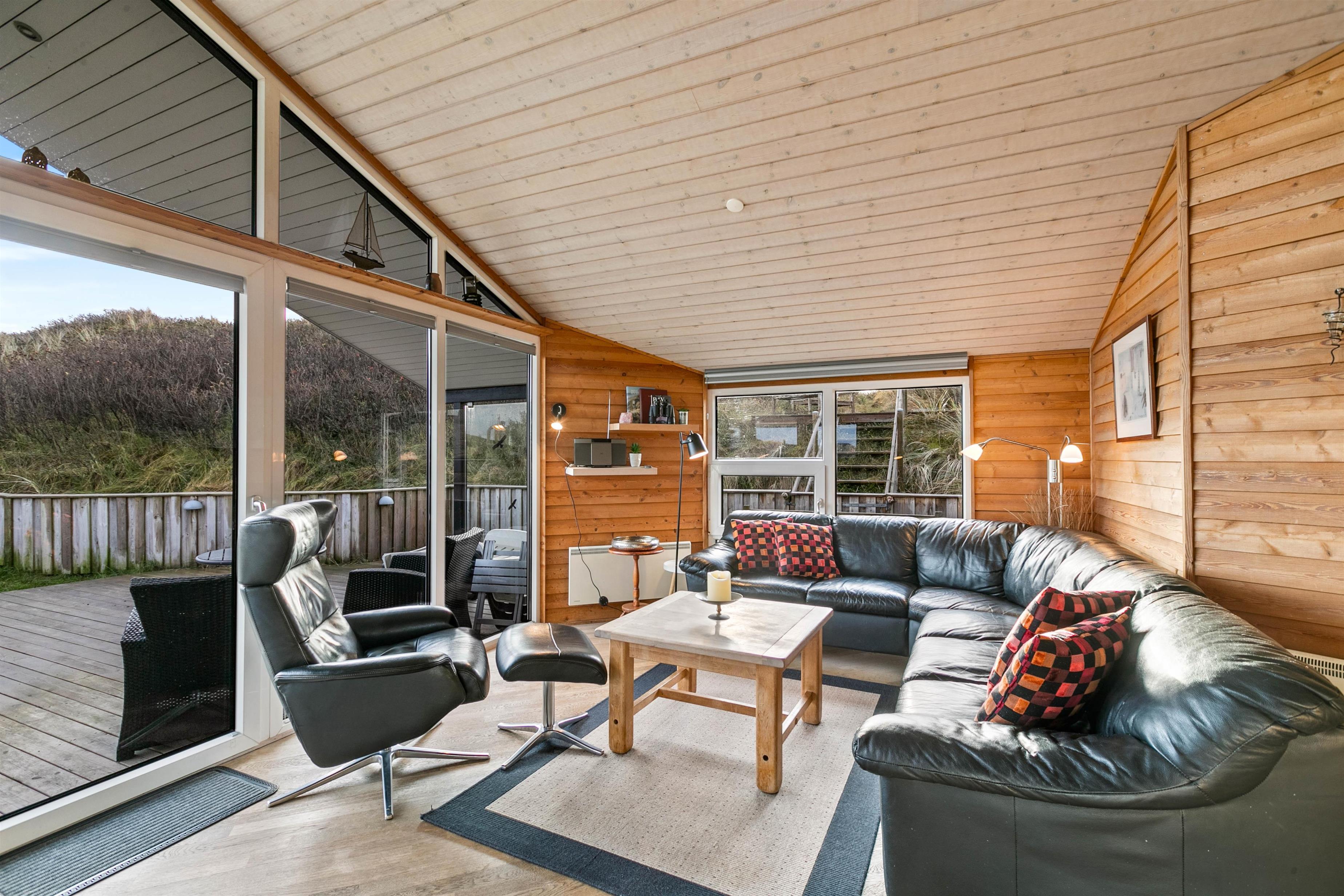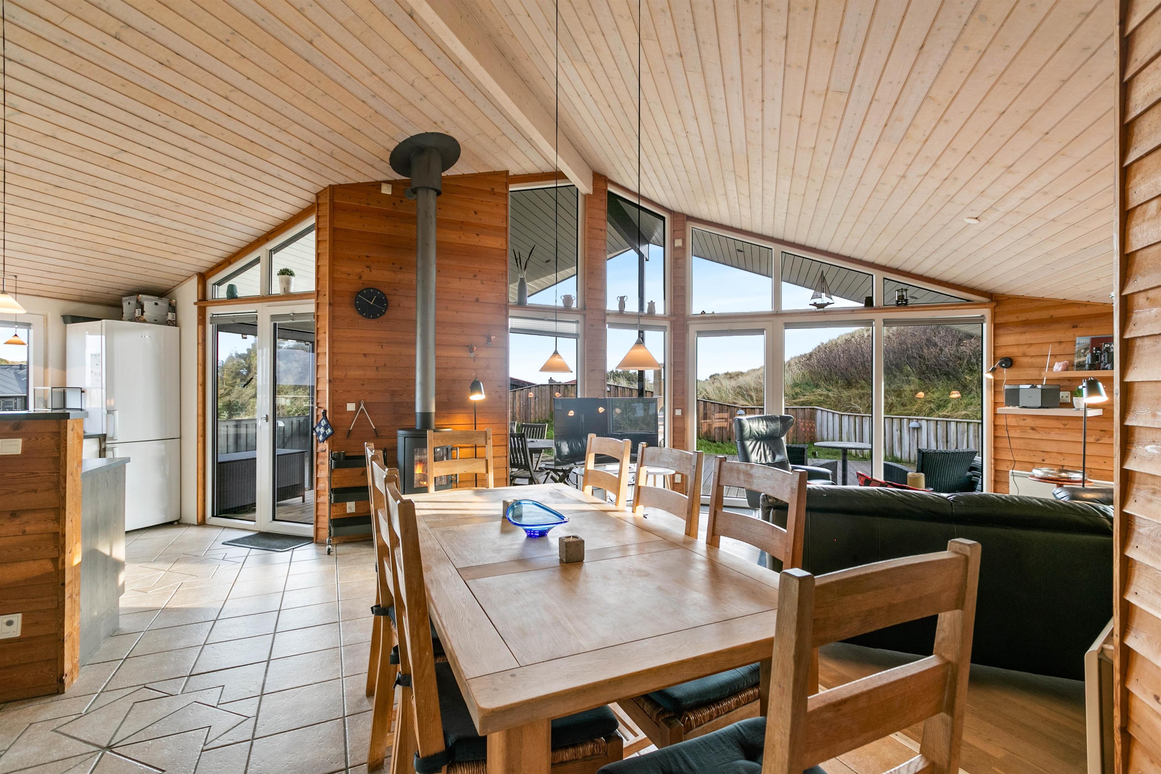 Udsigten til klitter og landskab er skøn mange steder fra dette hus og fra terrasserne. Den store terrasse rundt om huset, er lukket, delvist afskærmet og delvist overdækket, her kan I lade børn og kæledyr løbe frit rundt og udforske terrassen.