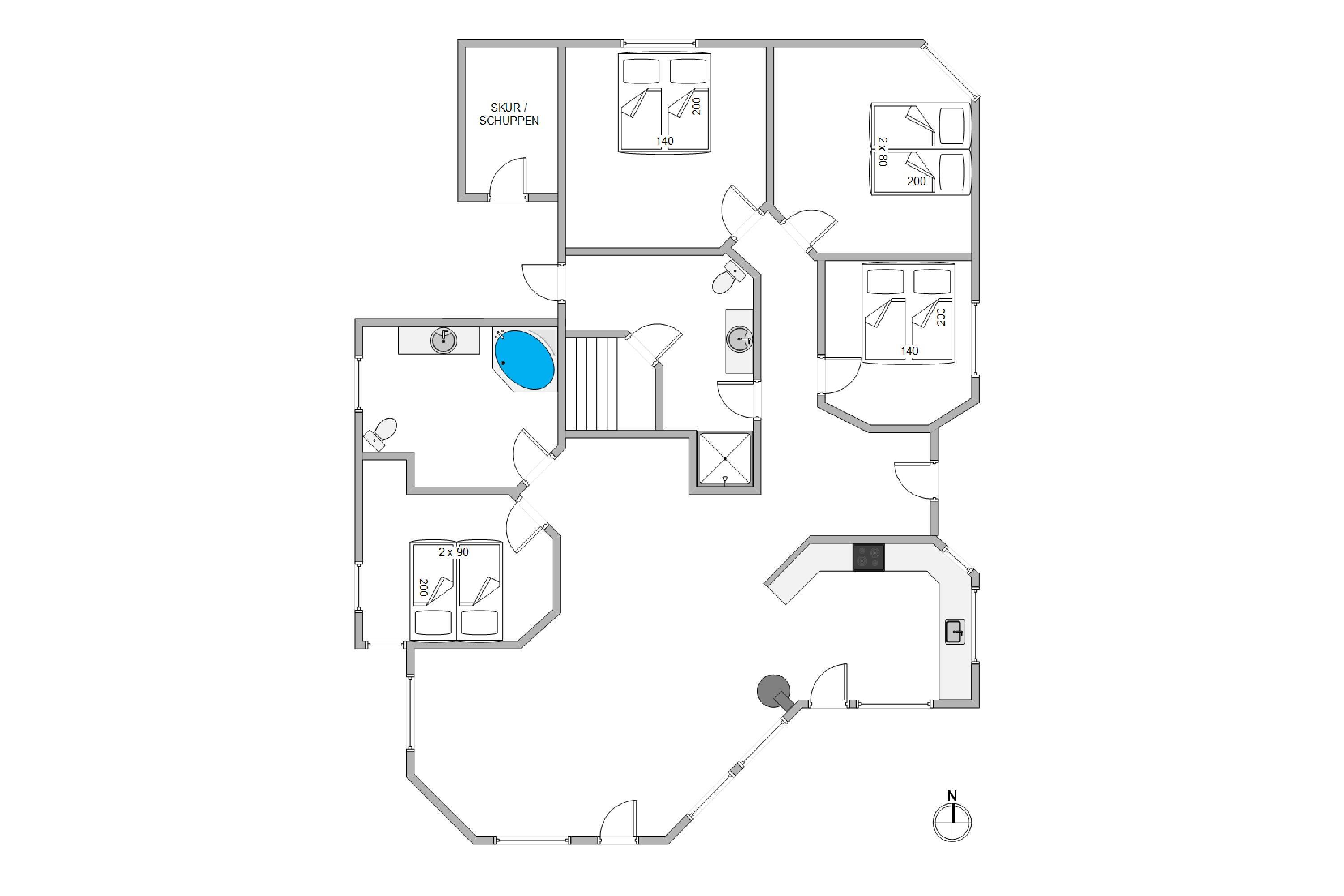 Højdepunktet i dette sommerhus er uden tvivl de to badeværelser. Her er der nemlig skrevet luksus med stor L. Her finder i saunaen og spabadet, som altid er en skøn måde at koble helt af, lade batterierne op og holde en rigtig god ferie. Begge badeværelserne er lyse og rummelige, her finder i også en vaskemaskine og tørretumbler, så I kan vaske børnene tøj efter en sjov dag med leg.
