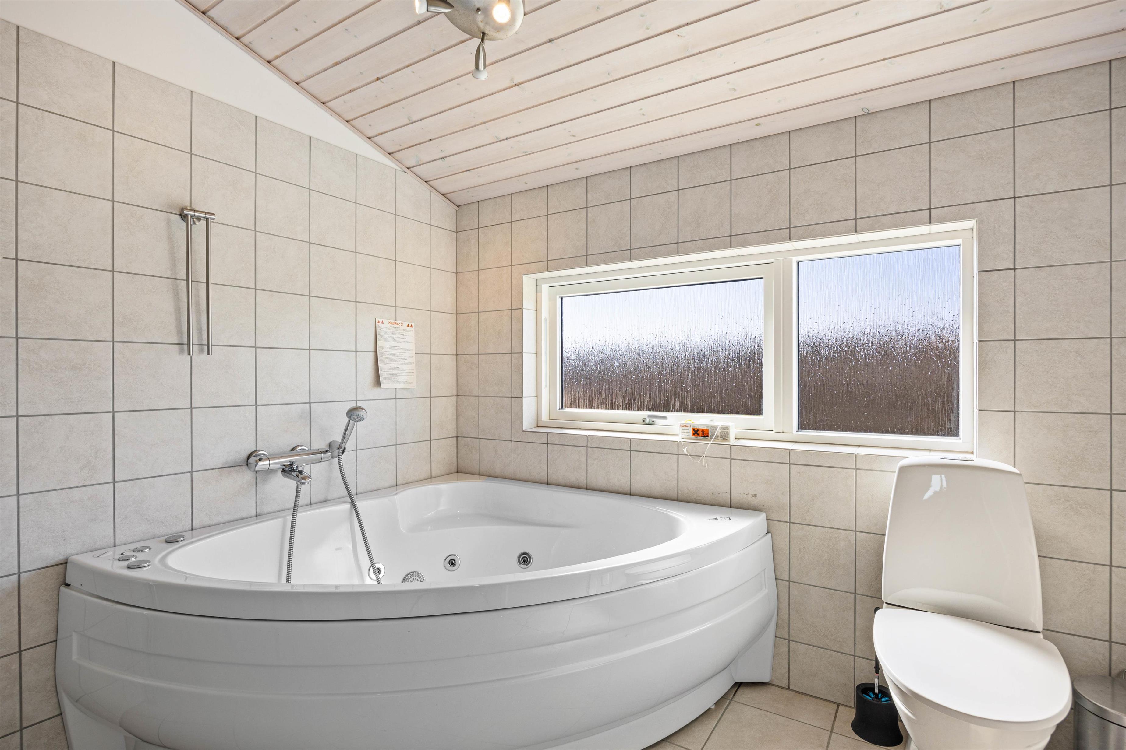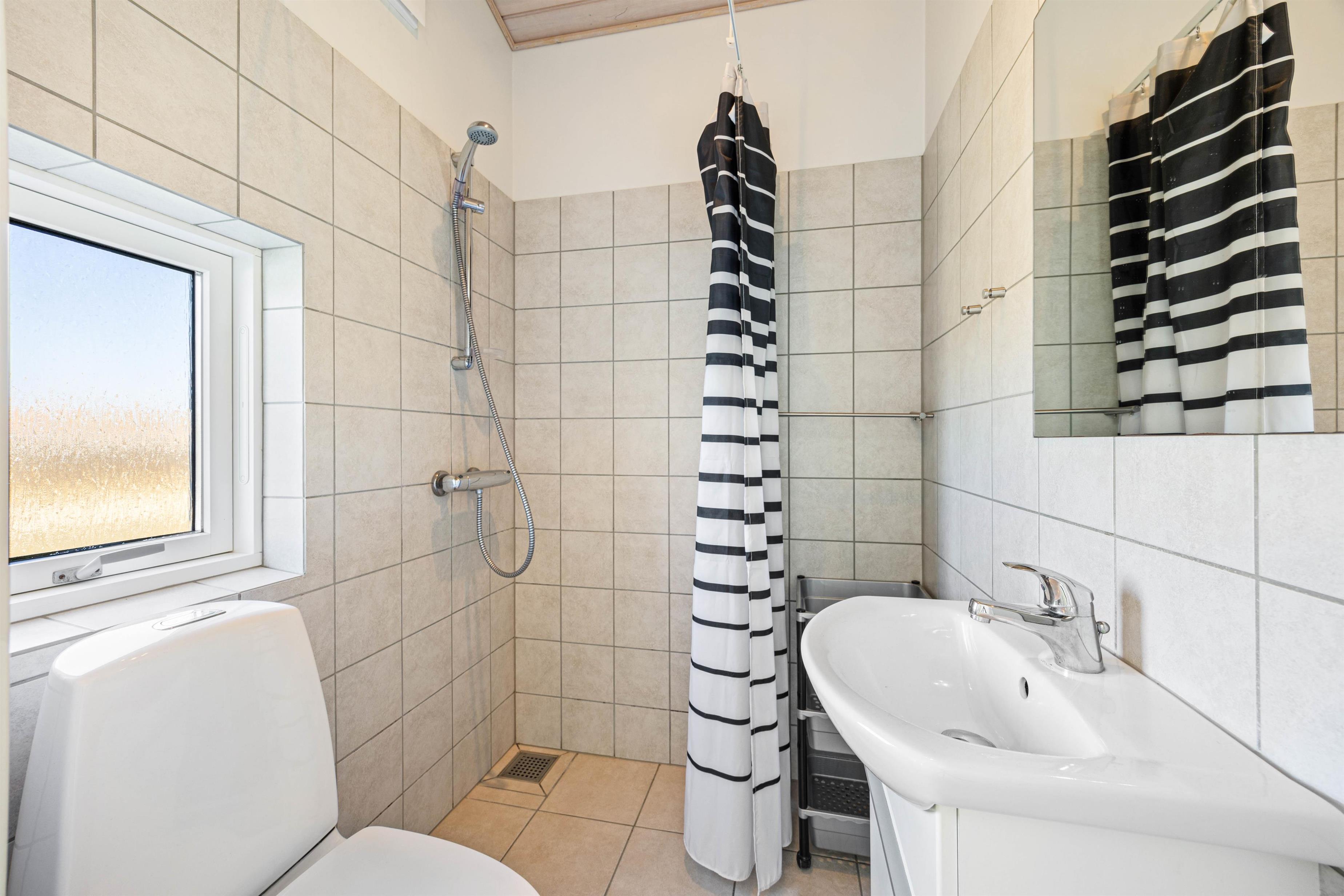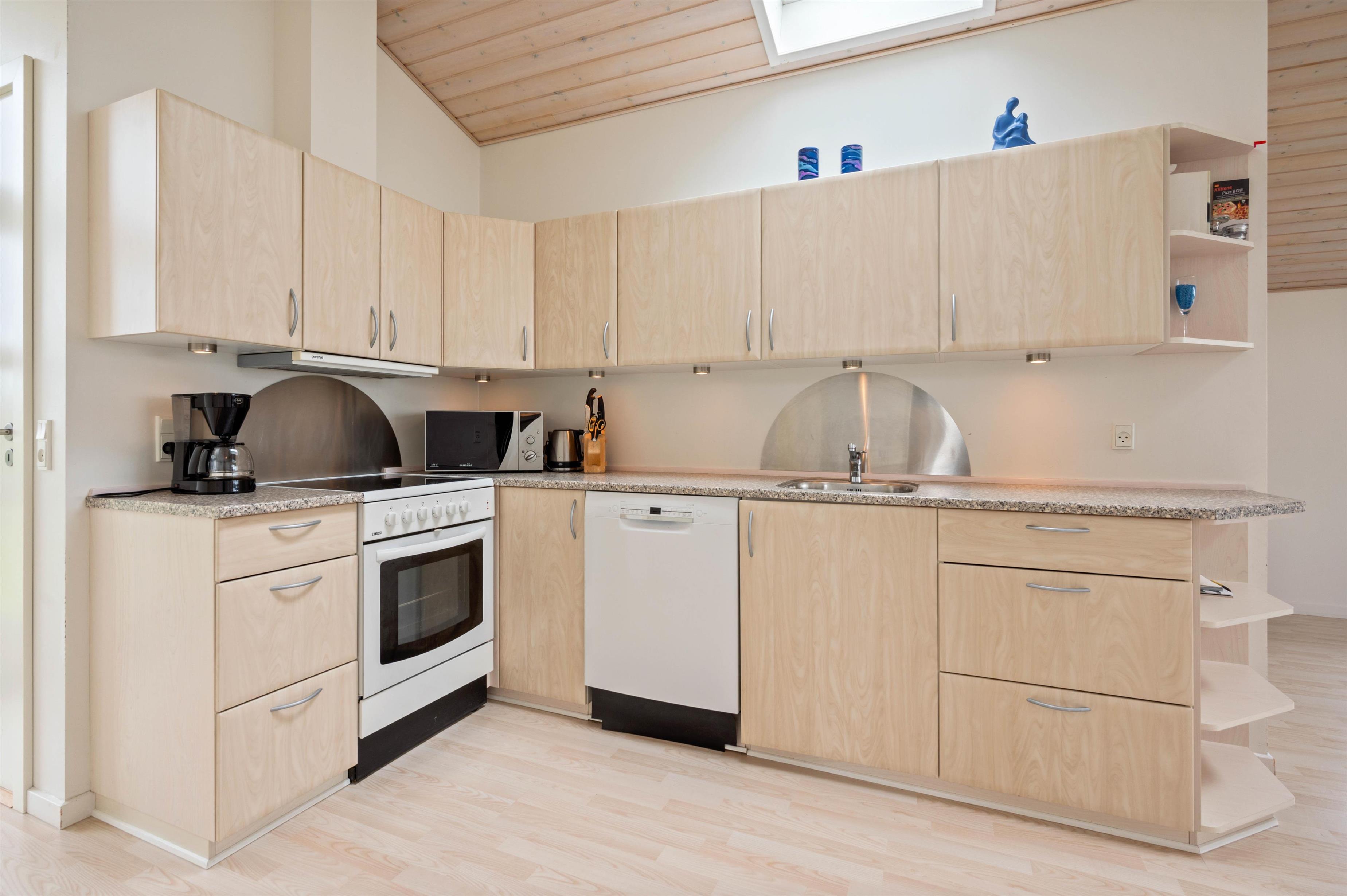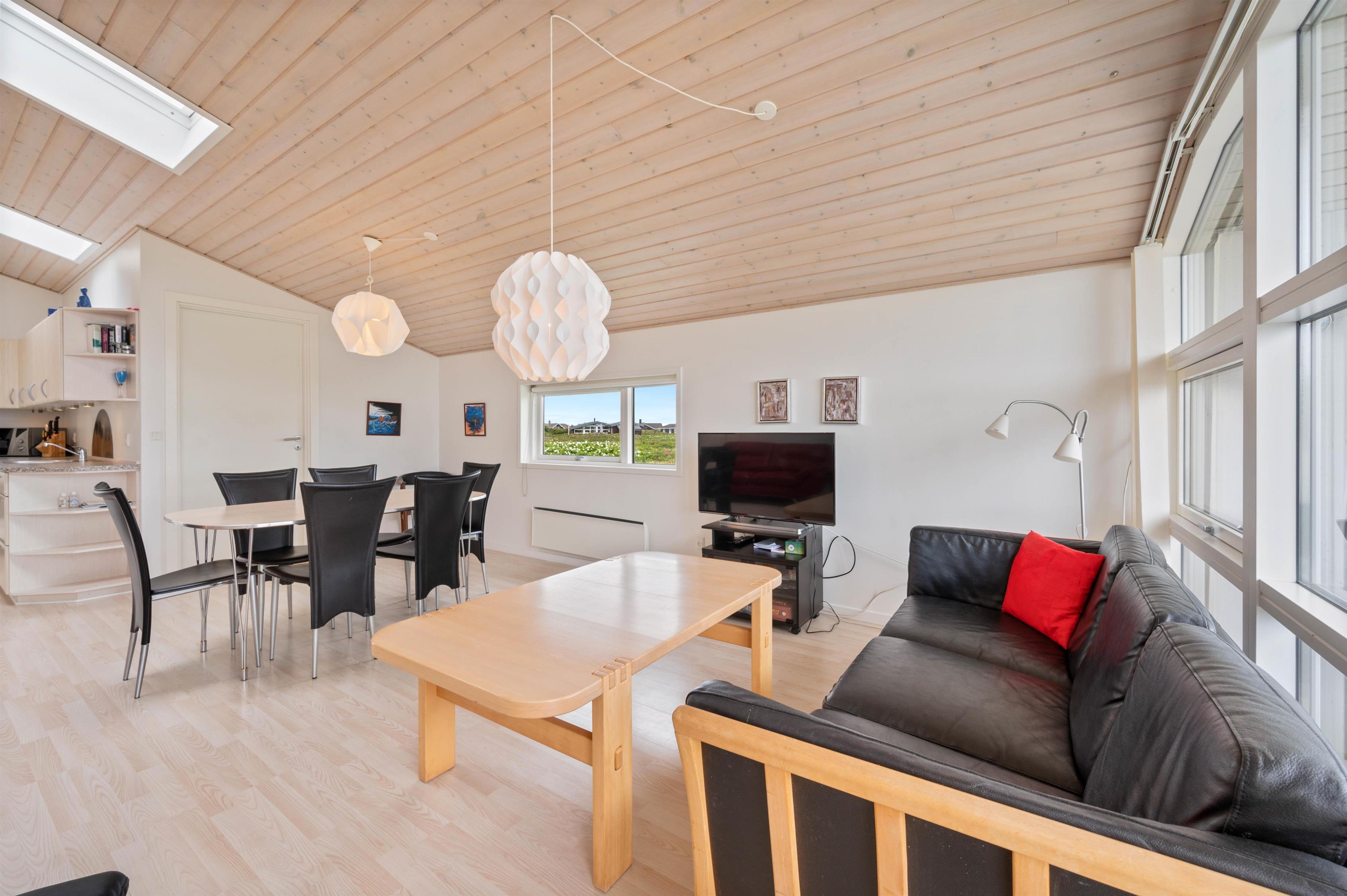 Sommerhuset er indrettet til i alt 6 personer, og har 3 gode soveværelser. 2 værelser med dobbeltsenge og et stort værelse med en køjeseng til ungerne og en sovesofa man kan trække ud. Alle værelserne har gulvtæppe. Du får 2 gode badeværelser, begge med bruseniche og gulvvarme. I det største badeværelse kan du slappe af i boblebadet efter en lang dag i naturen. Bryggers indrettet med vaskemaskine. Husets hjerte er det kombinerede køkken og opholdsrum. Her har arkitekten lagt vægt på at lukke naturen og lyset ind. Det veludstyrede køkken har opvaskemaskine og mikroovn og står i åben forbindelse med stuen. Her er pænt indrettet med gode og komfortable møbler, fladskærm og DVD. Der er trægulv i hele rummet. Fra stuen er der udgang til den dejlige afskærmede og delvist overdækkede terrasse. Terrassen er udstyret med havemøbler, liggestole og grill.