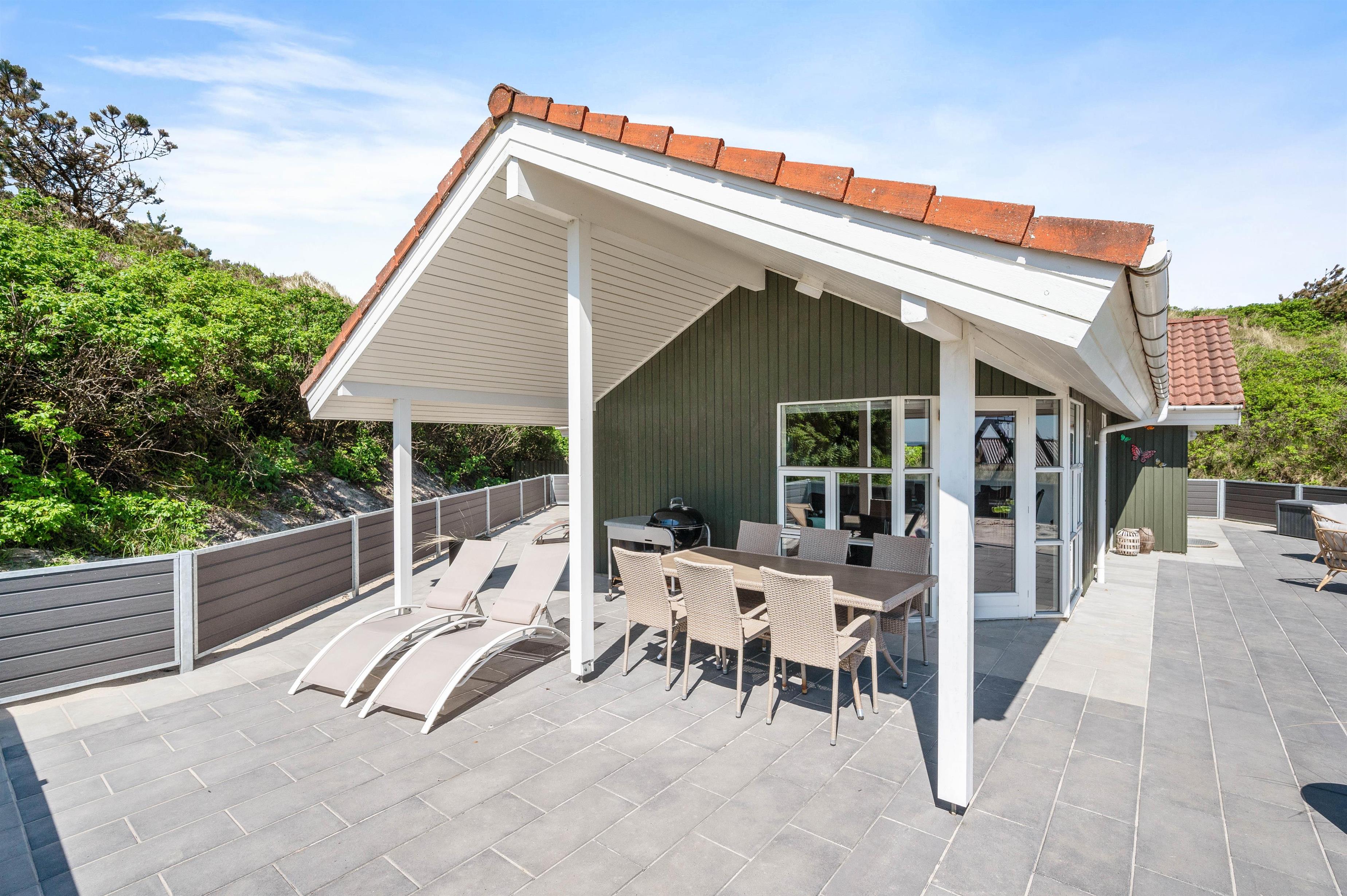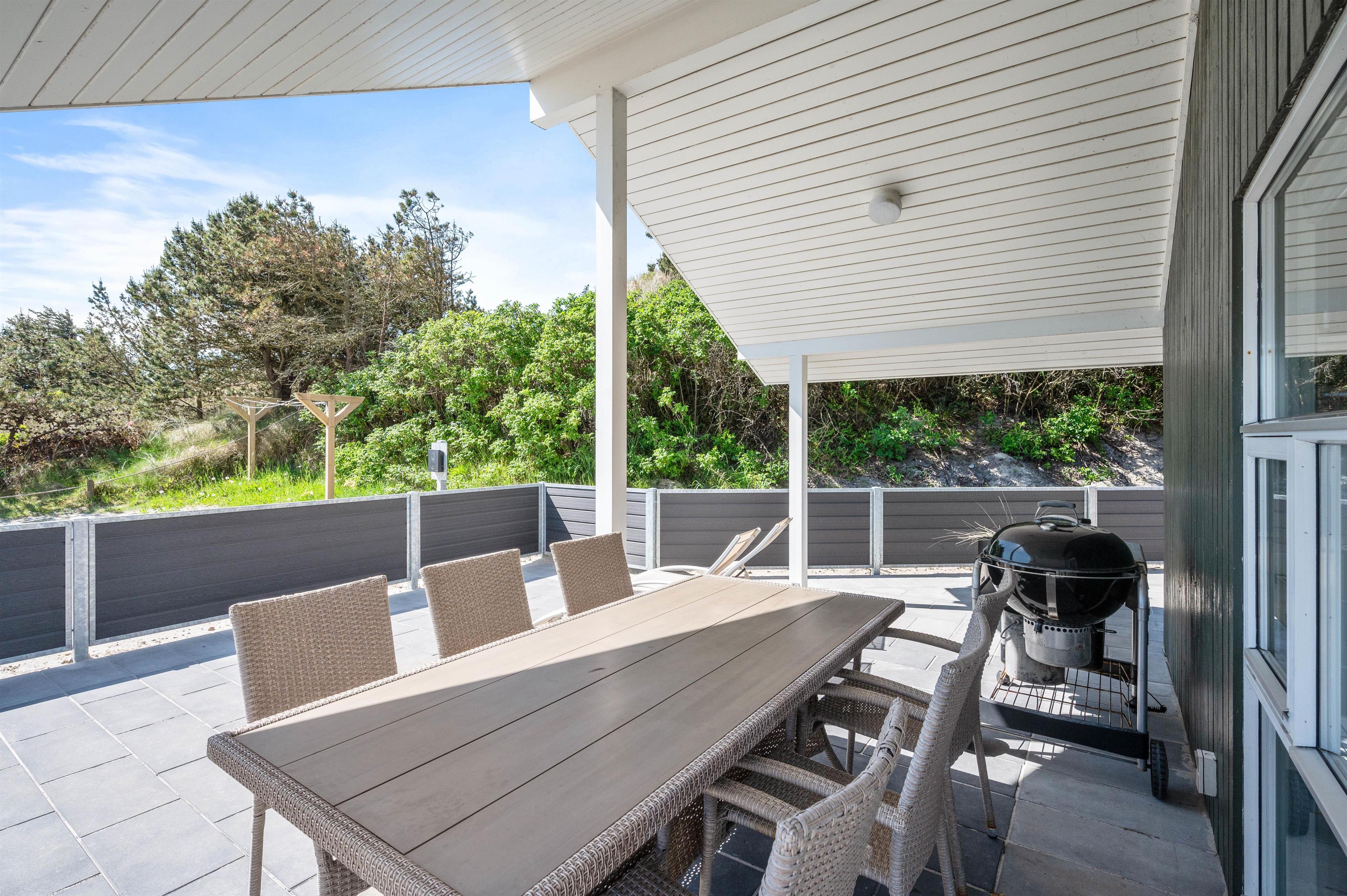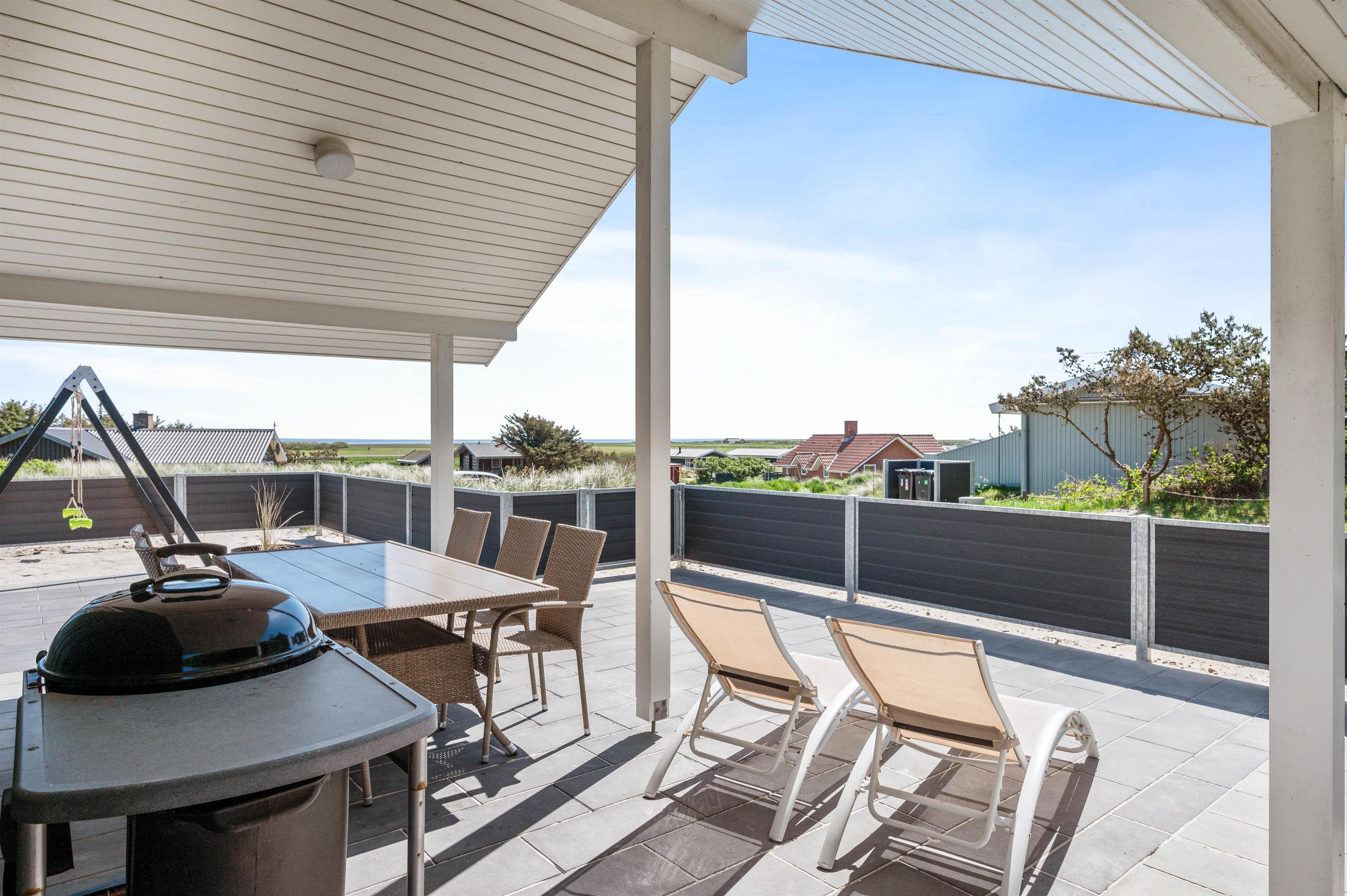 Den lukkede og delvist overdækket terrasse ligger afskærmet af klitterne, hvilket vil sige, at I kan nyde terrassen, selvom der er en smule vind.