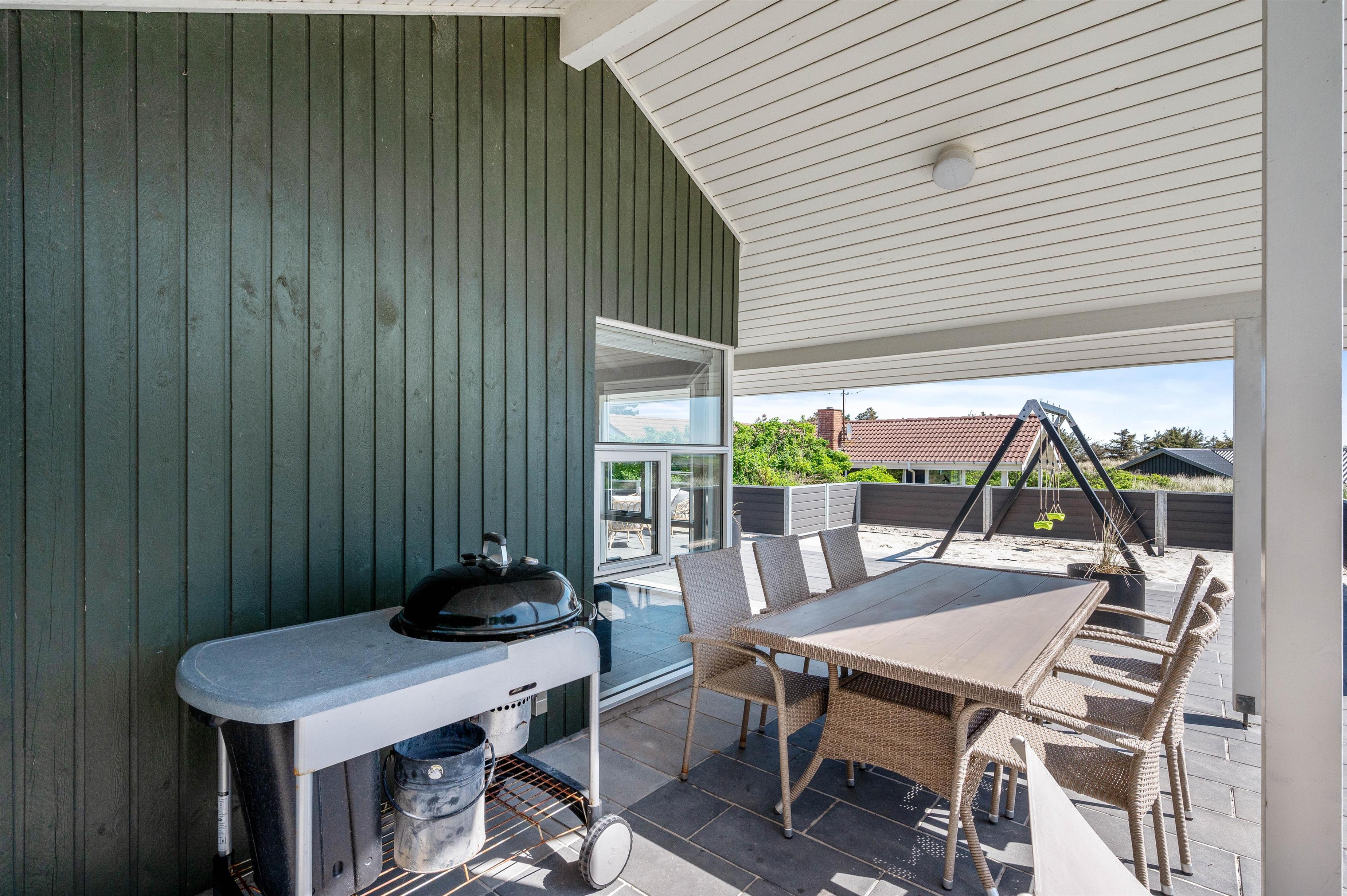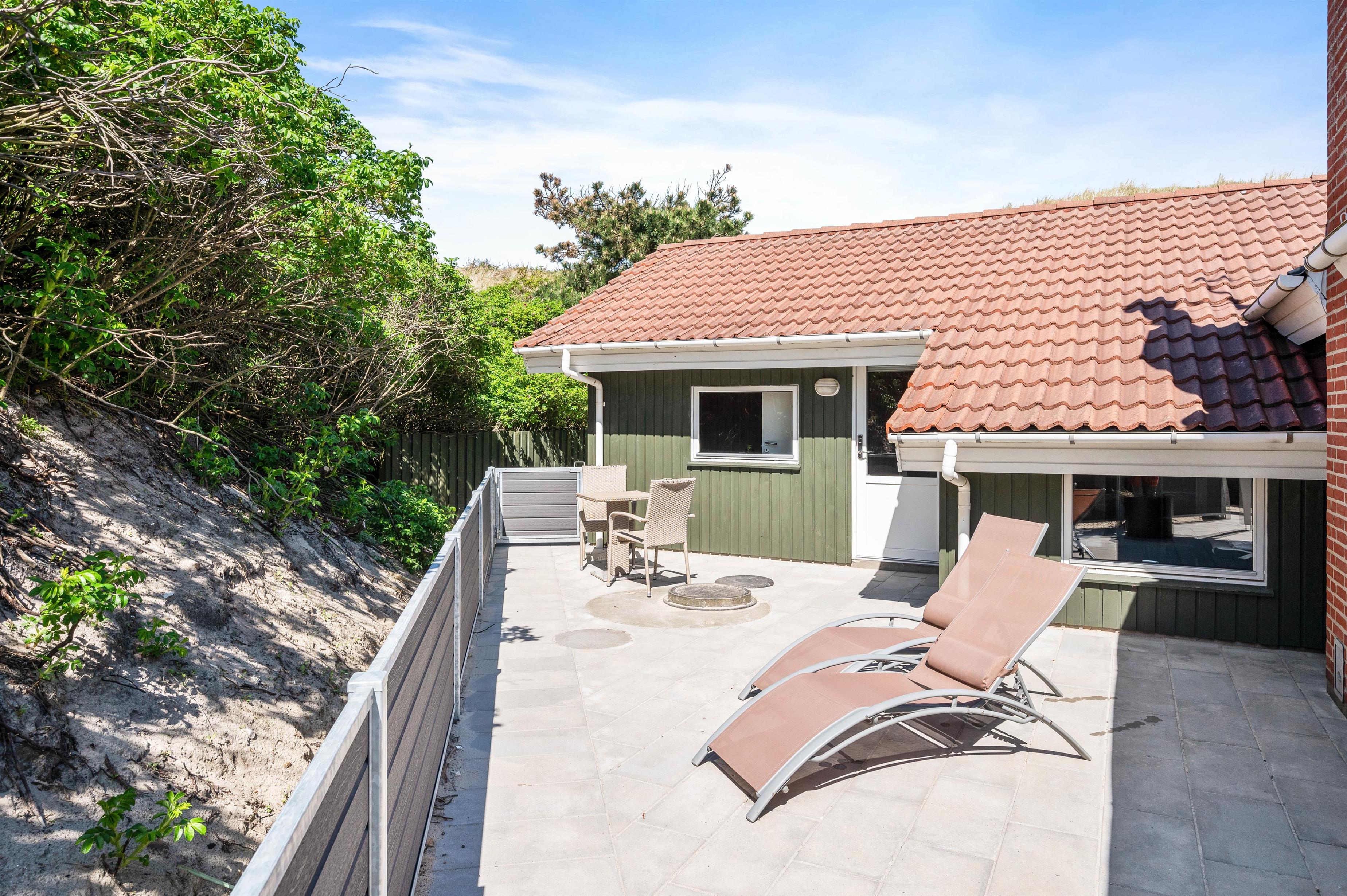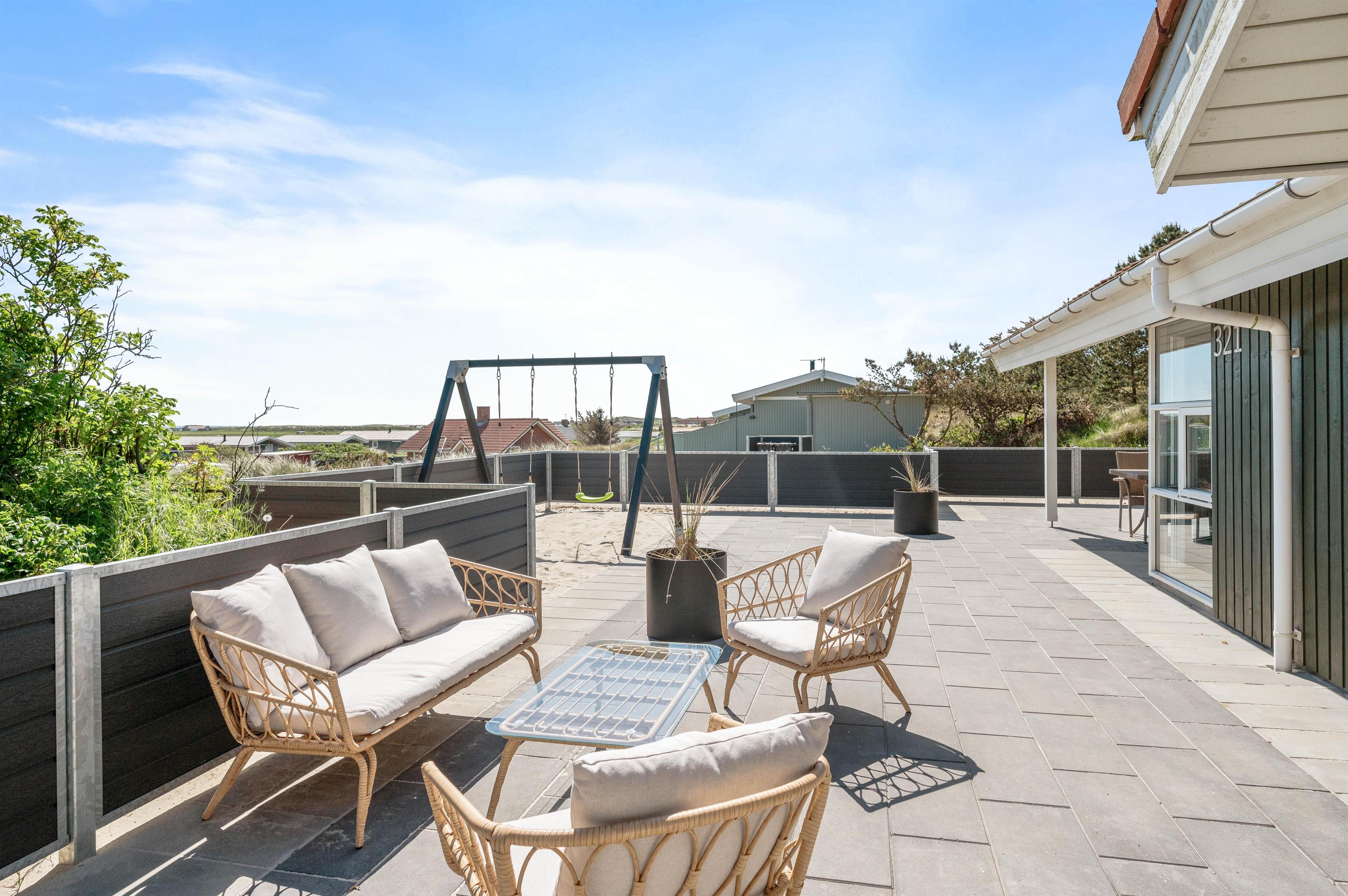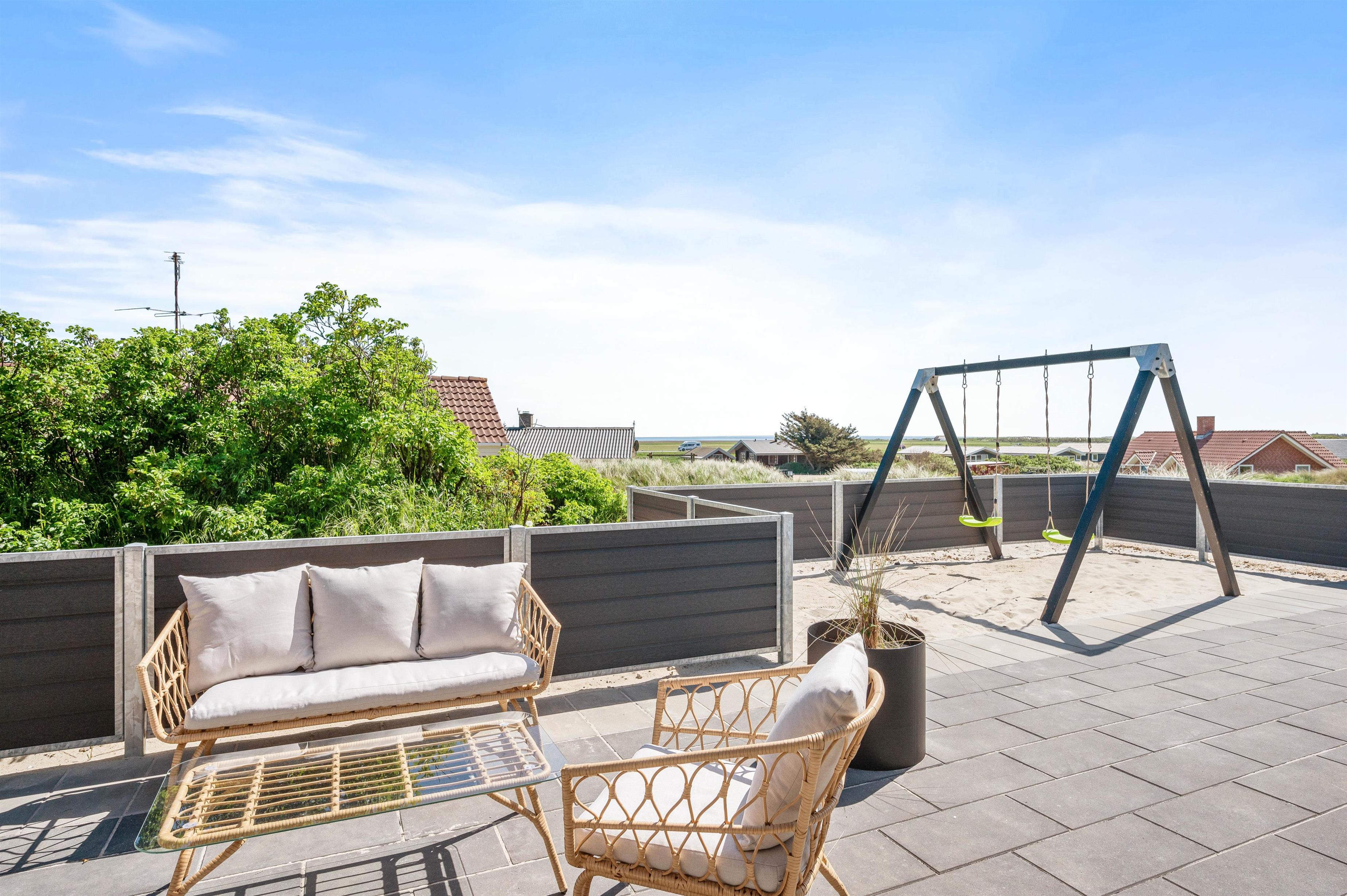 Den lukkede og delvist overdækket terrasse ligger afskærmet af klitterne, hvilket vil sige, at I kan nyde terrassen, selvom der er en smule vind.